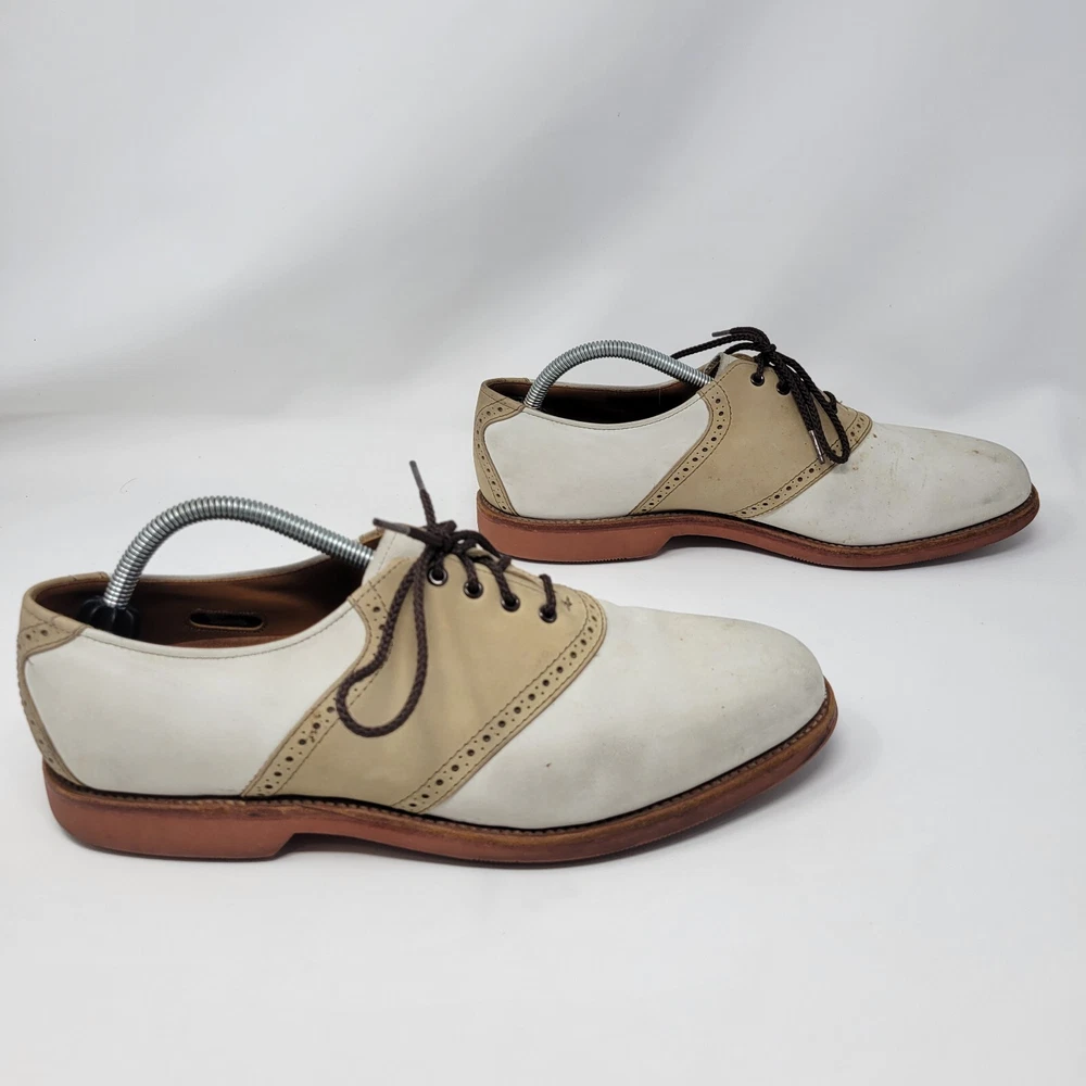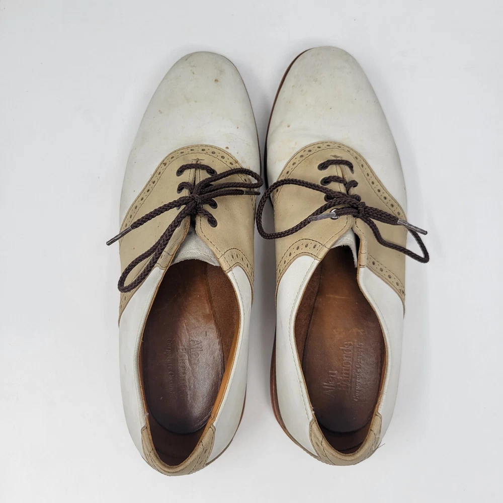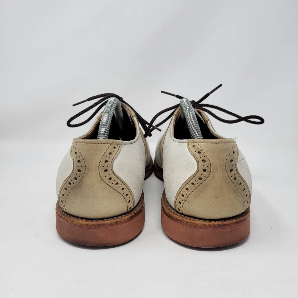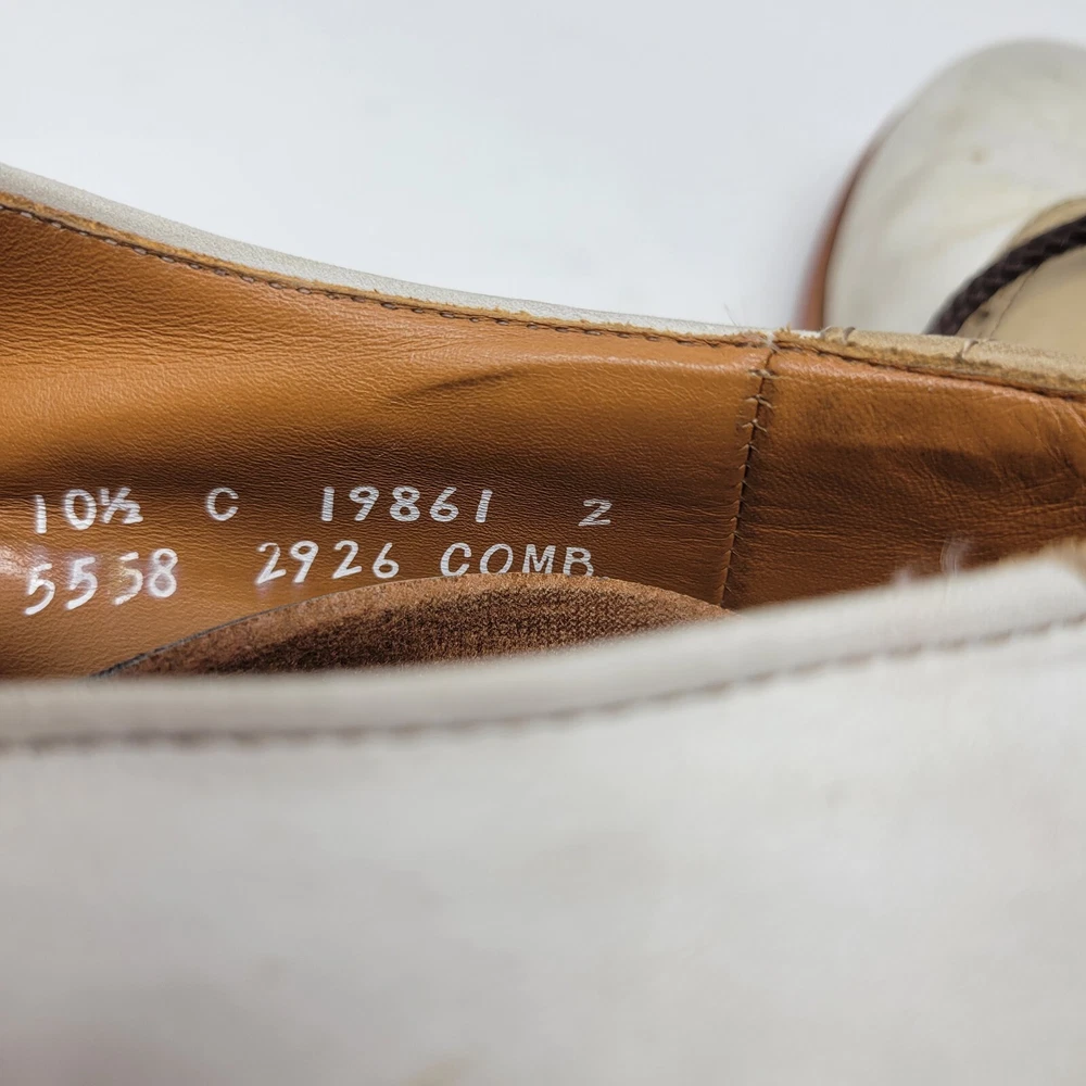 Elevate your style with these Allen Edmonds men's dress shoes. Crafted from premium beige and tan leather, these Oxford lace-up shoes feature an almond toe and colorblock pattern with the brand's iconic logo accents. The adjustable straps and Vibram gumlite outsole provide comfort and performance, making them perfect for any occasion. These shoes are tailored for a classic look with a preppy city vibe and are suitable for winter, summer, fall, and spring. They are available in US size 10.5 and UK size 10, with a C shoe width. The lining, insole, and outsole are made of leather, ensuring durability and quality. Add a touch of sophistication to your wardrobe with these timeless Allen Edmonds saddle shoes. These shoes are in excellent “pre owned” condition. For more information, please see photos or feel free to contact me with any questions. All orders are shipped within 24 hours of payment received.