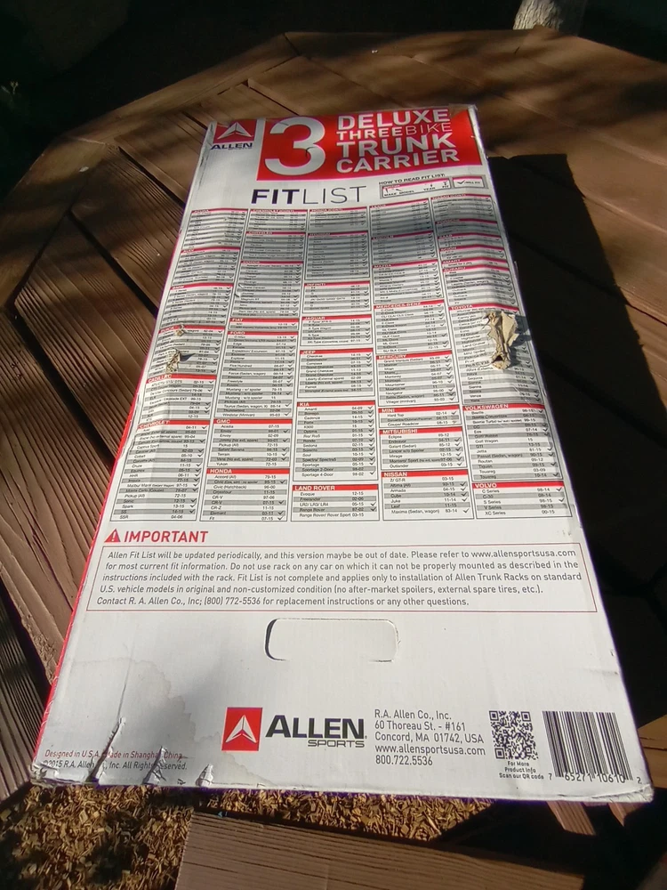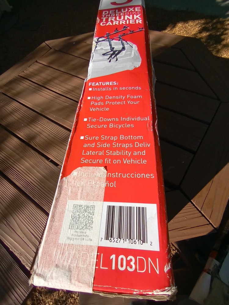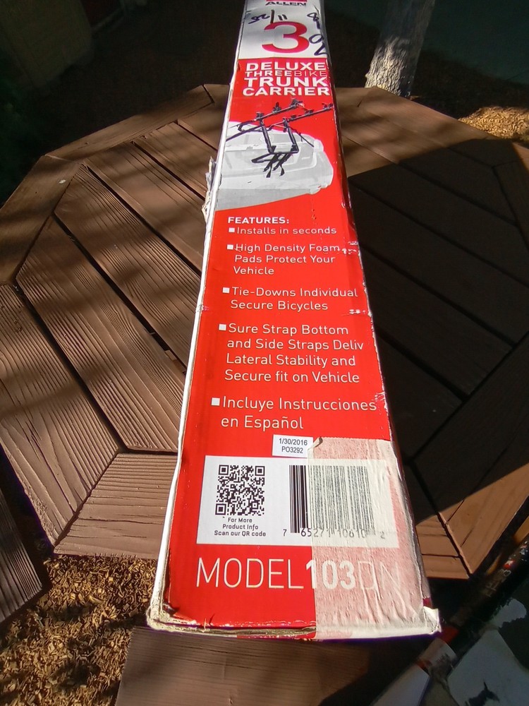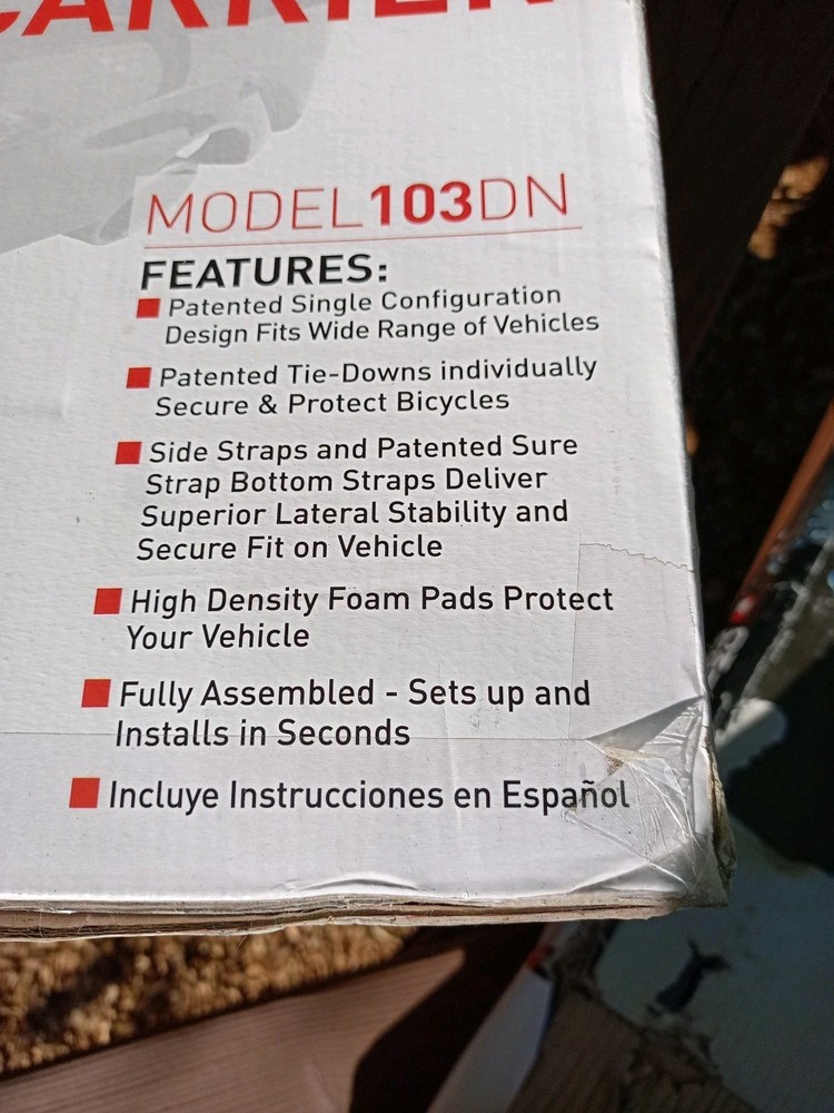 Deluxe Model 103DN 3 Bike Trunk Carrier New Open Box Box is Damaged. SHIPPING We Primarily Ship Using Recycled Packaging Materials. Occasionally We May Change the Method of Shipping. If You Need an Item Shipped by a Certain Carrier, Please Let Us Know Before You Place the Order. Batteries are not included. All Measurements are Approximate. RETURNS If the item is not completely satisfactory, we offer a 30-day return guarantee. Just open a return authorization through eBay and return the item. For New items that are Sealed and have been Opened a Partial Refund is Offered. Happy eBaying!