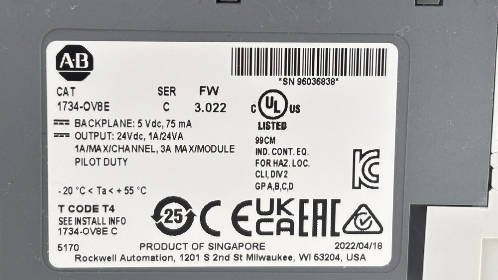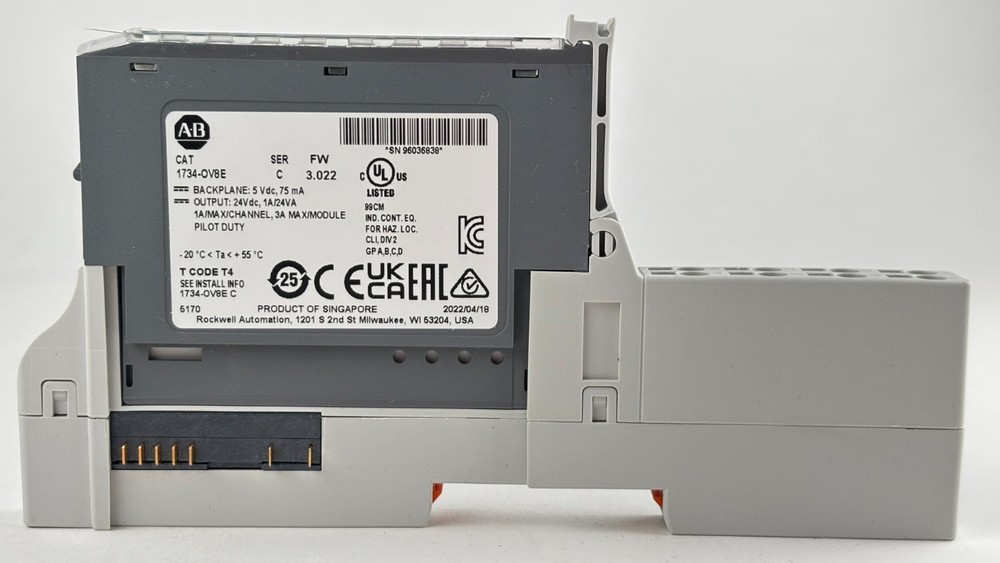 Country of Origin: Singapore Seller Notes: “Pulled from a working environment” Type: PLC Output Module Brand: Allen-Bradley Analog/Digital: Digital MPN: 1734-OV8E Controller Platform: ControlLogix Model: 1734-OV8E