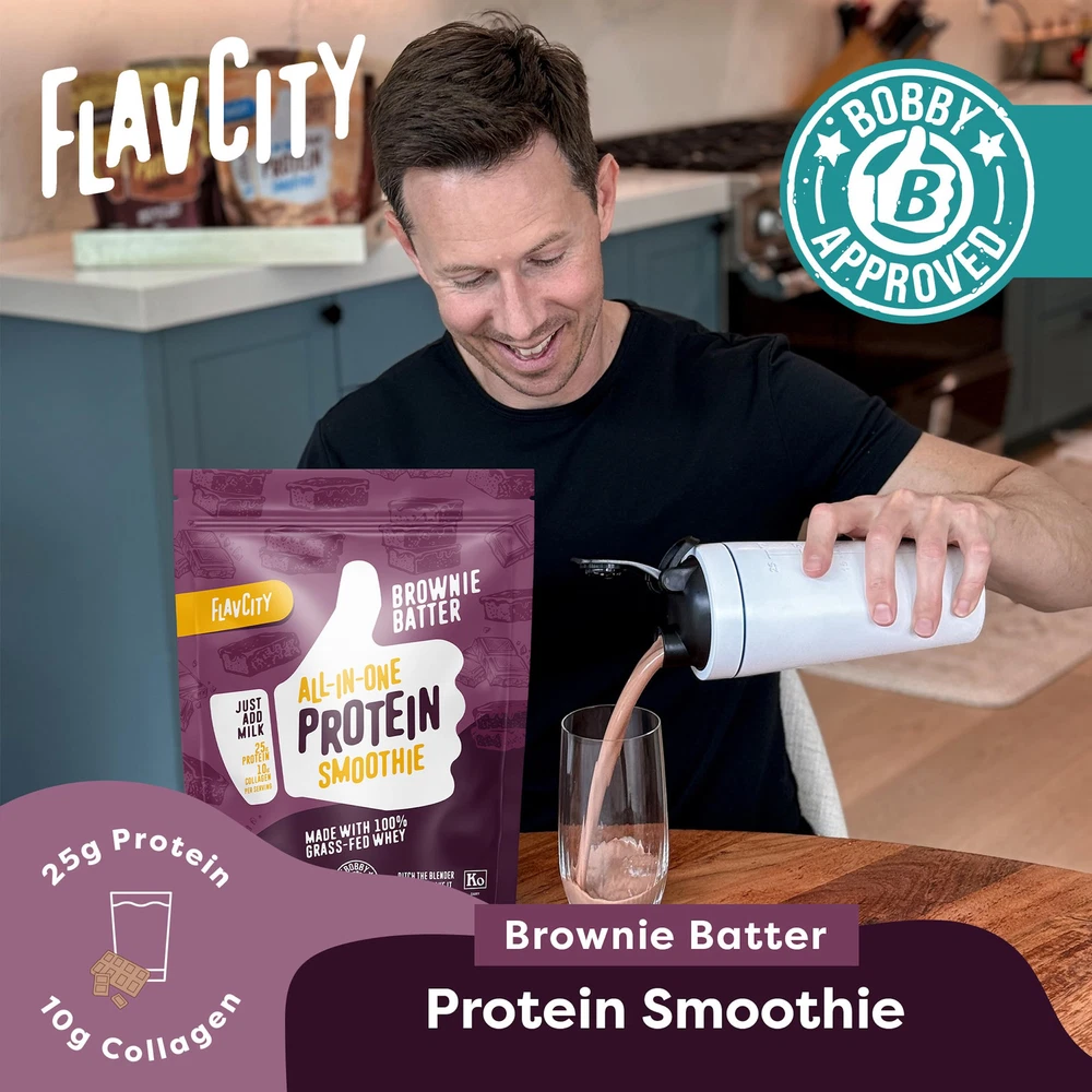 DITCH THE BLENDER: Brownie lovers everywhere can indulge in ’s Brownie Batter Protein Smoothie, a delicious and nutrient-dense blend of real organic cocoa and non-GMO buttermilk that gives it an outrageously silky texture. We’ve simplified the smoothie-making process by incorporating all the high-quality ingredients you love in each scoop — no add-ins needed! With 25g of protein per serving, our complete protein smoothies are sure to be your new go-to post-workout beverage or snack. TOTAL BODY NOURISHMENT: Formulated with non-GMO, minimally processed, and grass-fed, undenatured whey protein, collagen, and added amino acids. Grass-fed bovine collagen peptides (10g per serving) provide extra protein and joint support. Reishi and Cordyceps mushrooms can help increase focus and cognition. JUST SCOOP: We want to make nutrition work for those with busy lifestyles, so we developed Protein Smoothies that are easy to make. Just add scoop of your favorite flavor to 12 oz of your milk of choice, shake for 20 seconds, and enjoy. I’D SCOOP THAT: Feel good about what you put in your body. Our Protein Smoothies are derived from delicious whole foods designed to enhance your journey. Each ingredient has been thoroughly researched and every product has passed stringent quality control measures to provide you with peace of mind. If it’s “Bobby Approved,” you know you’re in good hands. ABOUT US: Since 2012, Bobby Parrish has amassed a following of more than 12 million community members by creating online food and wellness content and authoring popular cookbooks. His mission is to help people know exactly what they put in their bodies so they can thrive.