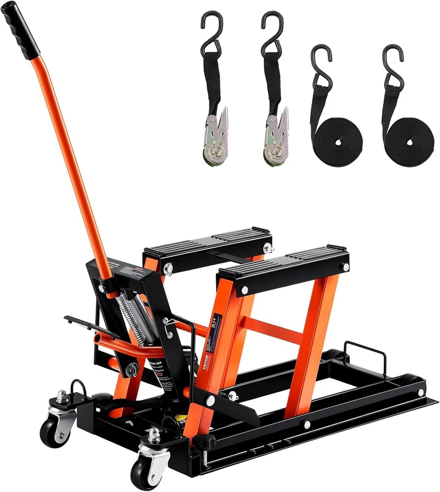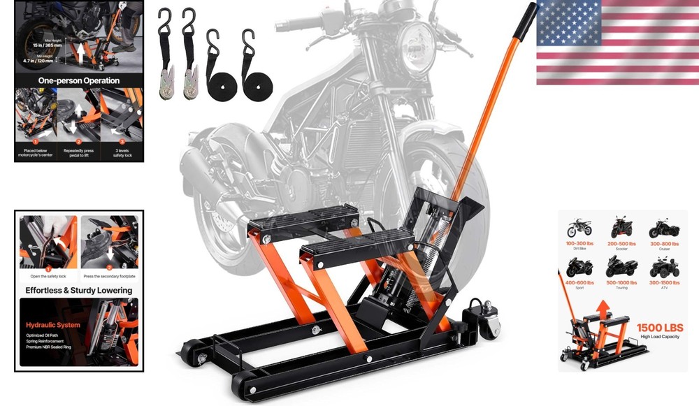 Capacity per Stand: 1500lbs. Vehicle Service Type: Motorcycle Load Capacity: 1500 Pounds UPC: Motorcycle Lift Jack Style Name: With Casters Included Components: 1 X Hydraulic Motorcycle Lift, 2 X Ratchet Belt Manufacturer Part Number: Motorcycle Lift Jack Color: Orange Material: Alloy Steel Material Type: Alloy Steel Country of Origin: China Set or Single Item: Single Item Brand: Unbranded Maximum Lifting Height: 15 Inches Number of Pieces: 1 Type: Scissor Jack gtin13: Motorcycle Lift Jack Item Dimensions: 33.1 X 16.1 X 4.7 Inches Compatible With Vehicle Type: Motorcycle Item Weight: 58 Pounds Drive: Hydraulic Item Type Name: Portable Motorcycle Lift Table