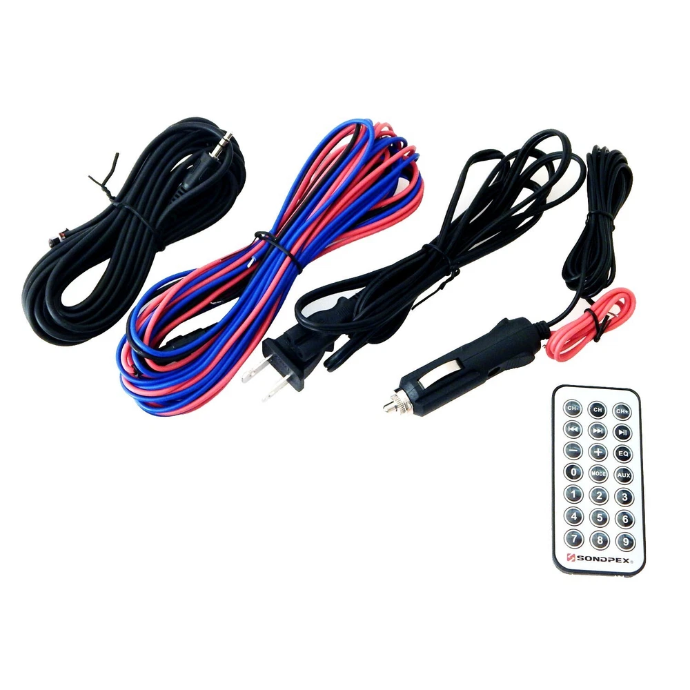 CSF-E65B The most ingenious sound system we've ever seen! It's perfect for picnics, outdoor parties, the beach & more. Plus it will blow you away with 200 watts of raw power. The Bluetooth function allows you play music from any Bluetooth enabled digital player or smart phone wirelessly. It has an FM digital tuner plus AUX inputs so you can listen to tunes from your iPod, MP3 player, CD player and more! You can download MP3 music into USB Flash Drive or SD card; then play music by insert it to USB or SD slots. Features LED display, RCA inputs/outputs, AUX input, AC/DC operation, 6-1/2" woofer and super 3" tweeter. Comes with remote with IR cable for operating from your dashboard, 3.5mm stereo audio cable and 12V power kit included. 6.5” woofer with paper cone foam edge, Super 3" tweeter and built-in amplifier with 200W Max output power Bluetooth function allows playing music wirelessly SD/MMC card and USB Reader; can play MP3 music directly from storage devices AUX-in port allows for a wired connection with other portable devices, such as MP3 player, iPod, iPhone and other cell phones Built-in FM Radio Receiver with auto scan and memory function with RCA cable input and output terminal (RCA cables not included) Dual Power: 110V AC and 12V DC / USB port with 5V/2A power to charge any cell phones or tablets Remote control and 12V power cable wiring kit with cigarette adapter