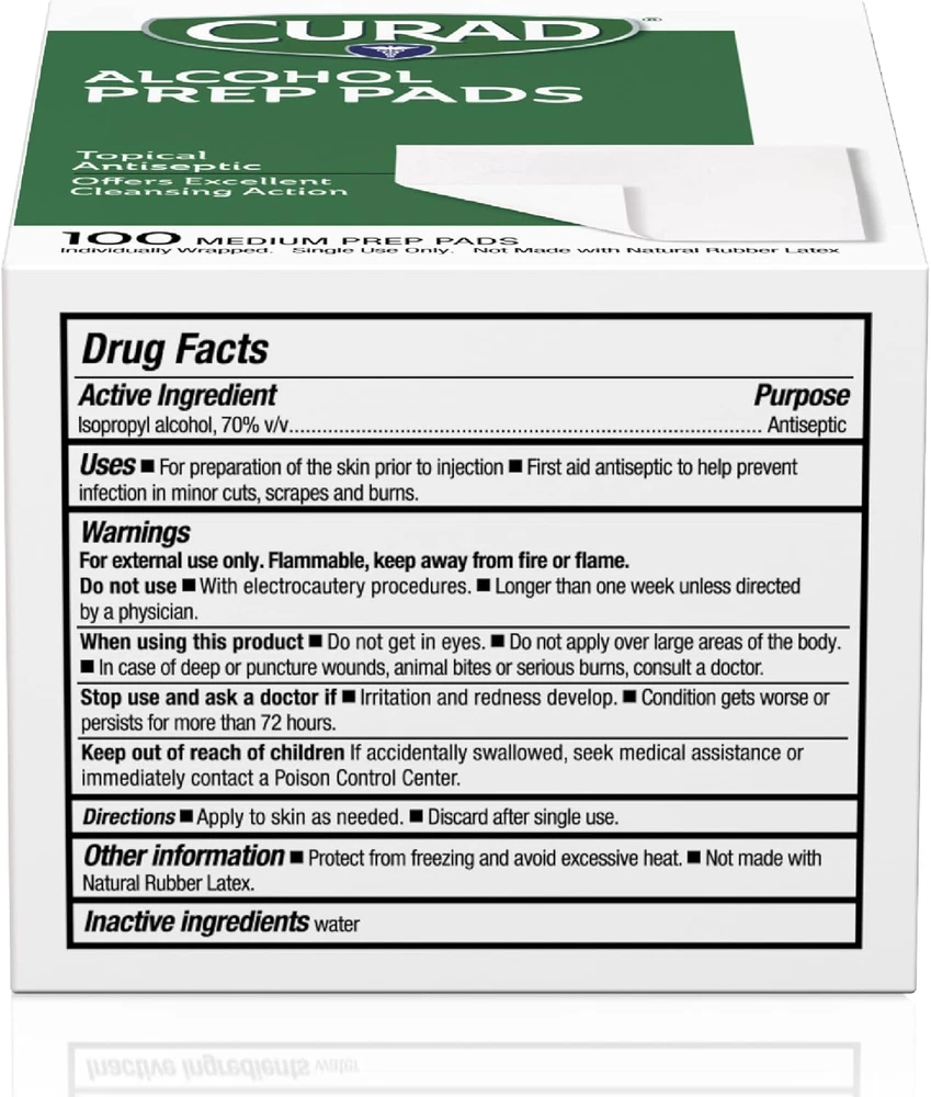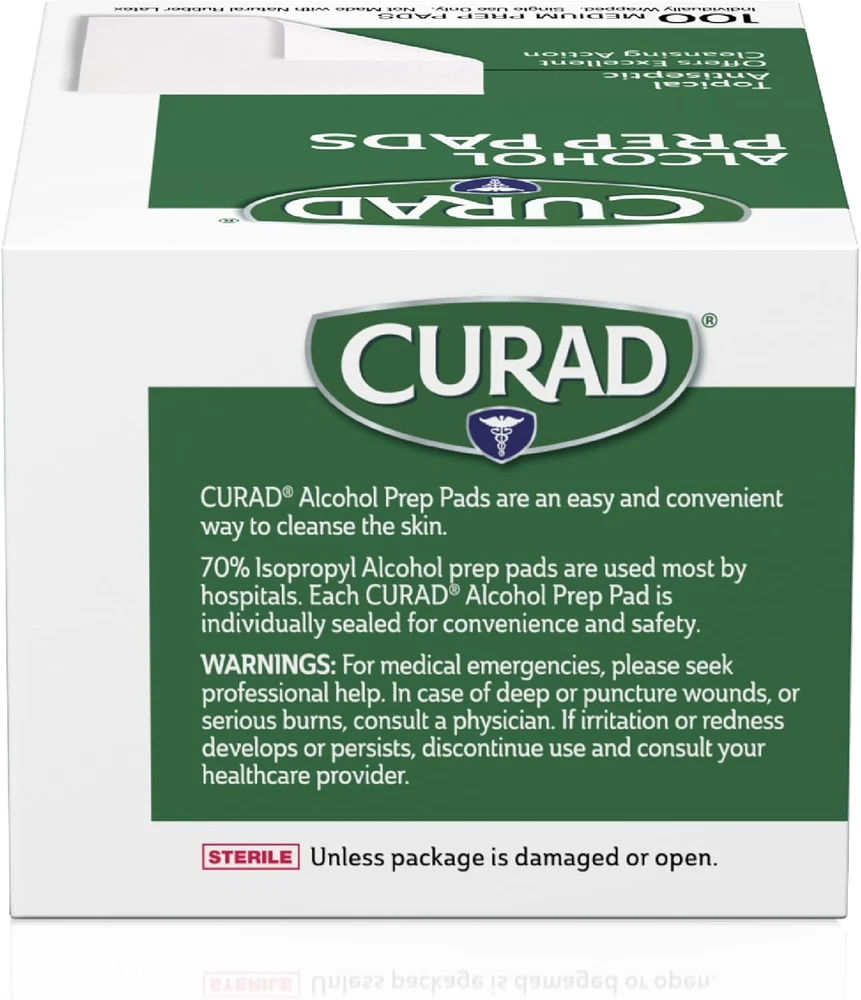 Store New Arrivals Add to Favorite View Feedback Contact CURAD Alcohol Prep Pads (Pack of 4 Boxes) | 400 Pieces of Medium Isopropyl Alcohol Wipes Individually Wrapped | First Aid Alcohol Swabs for Cuts & Scrapes | Medical Alcohol Pads for General Cleansing Description Item model number CUR45585RBZ Unit Count 400 Count Number of Items 4 Product Dimensions 4 x 12 x 10 inches; 0.01 ounces Country of Origin China Department unisex-adult Material Feature Thick, Sterile Skin Type All Manufacturer Medline Is Discontinued By Manufacturer No Brand Curad Size 100 Count (Pack of 4) INDIVIDUALLY WRAPPED MEDICAL ALCOHOL PADS: Our CURAD Alcohol Prep Pads are individually sealed in easy-to-open foil-lined packets. This keeps them sterile and saturated until you need to use them. ISOPROPYL ALCOHOL WIPES: We use a formulation of 70% Isopropyl Alcohol for our 2-ply pads. Effectively clean your skin and wipe away dirt and oil without use of soap and water. CONVENIENT FIRST AID: Simplify your first aid routine with our cleansing swabs. You can use them to treat little cuts and scrapes or to prepare your skin for bandaging, finger pricks, or injections. Perfect to clean your skin before finger pricks or insulin shots. KEEP YOUR SMALL ITEMS CLEAN: Our sterile alcohol prep pads are great for cleaning little things around your home or office. You can use them to wipe down small items like your phone, glasses, or earphones. PRACTICAL ESSENTIAL ITEM: Our alcohol swab pads easily tuck away without taking up much space. We recommend keeping several with you in your bag, desk, or car to use when needed. Product Description EASY AND CONVENIENT STERILE ALCOHOL PREP PADS Keep your home or office first aid kit stocked with our CURAD Alcohol Prep Pads. Our 1” x 1” isopropyl alcohol wipes are gamma sterilized to ensure that they’re perfect for a wide variety of uses around your home, office, or wherever you may go. They're also ideal supplies to keep in hospitals, clinics, and examination rooms. Manufacturer Contact Information 800-633-5463 ABOUT US We offer the best prices around on high quality products. Our E-store includes media such as books, movies, music and games while offering electronics, toys, sporting apparel, clothing, tools, general home, garden items and more. SHIPPING We are always working hard to ensure your package arrives as soon as possible. Please understand that some factors like weather, high postal traffic, and the performance of shipping companies are outside of our control. We offer free shipping to the lower 48 states and ship within 2 business days of payment, usually sooner. We do not accept P.O. Boxes. Please provide a physical address. RETURNS We offer a 30-Day Return Policy on items which you are not completely satisfied with. You have the option for a full-refund or an exchange of the item. No returns are available on items shipped outside of the USA. PAYMENT We accept PayPal. CONTACT US This page content is yet to come Please ad us to your favorite seller and visit again later Thank You CUSTOMER SATISFACTION We try our very best to make sure every customer is completely satisfied. If there's a problem, message us! We're happy to help.