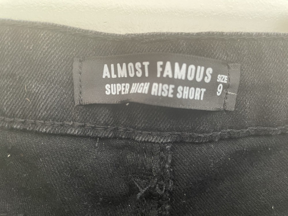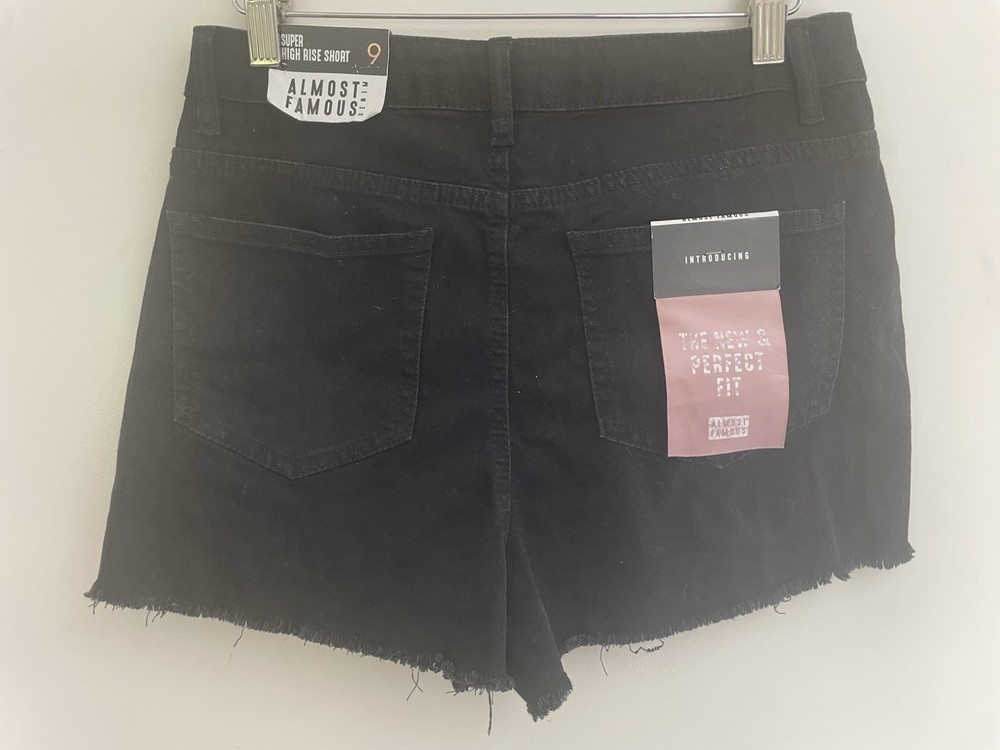 Almost Famous Women's Solid Black Distressed Super High Rise Denim Shorts Sz 9. Condition is new with tags. Smoke free, pet free home. Shipped via USPS Ground Advantage.