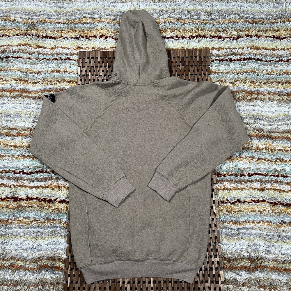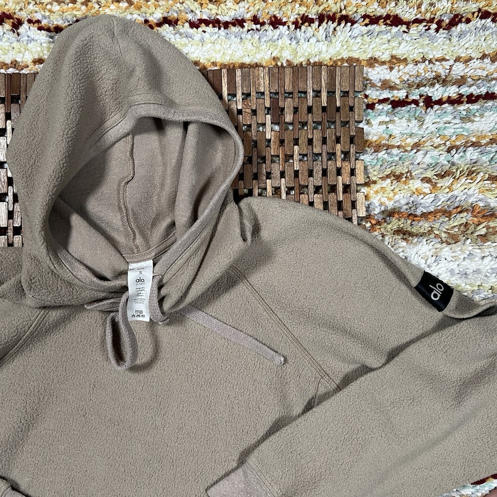 This is a beige Sherpa style hoodie by ALO in size small. It features long sleeves, a pullover closure, and a hood. Made of a polyester blend, this activewear hoodie is designed for winter wear and is suitable for yoga. The hoodie has a logo accent and is recommended for hand wash only. It is a unisex adults' pullover hoodie.