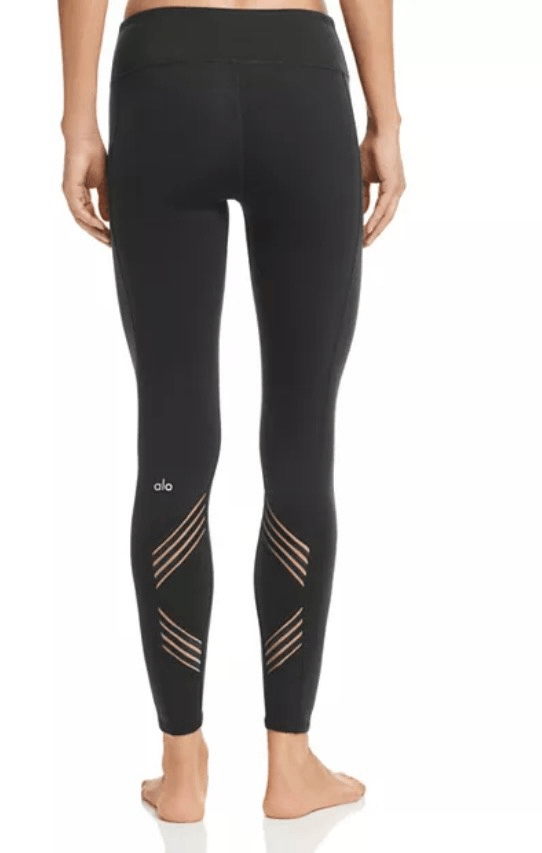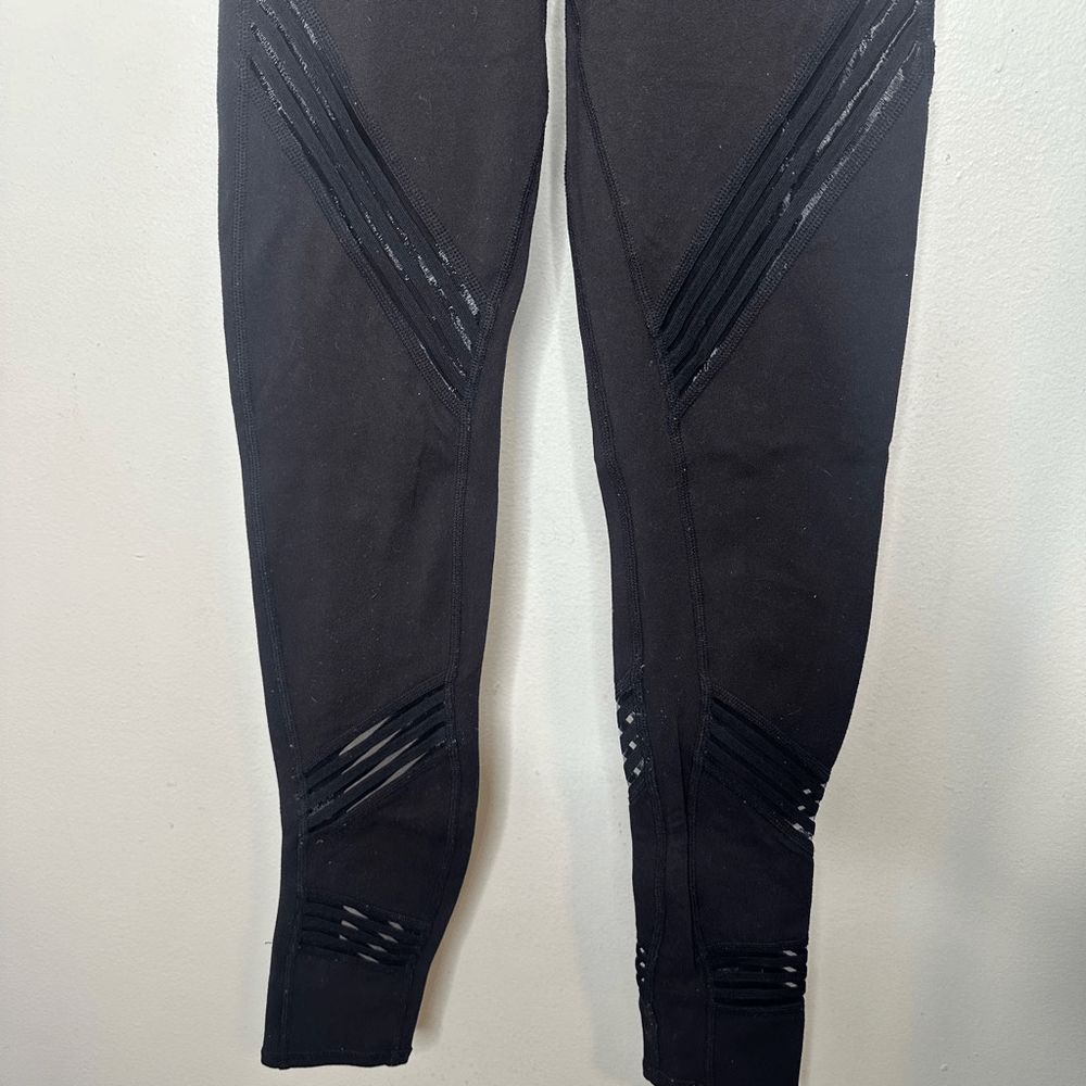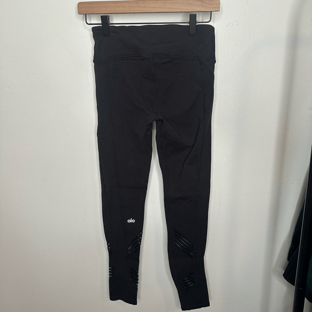 Alo Yoga Sheer-Inset Leggings Fits true to size, order your normal size • Elasticized waistband, interior pocket in waist • Filament detail, pull-on style Mid rise Color: Black Size: XXS Excellent Pre Owned Condition