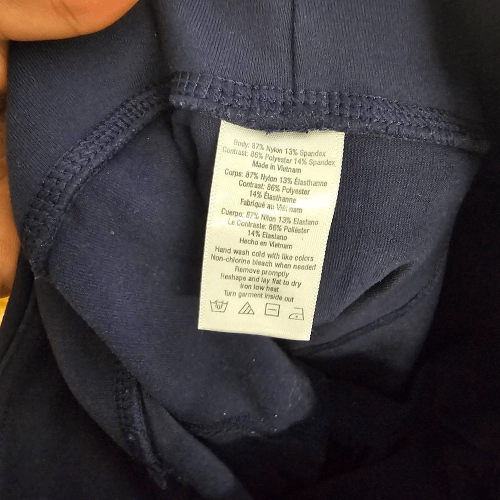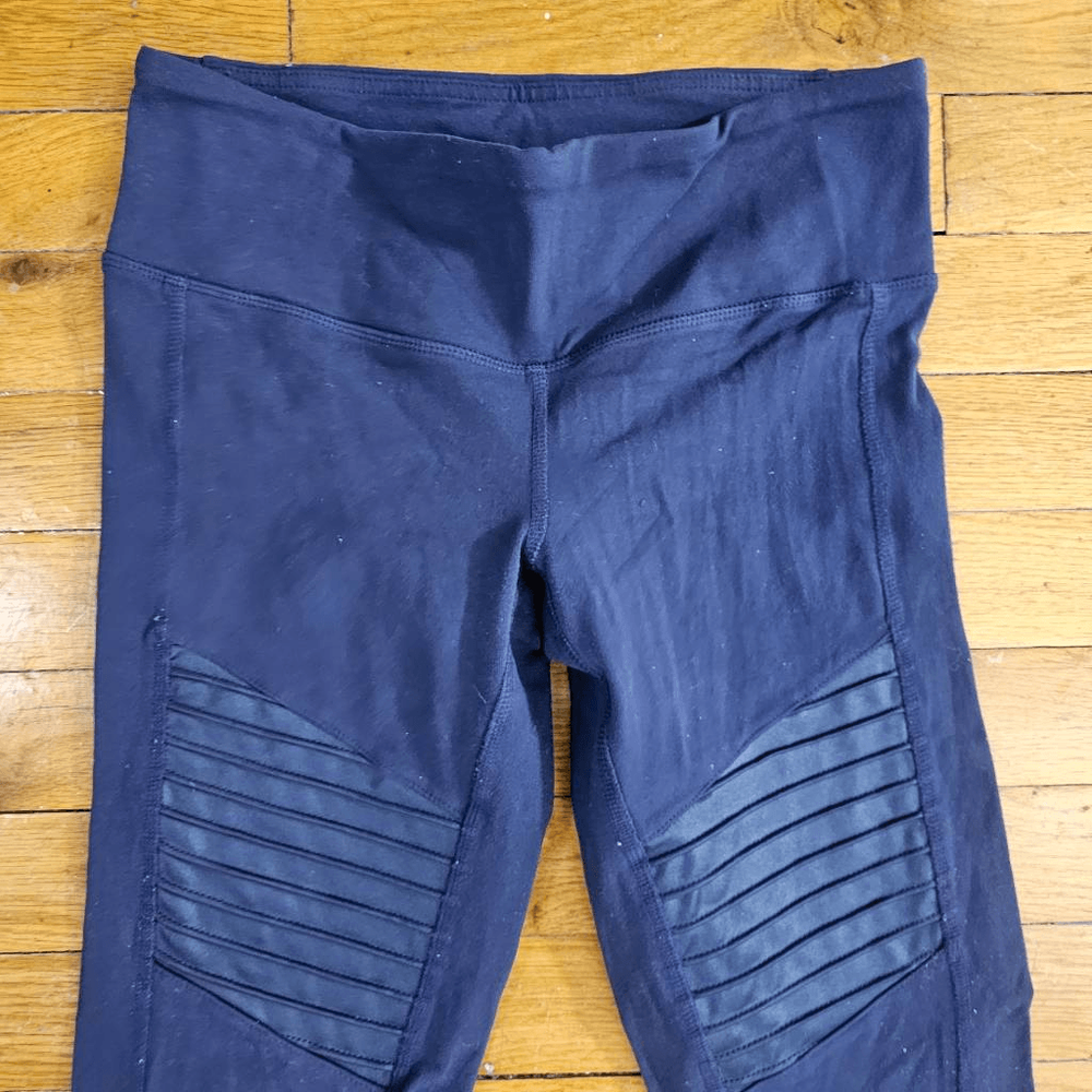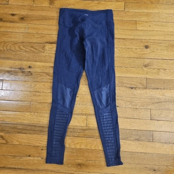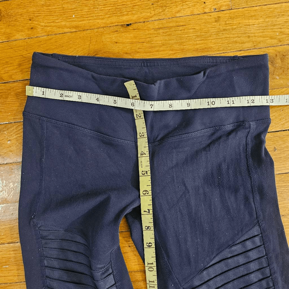 It looks like the leggings are worn. The actual measurements of the clothes are in the photos. If the clothes have a defect, it will be shown in the photos.The clothes are not washed by me so they may smell like dirty clothes or other things. Good condition.