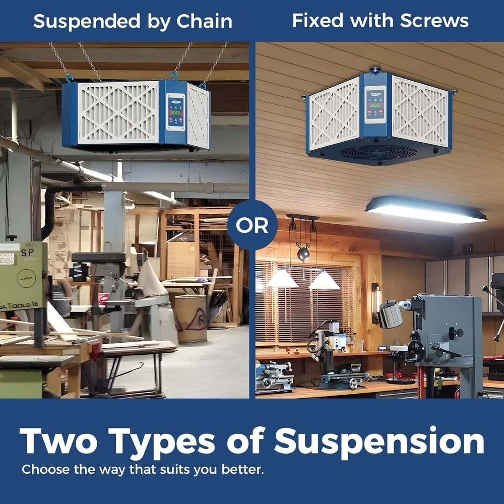 AlorAir 360 degree Intake Air Filtration System - (1350 CFM) with Strong Vortex Fan, Built-in Ionizer, Shop Dust Collector for Woodworking Shop, Garage Works Shop, Purecare 1350IG Click Blue Underlined fonts to Shop 4Pack Filter. Alorair 4-pack MERV-11 Air Filter for Purecare 1350/1350IG Air Filtration System Product information Technical Details Manufacturer ALORAIR Part Number Purecare 1350IG Item Weight 27 pounds Product Dimensions 20.5 x 20.5 x 9.8 inches Style 1350 IG Material iron Voltage 115 Volts Batteries Included? No Batteries Required? No About this item Kindly Note: The AIR Filtration System does not meet California's regular requirements, it can not be shipped to California, Accessibility: Timer cycle controller, you can set fan to shut down automatically in 1-9 hours. √ IR remote system: There is no wireless interference, and the anti-interference ability is strong. √ With a hook and chain: Puricare 1350IG air filtration system is easy to move and can be hung from the ceiling in the shop or placed on a workbench. Built-In Ionizer: ALORAIR air filtration system built-in ionizer, the air passed through is subjected to electric discharge. Pollutantsand odor particles in the drawn-in air are subjected to oxidative degradation and can achieve the effect of dust removal,elimination of odors, and improvement of air quality to promote your health. 360 degree air Intake Air Filtration System: The Shop Dust Collector has a 360 degree air intake design, powerful enough to cover a large area with high circulating airflow, sawdust from woodworking, grinding, sawing, etc. Improving your workplace’s air quality. Dimensions: 20.5"Lx 20.5" Wx 9.8"H; electrical Reguirements: 115v,60 Hz, 1.5 A ; cover rooms up to-1700 sq.ft; noise rating: 60 to 69 dB Strong Vortex fan: The Air Filtration System for woodworking is equipped with a strong vortex fan, which generates a strong airflow when working, and maintains a high static pressure state even if the filter covers a large amount of wood chips. It has two-stage speed selection. Suitable for wood carving workshop, Woodworking, Garage. High Eficiency Filtration Technology: The shop air filtration system is equipped with a fiter with class MEVR 11, which canstop 90% of 3-10um particles and 85% of 1um particles. ldeal for wood carving, sanding, tumning, scroll saw work, rotary tools, powder mixing, etc. it quarantees periect results in terms of reducing indoor alr polution. The filter can be easily replaced. Product description PureCare 1350IG Dust Collector with Built-In Ionizer Wildfire Dust & Smoke Control PureCare 1350IG featured ionizer can reduce the dust and smoke, built in strong vortex fan with 2 stage air flow speed creates strong air circualtion, improves your air quality when wildfire comes. 2-Speed Air Filtration System with Remote Control Features 360 degree air intake design that circulates air in a 400 square foot space up to 13 times per hour. Use Vortex fan to create more powerful wind, offer 2 optional airflow speeds of 1050CFM/1350CFM for your adjustment. Purecare 1350 dust collector includes an infrared remote control, in addition to manual control, also supports remote control within a certain distance. High-density MERV-11 is easy to disassemble and install, assisting unit to achieve more thorough cleaning. 1-9 hour programmable timer allows you to set the time you desire, the unit automatically shuts off when the set value is reached. Purecare 1350 air filtration system has a 360 degree air intake design. Compared with traditional units, it can improve the air quality of woodworking workshops more efficiently and quickly, providing you with better air circulation. Hang it from the ceiling of the workshop or place it on a horizontal surface to effectively remove sawdust particles or other allergens from the space up to 1350 cubic feet per minute. 1050CFM/1350CFM 2 Speed Options Two optional speeds (1050CFM/1350CFM) allow you the freedom to choose the efficiency of your air filtration system based on your actual needs. 360 degree air intake is designed to cover your work area in all directions, up to 1,700 square feet.