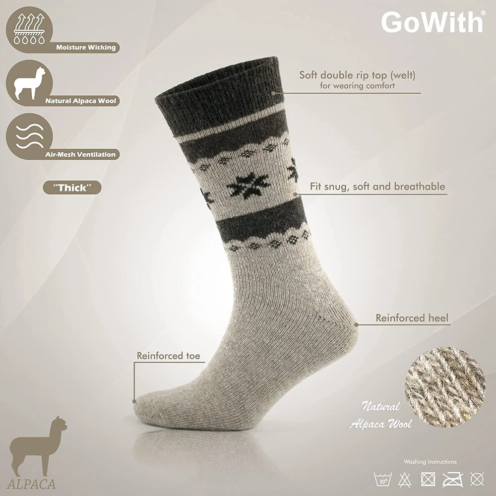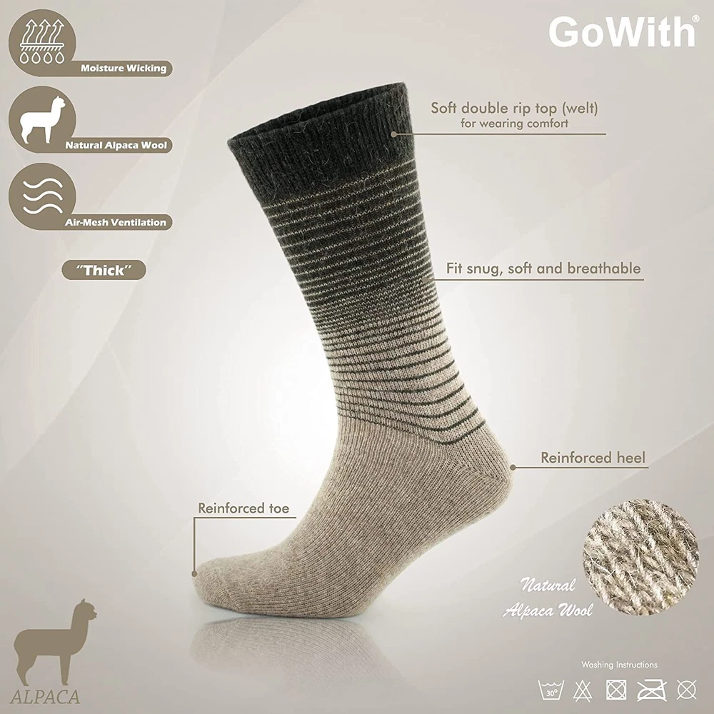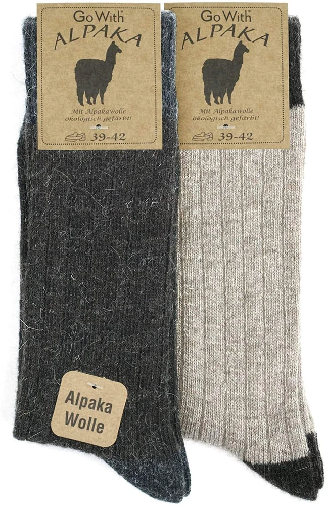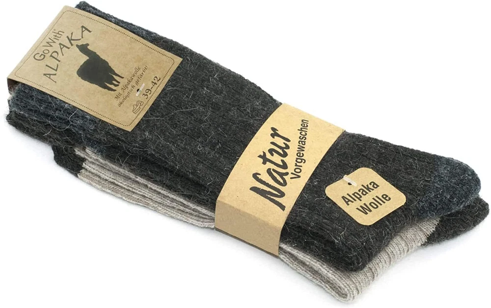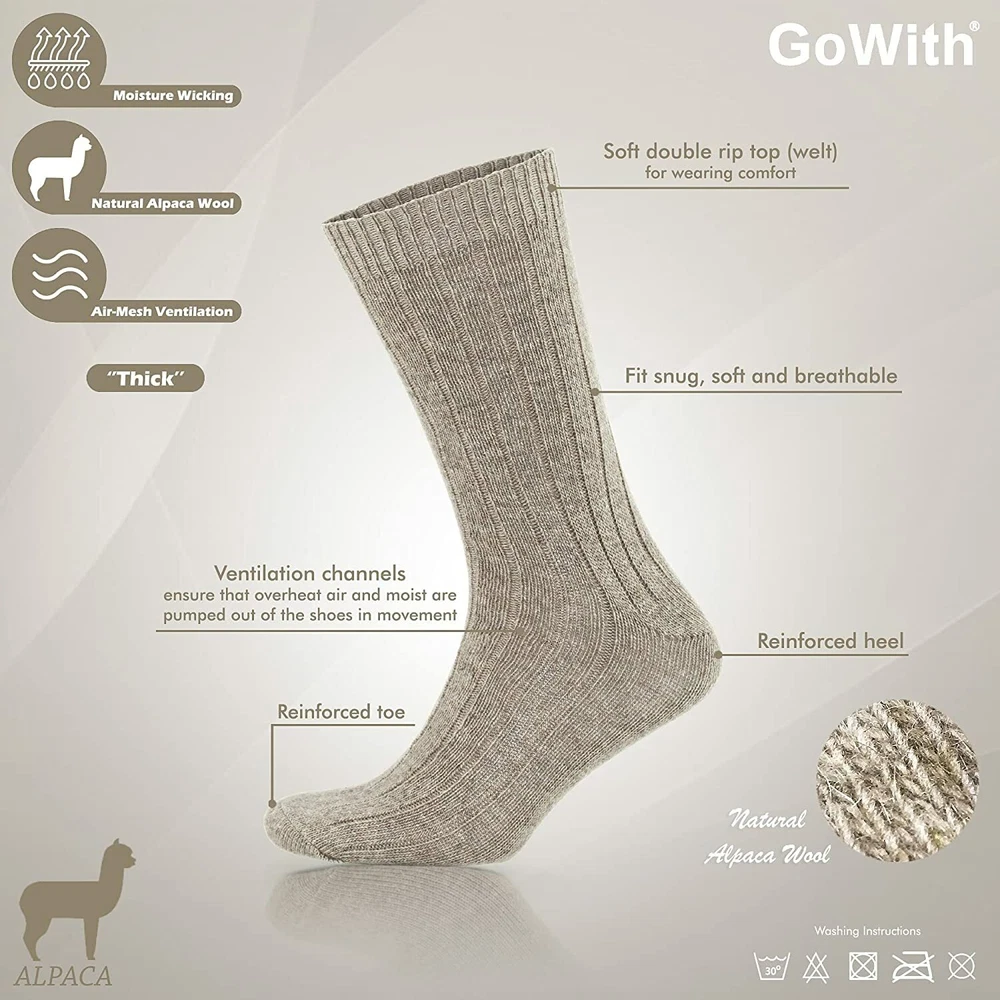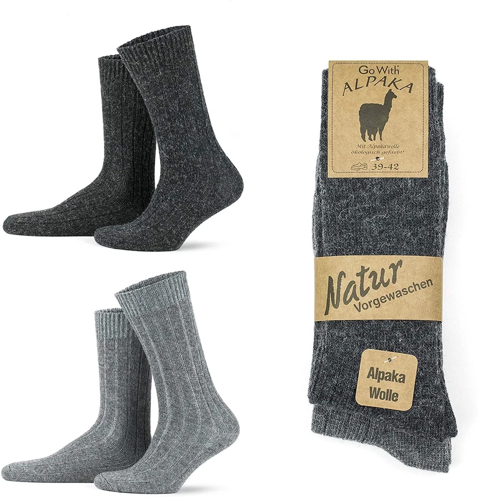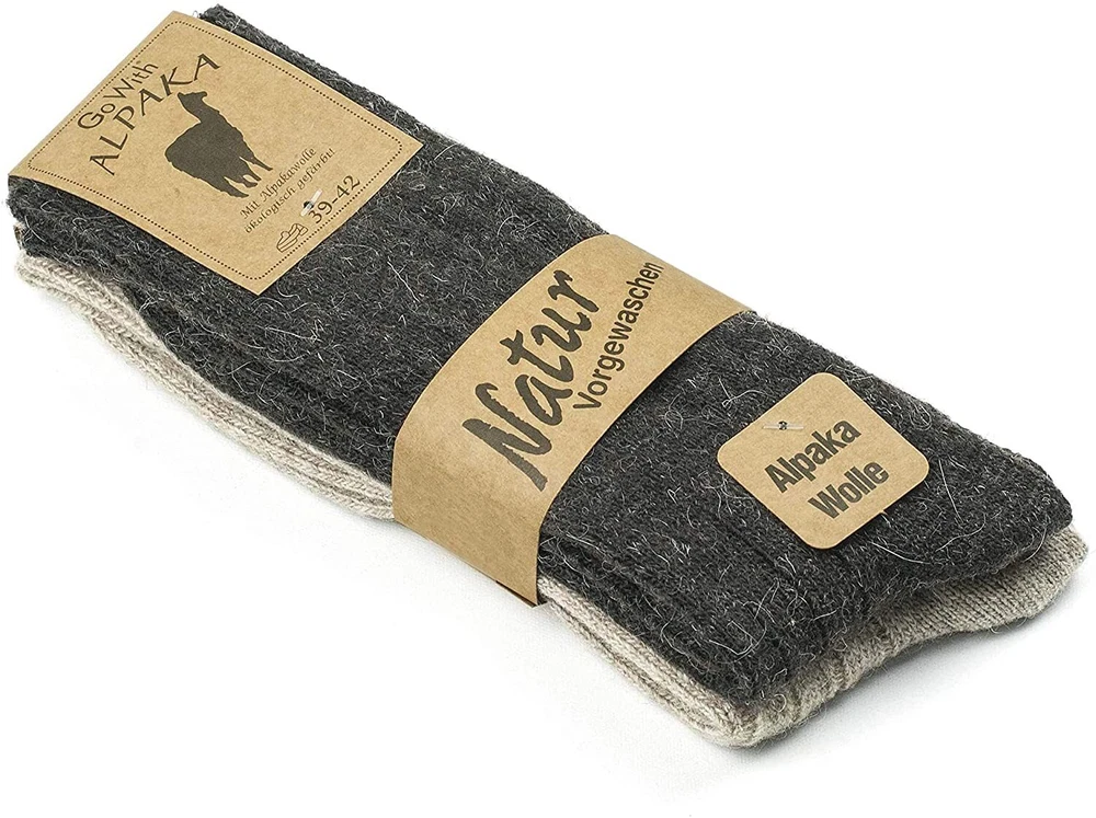 GoWith Original & True Alpaca Socks Premium Material: Alpaca camel wool is very durable thanks to its long fiber structure. Our winter alpaca socks for men and women for cold weather are made from non-itching hypoallergenic alpaca fibers. These Thick Knitted unisex wool crew socks are lightweight while still offering superior durability. Natural Moisture Wicking Socks. Our socks have Oeko-Tex® Standard 100 certification and has been tested for harmful substances and manufactured using sustainable processes under environmentally friendly and socially responsible working conditions and therefore %100 skin-friendly and allergy-free. Material(Imported): %40 Alpaca Wool %45 Sheep's Wool %12 Polyamide %3 Elastane Designed in Germany and made in Turkey. (we are often imitated but never duplicated) Available Sizes; US 5 - 8 (W) or (U) EU 35-38 US 7.5 - 9.5 (M) or (U) EU 39-42 US 10 - 12 (M) or (U) EU 43-46 NOTE FOR SIZE: (W) denotes the women and (M) for the men shoe size while (U) shows the unisex size.