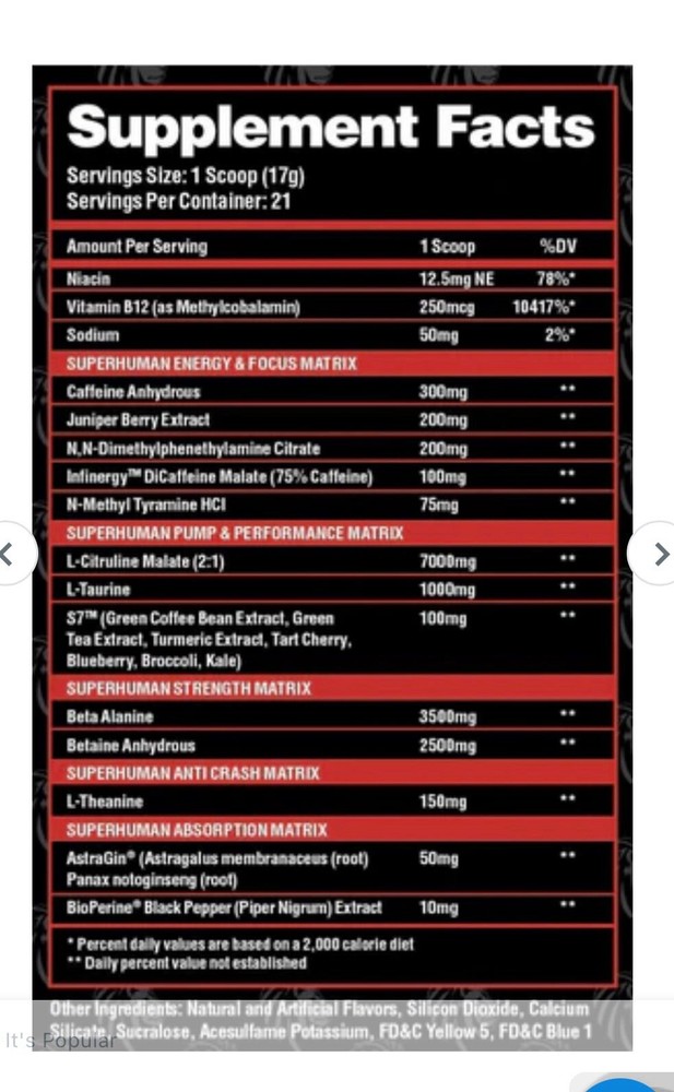 Caffeine, Beta-Alanine, L-Leucine, L-Citrulline, Vitamin B12, Citric Acid, Sodium, Taurine