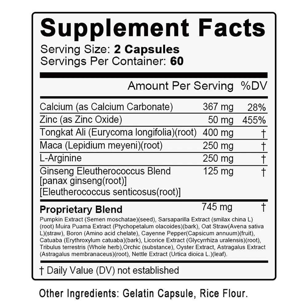 Effects: Testosterone Booster, Energy & Endurance Ingredients: Maca, Ginseng, Zinc, L-Arginine Directions: Take 2 capsules once daily after a meal. Shipping: Ships within 48 hours on working days. Shelf life: 2 years Description: Testosterone Booster - Alpha Male is designed for professional exercise enthusiasts and athletes focused on maximizing strength and results in their workouts. Provides you with the stamina, confidence and improved circulation you need to perform better physically. And boosts free and total testosterone levels so you feel like you're at your best! Increase Vitality: Boosting testosterone levels is an ideal way to restore your masculinity as you age. Alpha Male's premium blend to help enhance your performance and restore your manhood, helping you gain greater lean muscle mass and energy levels. BUILD MUSCLE AND STRENGTH: Our products are focused on enhancing athletic performance, promoting muscle growth, improving quality by reducing fatigue and increasing endurance. This will allow you to achieve peak performance, build muscle, work harder, and train for longer. Document