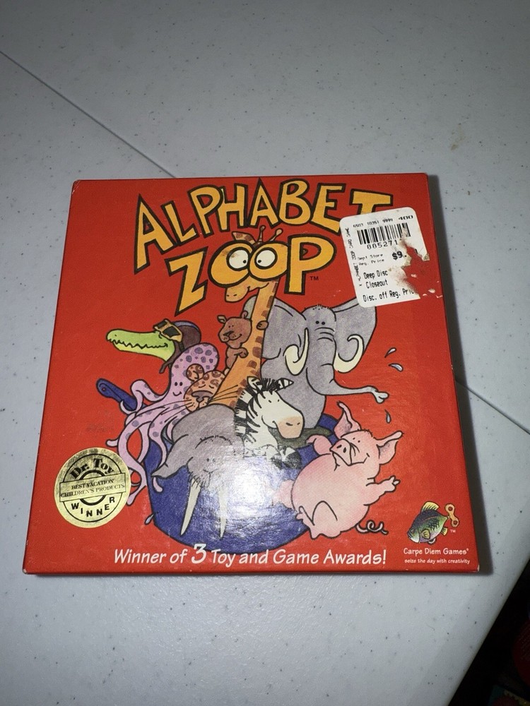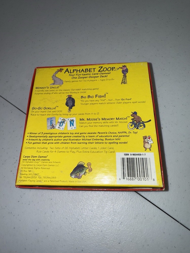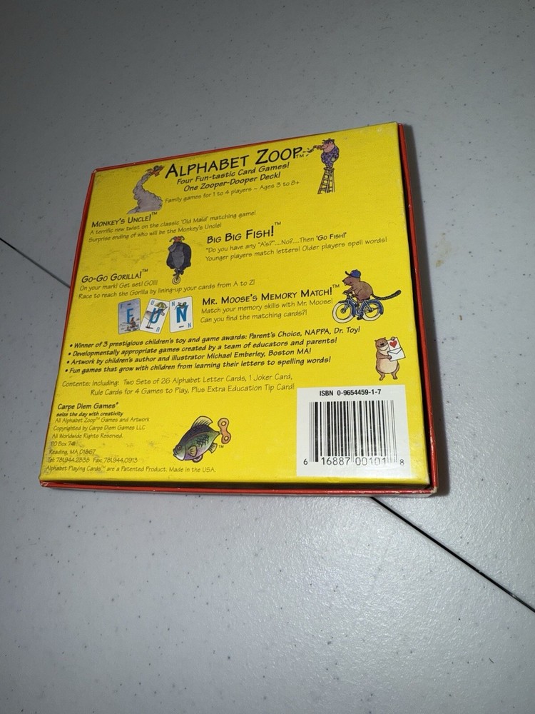 The product is a used card game titled "ALPHABET ZOOP" by Carpe Diem Games, designed for children aged 3 and up. It offers learning fun through four different card games involving animals, suitable for 1 to 4 players. Manufactured in Belgium in 1999, the game features a theme centered around animals and is gender-neutral, appealing to both boys and girls. With a recommended age range of 3 to 103 years, it caters to various age levels from preschoolers to adults, making it an educational and entertaining option for families and individuals alike.