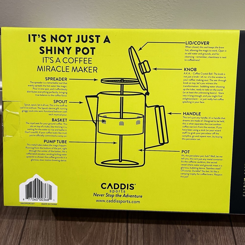 • Complete Coffee Set: Includes a 9-cup coffee percolator and 4 durable 9 oz carabiner mugs, perfect for brewing and serving rich, flavorful coffee for family or friends at home or on camping trips. • Stainless Steel Durability: Crafted from high-quality stainless steel, this percolator coffee pot is built to last, resisting rust and ensuring reliable performance on stovetops or campfires. • Perfect for Camping & Home: Lightweight and portable, this stovetop coffee percolator is ideal for outdoor adventures or cozy mornings indoors—enjoy barista-quality coffee anywhere. • Fast & Easy Brewing: Brews up to 9 cups in minutes with a classic percolation design, featuring a clear knob to monitor the process and a sturdy handle for safe pouring. • Backyard Gatherings: Host a cozy outdoor breakfast or barbecue and impress your guests with freshly brewed coffee straight from the percolator. Its sturdy construction and easy-pour handle ensure hassle-free serving, while the clear knob lets you monitor the brewing process for perfect results every time. Set includes: 1 x 9-Cup Stainless Steel Percolator 4 x Matching Stainless Steel Mugs