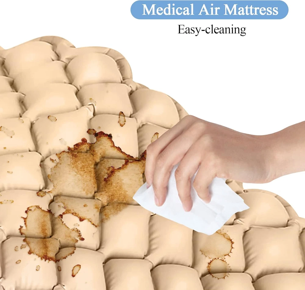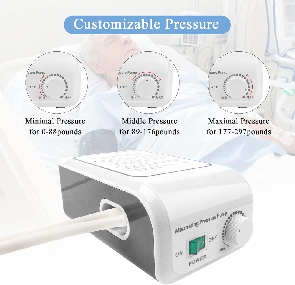 100% Pvc 【Air Circulation Technology】: All the 130 air cells of the alternating pressure mattress inflate and deflate alternately, so that this bed sore pad can distribute the body weight and avoid pressure spots. The constant airflow promotes efficiently the blood circulation and prevent bed sores & ulcers. 【Customizable and Quiet Pump】: The hospital bed mattress has a pressure adjustment button. You can have customizable pumping pressures to suit the needs of people of different weights. It works very quietly (less than 50dB), which can ensure a comfortable, deep and peaceful sleep for the patient. 【Non-slip Mattress for bed sores】: This air mattress for hospital bed is sized 76*34.6*2.4 inches and can support up to 298 pounds. Its longer parts at both ends be tucked under the mattress to prevent the mattress from slipping off during use. 【Premium Materiel for Bed Sore Prevention】: Our hospital bed mattress is made of high quality and recyclable PVC material. The waterproof and easy-cleaning material defends the body health of the patient. 【Quality and Service Guarantee】: If you have any dissatisfaction for the bed sore mattress topper, we promise you that this product can be returned for 36 months. We have a professional and experienced customer service team. When you have any questions or needs about the product, you can contact us at any time by email. Product Description Revolutionary Air Circulation Technology A continuous airflow inside the mattress can disperse the pressure and heat of the patient's body. At the same time, it can effectively promote the blood circulation, making the patient feel more comfortable. All the 130 air cells inflate and deflate alternately, relaxing all parts of the body. The surface of the mattress is also a breathable material, the patient's skin can breathe well. Fit different occasions This bed sore pad has two basic functions (1)The continuous airflow can better disperse the pressure, which can avoid pressure concentration and continuous pressure. It can also promote blood circulation. (2)The surface of the hospital mattress has good ventilation and heat dissipation functions. It can help the patient's skin to breath and can ensures good health. Customizable Pressure The air pump of the mattress has a switch device and a pressure adjustment button, which can meet your customizable demands. You can adjust the pressure to the maximum when installing the mattress to fill it up quickly; when you need to rest, you can lower the pressure of the air pump to get a more comfortable experience. Hanging / Sitting Pump Put the hook on the back of the air pump upright, then you can hang the air pump on the bed. If you fold up the hook, you can put the air pump on a table, chair, floor, etc. Extremely Quiet Operation The air pump has been designed with a special noise reduction technology. When the customer uses the mattress, the air pump can work quietly without affecting the patient's rest and sleep. Waterproof and Easy Cleaning The mattress is made of high-quality PVC waterproof material, which can play a good waterproof role while being comfortable and breathable. At the same time, it is easy to clean so that it can ensure the hygiene and safety of the mattress. What’s included? Alternating Pressure Pump Alternating Pressure Pad Flexible Air Hose Patch Kit A glue Operation Manual Operation Instructions Step 1 Place the alternating pressure pad on the bed and tuck the end of the pad under the mattress to prevent the slippage. Step 2 Connect the pad port to the pressure pump using the flexible air hose Step 3 Put the pump to a stable location and plug it into an outlet Step 4 Switch on, and the inflation begins, then you need to adjust the pressure to maximum Step 5 Ensure the pad has been fully inflated before positioning the patient on top of it
