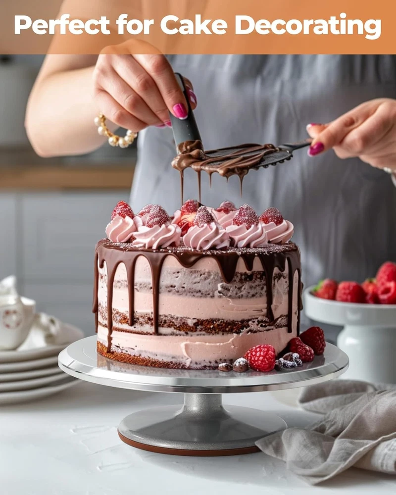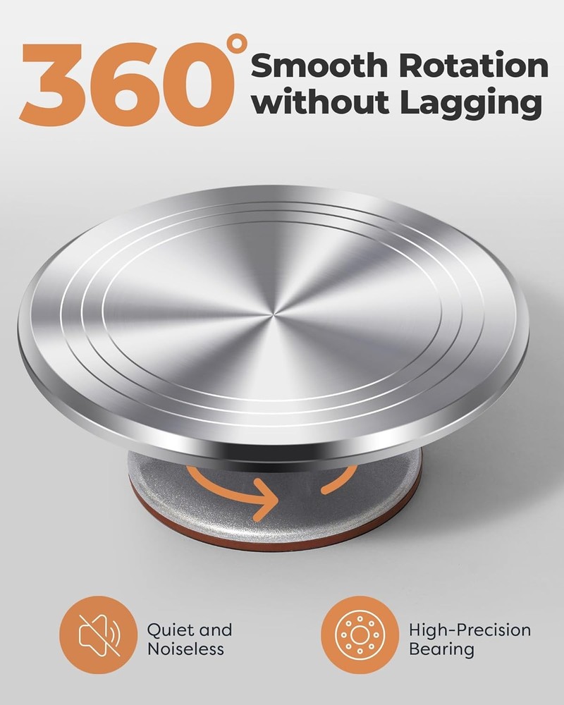 Aluminium Cake Turntable Set 12" Revolving Stand Baking Tools Decorating Kit Product description Easy-to-Use Aluminum Alloy Cake Turntable Non-slip Base Our cake stand is equipped with a non-slip silicone pad at the base, ensuring stability and preventing any unwanted movement during decoration. Precise Tick Marks The cake turntable has four tick marks: 7.9", 8.9", 9.9", and 11.2". Select the appropriate size based on your desired servings. Flat Cake Plate The surface of our cake stand is flat and smooth, ensuring an even and stable support and enhancing the precision of your decoration process. Hidden Ball Bearings With concealed ball bearings built in, the cake spinner effortlessly rotates 360°, allowing easy access to your cake from all sides quietly Nice Gift Idea This cake decorating supplies set includes a heavy-duty cake turntable, scrapers, spatulas, and a cake server—practical tools for cake decorating. It is a wonderful gift idea for both amateurs and professionals, it elevates the cake-decorating experience to new heights. Holiday Cupcake/Cake Display Stand The cake turntable is made from aluminum alloy and has a refined finish, enhancing its aesthetic appeal. Displaying your cake or cupcake on the cake stand, like Christmas, Thanksgiving, etc, will complement the finesse of your creations, making it the centerpiece of your gathering. Cake Turntable for Party: Constructed with heavy-duty aluminium alloy provides excellent stability on countertops, keeps the cake stand from moving. Non-slip surface & rubber feet to help keep your cake and cake decorating stand in place while decorating. Cake Decorating Comb & Icing Smoother: 3 cake decorating combs is made of high-quality stainless steel for creating different texture and smoothing the sides of the cake. Provides up to 12 different patterns ( The cake decorating comb has blue film, please remove it before use. ). Angled Spatula and Silicone Spatula:12.7" icing offset spatula applies the icing on the side or top of cakes. Perfect for smoothing the frosting surface, making layered cakes, and cutting the cake. A soft silicone icing spatula can help you get a perfect mixture when you mixing the icing, flour, or eggs. Cake Server/Cutter: Stainless steel cake cutter lets you cut and serve cake or pie slices & serve them without damaging delicate pastry. Easy to clean. Note: Do Not recommend cleaning it with the dishwasher for extending the service life. Premium Baking Supplies Frosting Tools & Cake Decorating Kits: Strong, durable, stainless steel, corrosion-resistant, reusable, non-stick, tasteless, food-grade material. (Keep dry and clean after use or wash.)