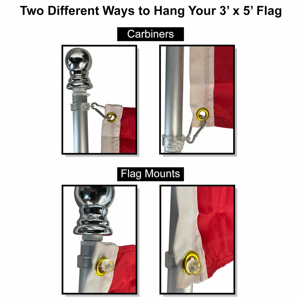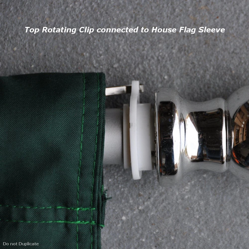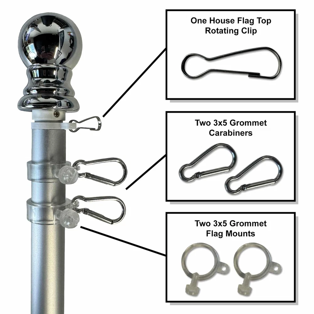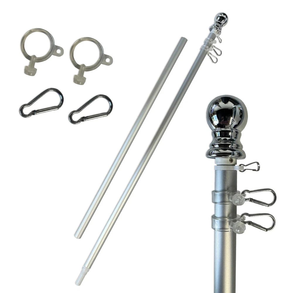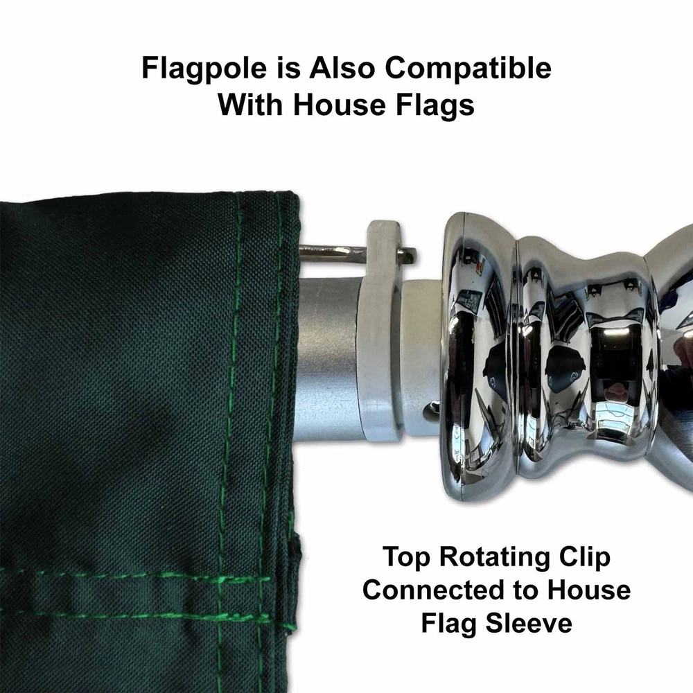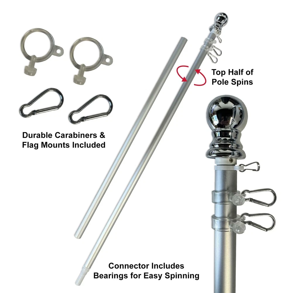 Our Spinning 6 Foot Flagpole is of two-piece brushed aluminum construction and has a sealed ball bearing joint which allows the top half of the pole to spin freely. This prevents your flag from "furling" or getting tangled around the pole in breezy conditions. The flagpole has a diameter of 1" and includes a silver ball top. This heavy duty flagpole includes two (2) Grommet Mounts (for 3x5 Flags) and a Top Swivel Clip (for House Flags and Top Sleeved Banners). Flag and Bracket are Not Included. 6 Feet Two-Piece Aluminum Construction The Pole diameter is 1" and the Top Half Freely Spins Two (2) Grommet Flag Clips and One (1) House Flag Sleeve Clip are Included Designed to be used with 3'x5' Flags or House Flags A Decorative Silver Plastic Ball is included