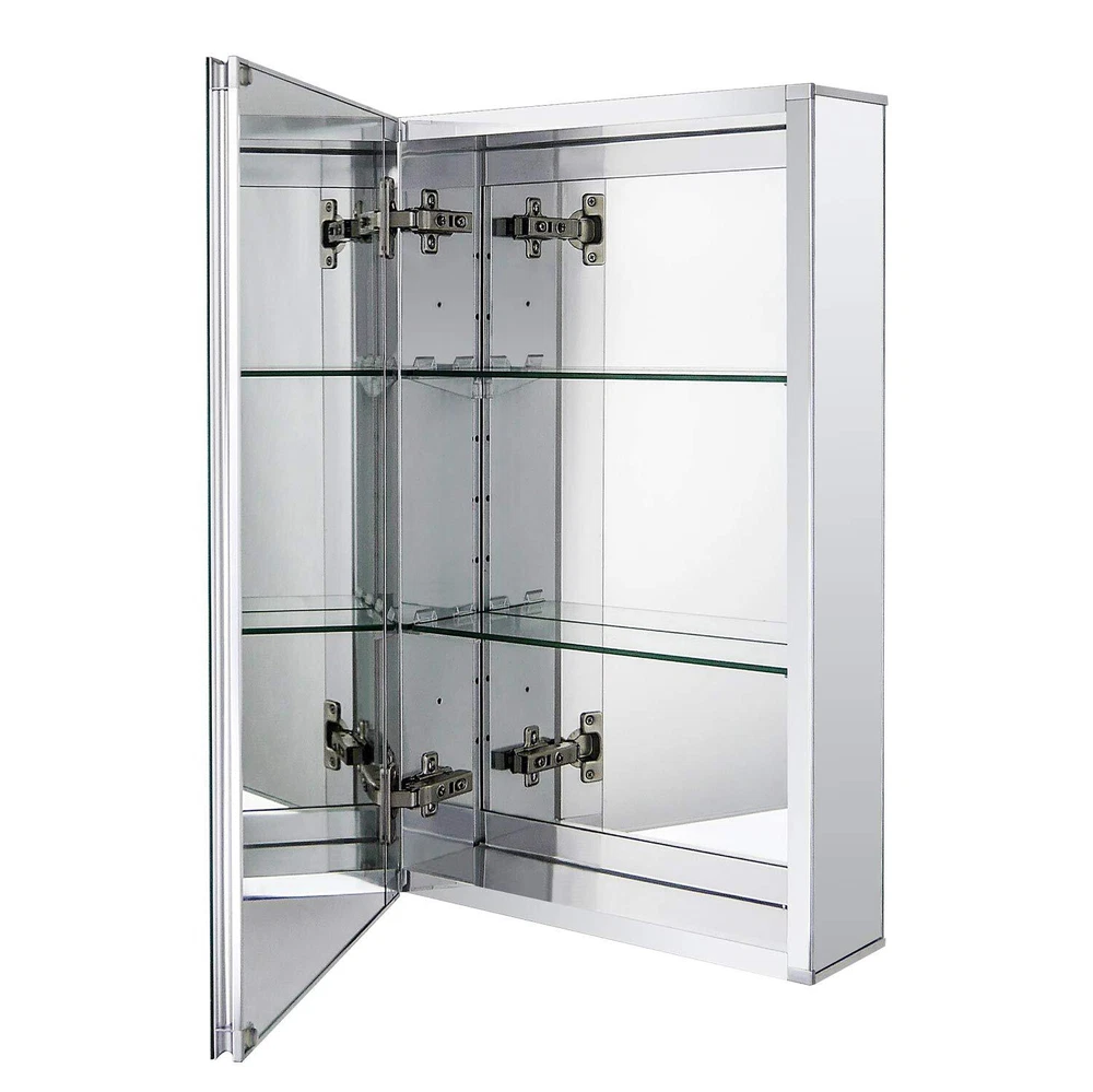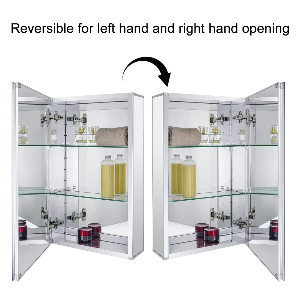 This frameless medicine cabinet inside and outside are mirror surface. Two adjustable tempered glass shelves, rugged, with transparent four fixed brackets integrated with tempered glass shelves, enough to accommodate and withstand your toiletries Adjustable 100-degree Soft closed hinges, allowing you to easily open the door without interference Grinding silver mirror design, pampering your hands and enjoying a wider view Simple mounting kit that can be easily mounted on the wall and very secure 【Multi Mirrors】medicine cabinet with Beveled edge mirror in front of the door; Mirrors on back of door and interior back of cabinet, Include side mirror kit for surface mounting. 【Durable material】Anodized aluminum profile, shining finish, strong rust-resistant capacity, lead to a stable and long lifetime, so it’s easy to clean this bathroom cabinet. 【Adjustable shelves】2 adjustable tempered glass shelves and has 9 adjustable heights to make sure you can place more daily necessities. 【Hinge】The mirror cabinet has two soft-closing hinges, which will slow down the closing speed of the door to avoid hitting the cabinet when you close the door and it is quiet. 【Installation】This medicine cabinet can be recessed or surface mounted, and it can also be mounted reversible (upside down). Please follow the instructions to install the cabinet step by step. Any confusion about assembling this medicine cabinet, please communicate with us~ All feedback will be replied within 12 hours.