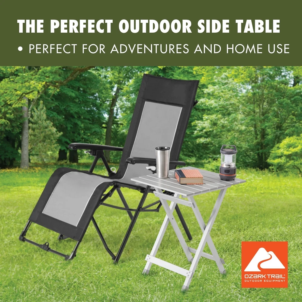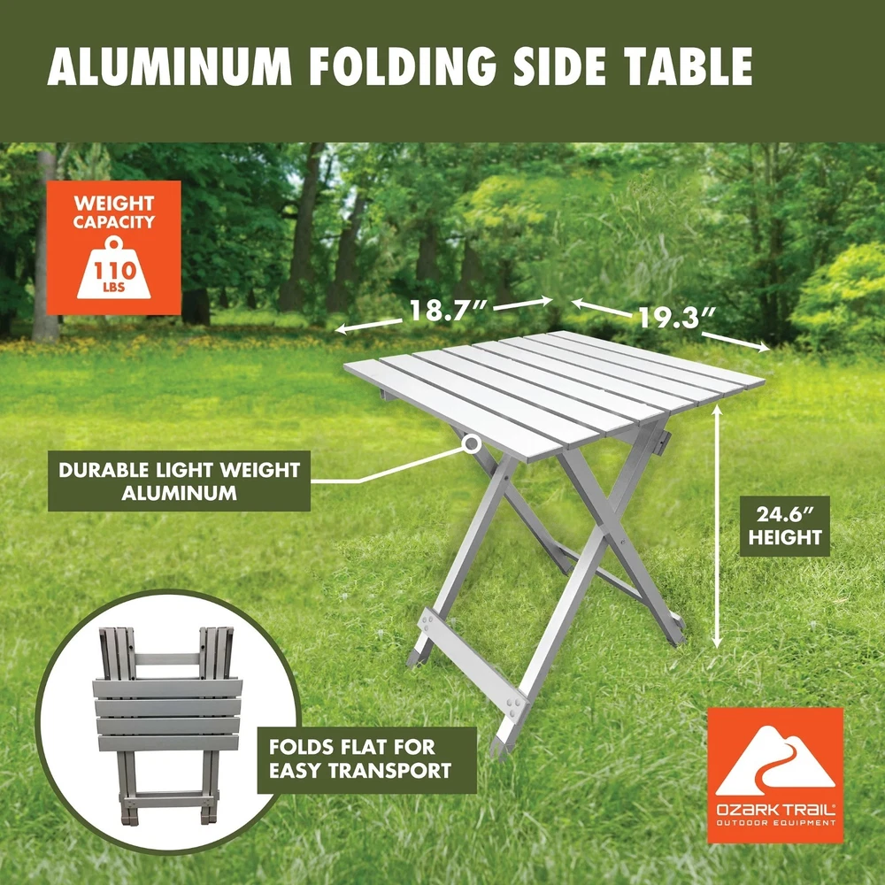 Product details The Aluminum Camping Table in Silver is a great choice for outdoor meals and gear setup. It is lightweight, rust-resistant, and easy to carry. The table folds in half for quick storage and includes a strong aluminum frame. It supports up to 110 pounds and weighs only 4.9 pounds. Use it for camping, tailgating, picnics, or backyard fun. Great for camping, picnics, tailgating, backyard, and more Lightweight and rust-resistant The camping folding table is made of aluminum Folds in half size for easy storage Weight of table: 4.9 lbs Dimensions: 19.29" L x 18.7" W x 24.6" H Weight capacity: 110 lbs Check out all the gear and enjoy the great outdoors