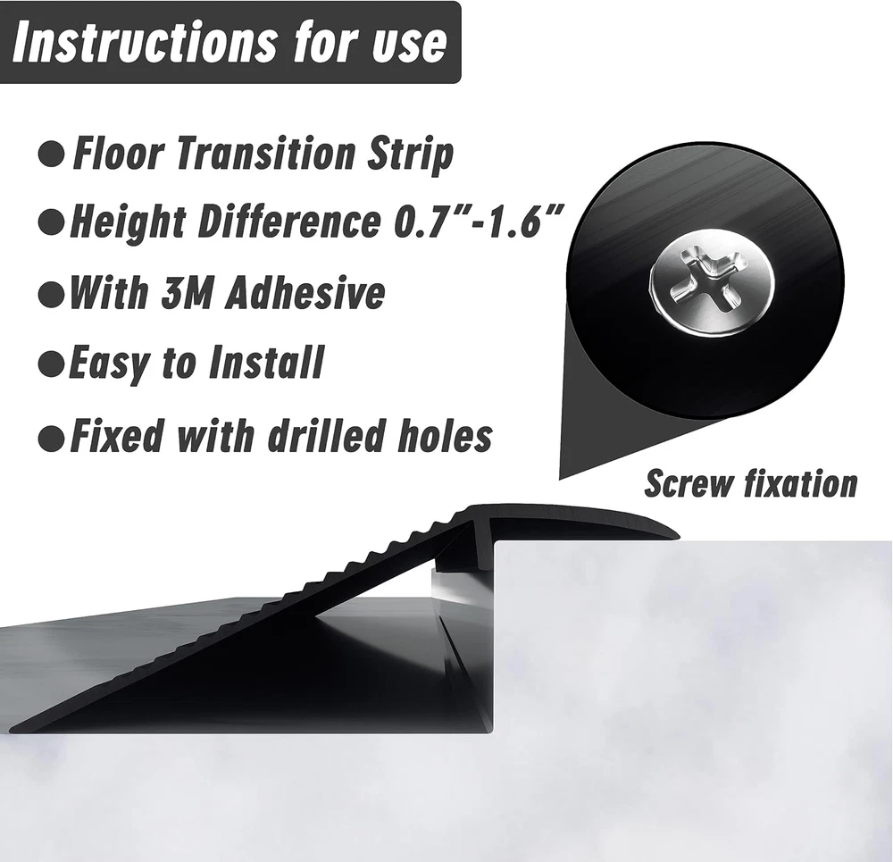 This transition strip is a game-changer! The sleek black aluminum looks modern and durable, perfect for bridging gaps between floors. Easy to install, stays firmly in place, and gives a clean, professional finish. Great value for the quality—highly recommend for any home upgrade!