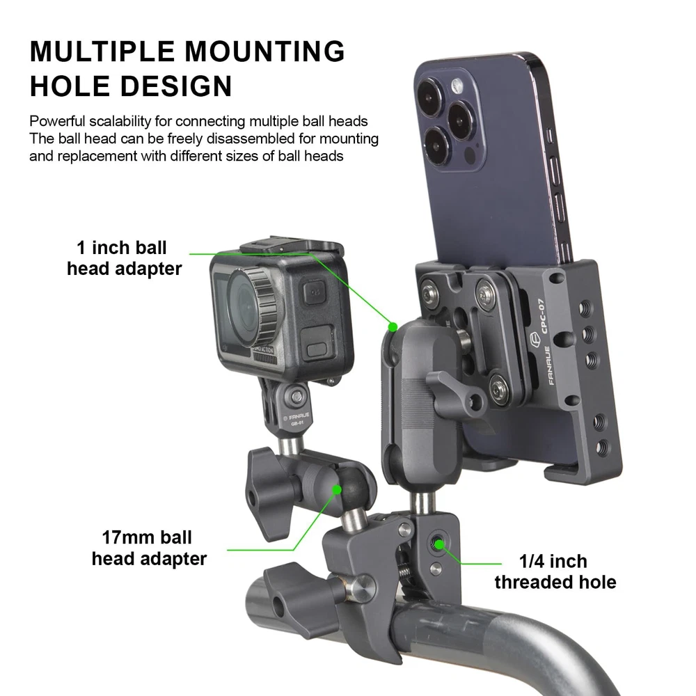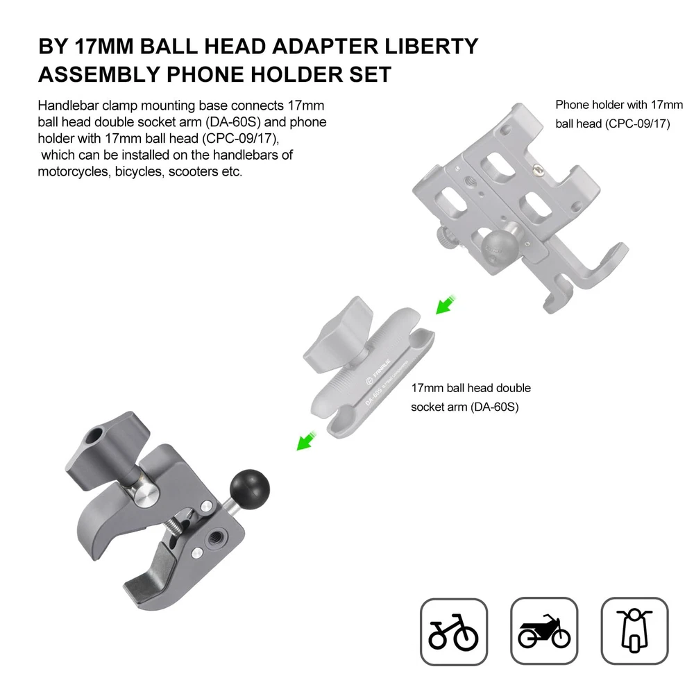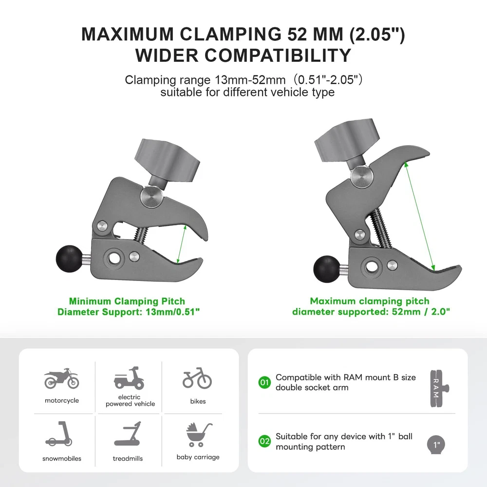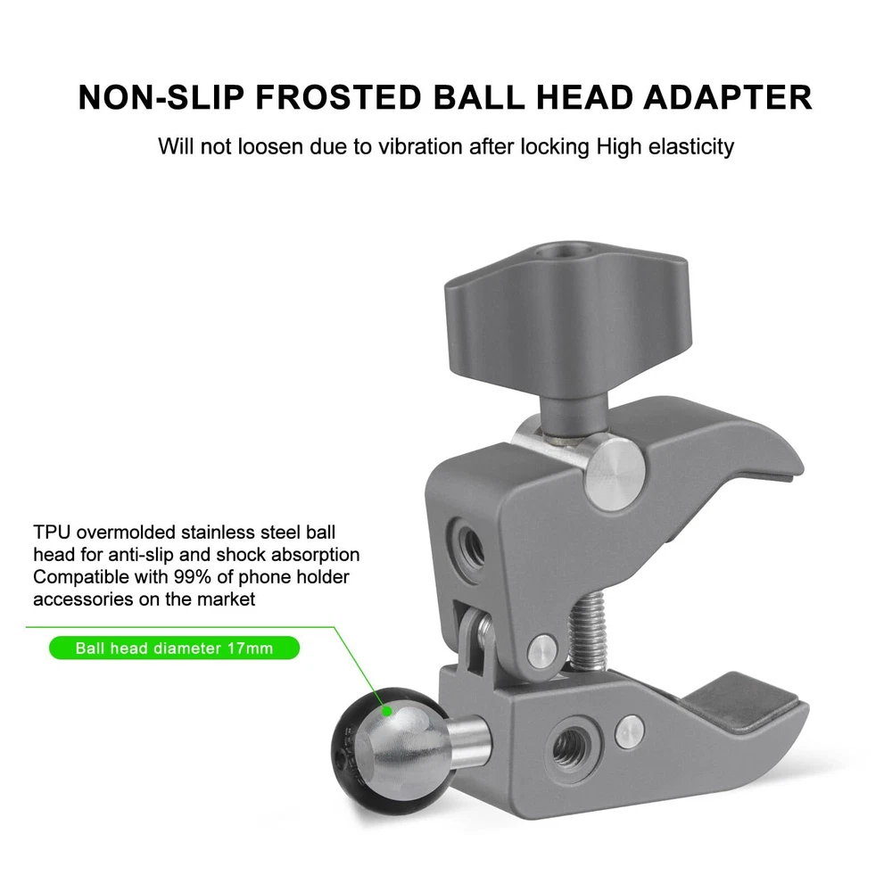 CC-0417 Handlebar base mount strong rod clamp with four 1/4 threaded holes and removable 17mm ball adapter for extended attachment of 1" ball head adapter, one base to mount multiple camera mounts or cell phone holders, with minimum clamping range of 0.5" (13mm) and maximum clamping range of 2.0" (52mm), you can clamp your equipment within that range, great for mounting on airplane yoke, bicycle/motorcycle/stroller/mountain bike/buggy/off-road bike/road bike/golf cart/electric scooter/ATV handlebars, even kayak rails and roll bars, ideal mounting base for cell phone mounts for smartphones, tablets, action cameras, fishing rod holders and more. Handlebar base mount strong rod clamp with 17mm ball head made of aluminum alloy, stainless steel and high quality non-slip rubber, which is more durable and not easy to be damaged, maintains durability and reliability in the most demanding environments, TPU covered molded ball head is non-slip and wear-resistant, it's a good choice for long term use of car cell phone mounts, suction cup cell phone holder, ball holders, bicycle phone mounts, motorcycle cell phone holder and so on. The cell phone mount base compatible with Garmin GPS mounts and 17mm ball head dual socket arms for any device with 17mm ball head adapter mounting pattern, the ball head connect part can be 360° rotated to easily adjust the device to horizontal or vertical orientation, you can use smartphone or Garmin GPS device, even securely attach your camera to motorcycle accessory, enjoy navigating, listening to music, making video calls and more with an ultra-solid, perfect view even at high speeds on rough roads. Brand:SKU:CC-0417 Weight:135g/0.3lb Installation range:0.5"-2.0"(13mm-52mm) Sphere diameter:17mm ball head Compatible with:Garmin GPS mount and 17mm ball head dual socket arm Material:aluminum alloy, stainless steel, high-quality anti-skid rubber Package contains:Handlebar clamp base mount*1 🔥【Powerful function】Handlebar clamp base designed with multiple mounting holes, which can install 17mm ball head and 1" ball head at same time, assemble multiple mobile phone mount or sports camera holders, fits any phone holder accessory with a 1/4 thread, ball head connection part can be 360° rotated, freely adjust smartphone to horizontal or vertical orientation, which is convenient for operations such as playing music, answering calls and map navigation, enjoy perfect view of ride. 🔥【Easy to install】Handlebar base mount strong rod clamp labor saving butterfly knob design easy to adjust cell phone holder tightness, spring loaded construction for quick clamping or unclamping of the device, no need for special tools, just clamp base on the handlebar to fix the cell phone holder, lever clamp minimum clamping range 0.5"(13mm), maximum clamping range 2.0"(52mm), you can clamp your equipment, such as motorcycle handlebars, bicycle handlebars and other sticks, angle ruler etc. 🔥【Compatible with Garmin GPS mount】17mm ball handlebar clamp mount base compatible with Garmin GPS mount and 17mm ball double socket arm, suitable for any devices with 17mm swivel ball mounting pattern, great for mounting on airplane yokes, pram/mountain bike/buggy/cross-country bike/road bike/golf carts/electric scooters/ATV on handlebars, and even kayak rails and roll bars, ideal mounting base for smartphones, tablets, sports cameras, fishing rod holders ect cell phone holders. 🔥【Aluminum alloy material】The main body of handlebar clamp mount base is made of 6061-T6 aluminum alloy, which can maintain durability and reliability in the most demanding environments, surface has been treated with class III hard anodic oxidation, solid stainless steel ball head is covered with high-quality anti-slip rubber, which plays well protective role for ball, it's a good choice for long-term use of quad lock motorcycle mount, ball mounts, handlebar phone holder. 🔥【Lifetime Warranty】The handlebar clamp mounting base comes with lifetime warranty, if you have any questions about the product, please contact us in time, we will provide you with the best solution within 24H. Whether you're riding beginner or riding enthusiast, this handlebar clamp mounting base can fulfill your need to free your hands, delicate and simple design makes it can be Christmas gift for your friends. Bring them surprise and fun on riding!