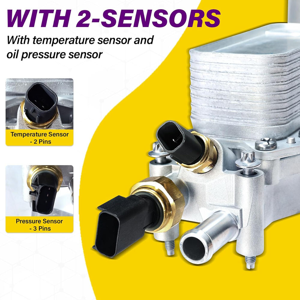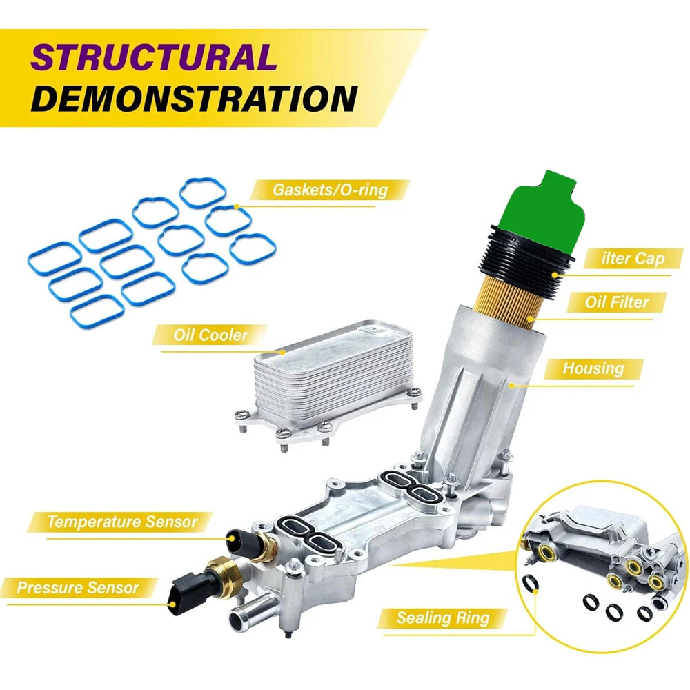 Product Description: Oil filter Housing in Upgrade Housing NOTE:Stop installing the plastic Oil filter adapter, you need to install new one immediately. OEM Part Number 926-959, 926-876, 5149062AA, 5149062AB, 5149077AB, 5149096AB, 5184294AC, 5184294AD, 5184294AE, 5184304AE, 5184304AF, 56044777AA, 68060337AA, 68105583AA, 68105583AB, 68105583AC, 68105583AD, 68105583AE, 68105583AF, 68105583AG, 68308741AA, 68308741AB, 68308741AC, 68308741AF, 68310865AA, 68310865AB, 68310865AC, 68310865AF, 68365925AA, 68365925AB, 68365925AC, 68365925AD, 68365931AA, 68365931AB, 68365931AD, 68596317AA. Fitment: Fit for V6 3.6L Pentastar Engine Fit for 2011-2016 Chrysler 200 Fit for 2011-2016 Chrysler 300 Fit for 2011-2016 Chrysler Town Country Fit for 2011-2014 Dodge Averger Fit for 2011-2016 Dodge Challenger Fit for 2011-2016 Dodge Charger Fit for 2011-2016 Dodge Durango Fit for 2011-2016 Dodge Grand Caravan Fit for 2011-2016 Dodge Journey Fit for 2011-2016 Jeep Grand Cherokee Fit for 2012-2016 Jeep Wrangler Fit for 2014-2016 Jeep Cherokee (3.2L) Fit for 2012-2013 Ram C/V Fit for 2013-2016 Ram 1500 Fit for 2014-2016 Ram Promater 1500 Fit for 2014-2016 Ram Promater 2500 Fit for 2014-2016 Ram Promater 3500 Read in detail below before you order it from us ✅ This is a full assembly oil filter assembly included; Upgrade Housing, Plastic Oil cap, oil filter, temperature switch, oil pressure sensor, oil cooler, 5 pcs bolts, manifold seals ✅ We tested the product 100% for leaking before shipping out ✅ Inspect all seals and O-ring carefully before installation. ✅ Clear any residues in the engine valley after the old oil filter adapter removed ✅Make sure the Housing seated fully in the engine valley, gap checking is necessary ✅ Insert the cooling pipe fully on the tube and put the clamp correctly. Sales Term: * Replacement for any shipping defects. * Our Warranty covers 1 years. * No reimbursements will be given for delay, labor, mileage, or any other cost involved in installation or re-installation of the auto parts in question Packge includues: Upgraded Metal Housing Plastic Oil cap, oil filter, temperature switch, oil pressure sensor, oil cooler, 5 pcs bolts, manifold seals Notes: Customer is responsible for shipping parts back for inspection and replacement. We provide part numbers and high resolution pictures. lease check part numbers and pictures for compatibility.Because this is a functional part, not a cosmetic part, the color of the cover is random, it does not affect the use, hope to understand.