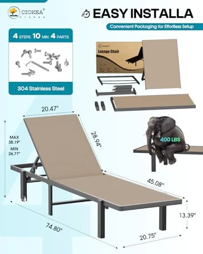 Item Weight: 21.8 pounds Reclining Position Count: 5 Recommended Uses For Product: Relaxing Item Width: 1 Manufacturer: Does Not Apply Age Range Description: Adult Furniture base movement: Glide Arm Style: Armless Tilting: No Is Foldable: No Brand: Does Not Apply UPC: Does Not Apply Fill Material: Foam Color: Khaki Shape: Rectangular prism Seat Depth: 11.9 inches Item Package Quantity: 1 gtin13: Does Not Apply Number of Height Positions: 5 Indoor Outdoor Usage: Outdoor Surface Recommendation: Hard Floor MPN: Does Not Apply Item Length: 1 Form Factor: Recliner Special Feature: Adjustable Backrest Furniture Finish: Aluminum Item Height: 1 Product Dimensions: 74.8"D x 22.8"W x 12.2"H Model Name: Aluminum Chaise Lounge Chair Outdoor Back Style: Solid Back Pattern: Solid Is Customizable: No Unit Count: 1.00 Count EAN: Does Not Apply Room Type: Patio Garden Product Care Instructions: Wipe Clean Type: Does Not Apply