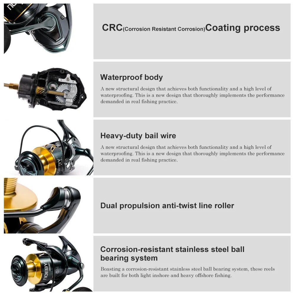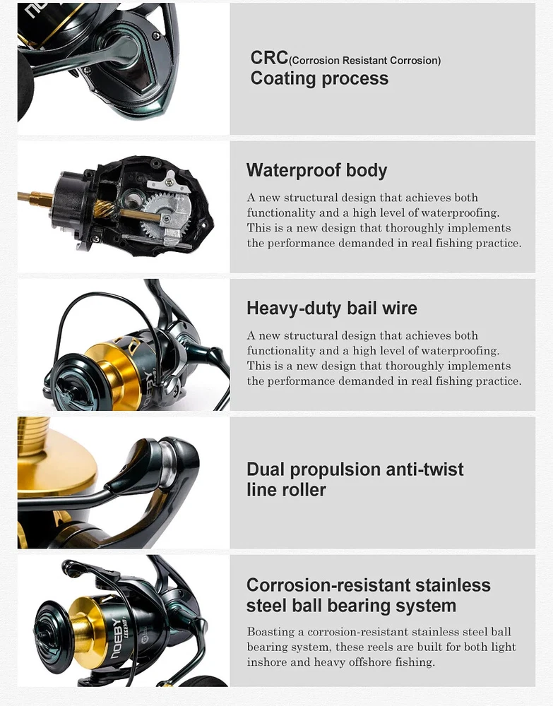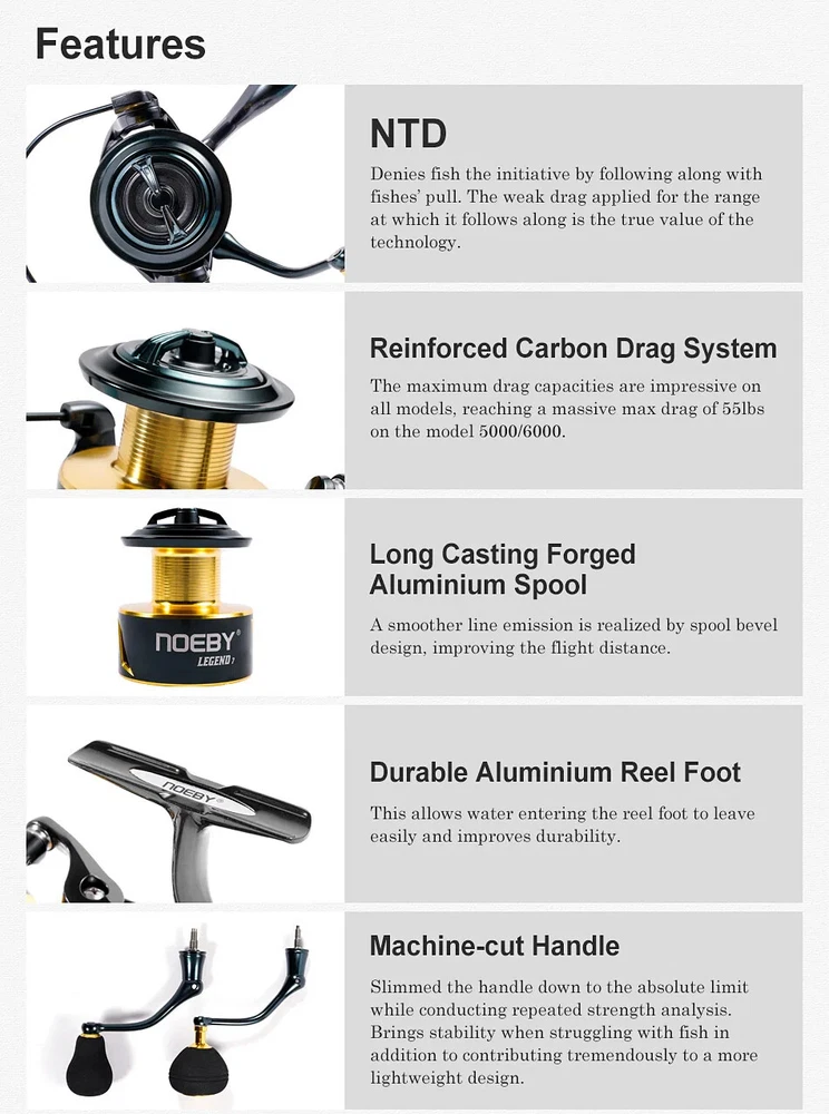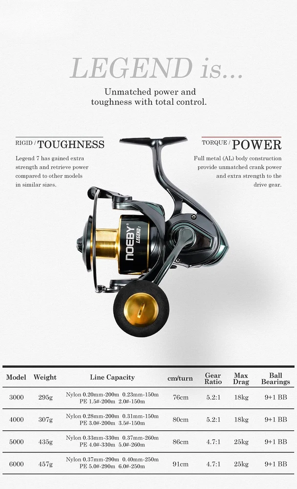 Noeby Spinning Fishing Reel 3000 4000 5000 6000 Aluminum Spool Gear Ratio 5.2:1 Zinc Alloy Gear Max Drag 18-25kg Fishing Reel Spool: 3000 4000 5000 6000 Weight: 295g 307g 435g 457g Line Capacity(3000 Series): PE1.5#200m, PE2.0#150m Line Capacity(4000 Series): PE3.0#200m, PE3.5#150m Line Capacity(5000 Series): PE4.0#330m, PE5.0#260m Line Capacity(6000 Series): PE5.0#290m, PE6.0#250m