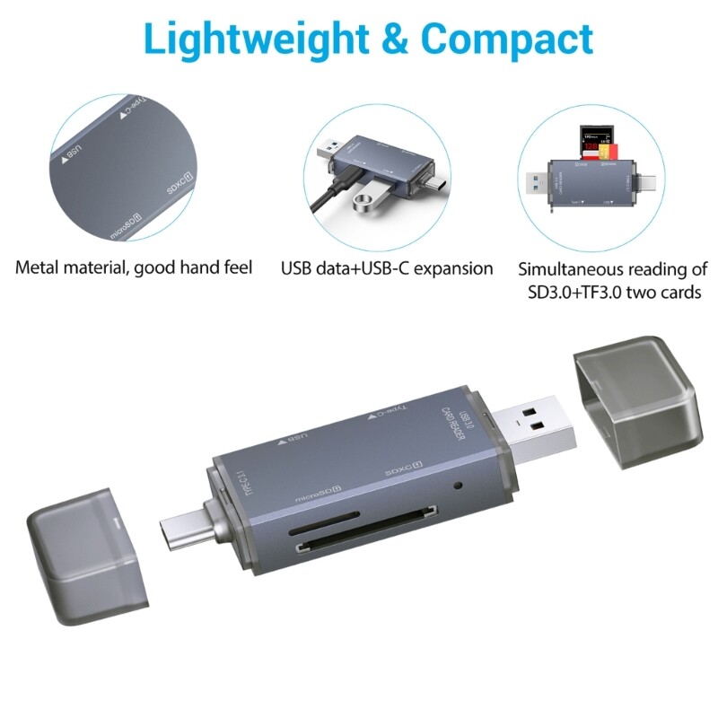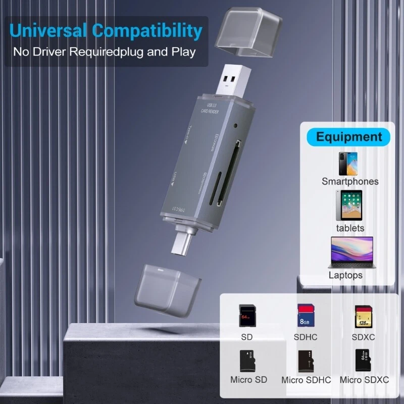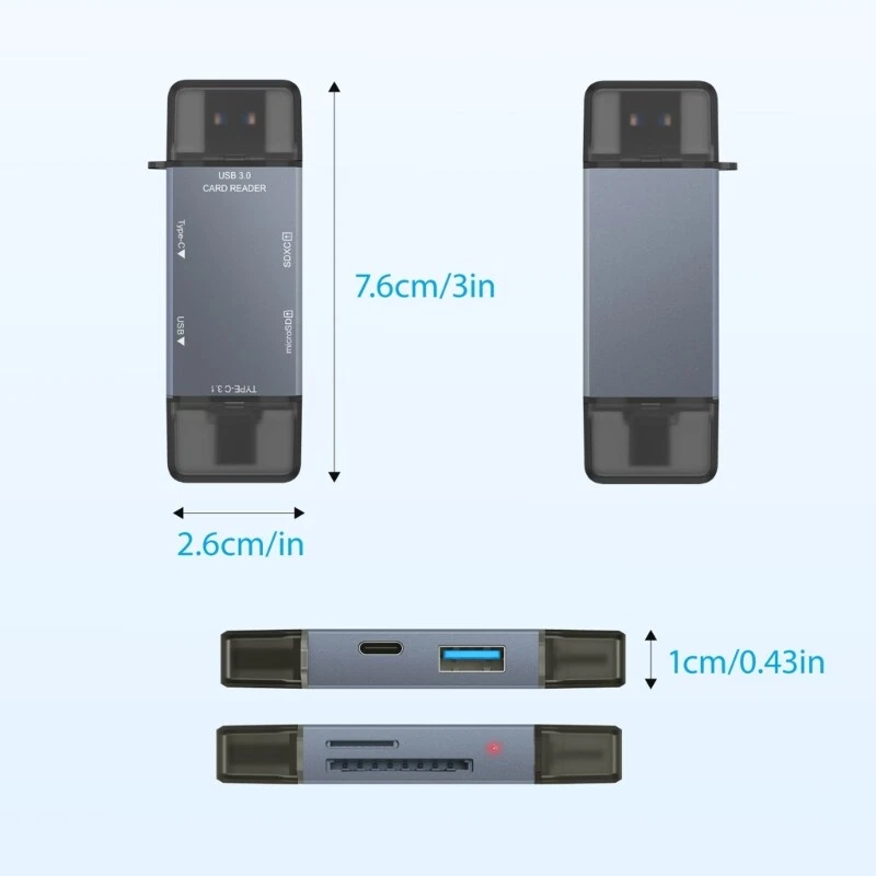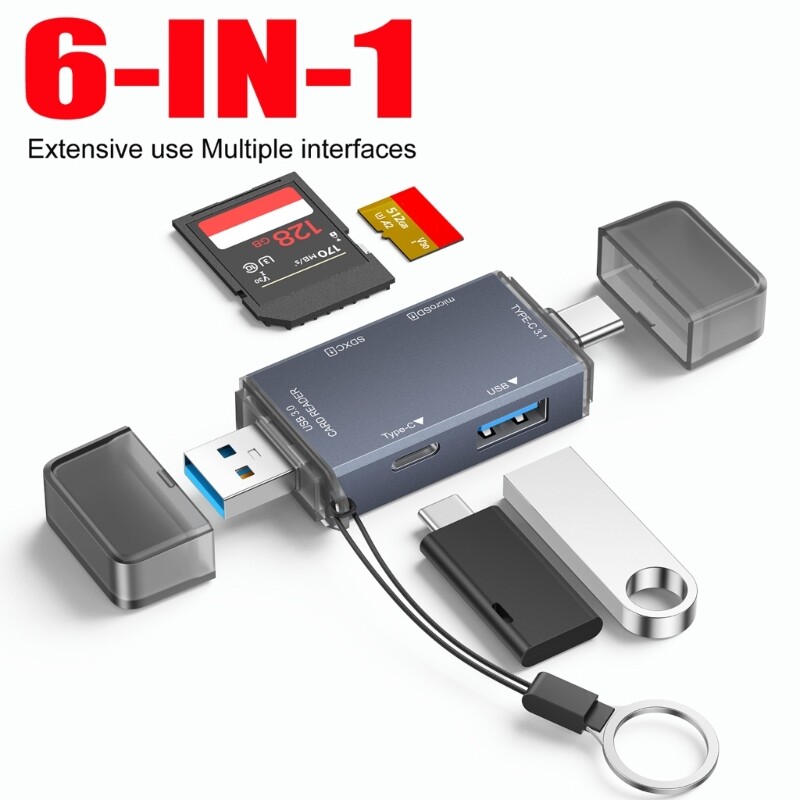 Features: Experience Connectivitys with 6 in 1 USB3.0 OTGs Adapter, featuring Port including Type C, USB A, USB C, HDMIcompatible, and SD3.0/TF3.0 card slots, for expanding devices capabilities. With USB support, enjoy rapid data transfer speeds up to 5Gbps, making it for transferring large files efficiently and enhancing productivity. for individuals, photographers, and who need data management on the go, this Adapter is accessory. for various scenarios such as travel, daily office use, or outdoor photography, ensures easy portability. from aluminum alloy, this Adapter not only offer performances but also withstands diverses, ensuring long use. Specifications: Materials: Aluminum alloy Size:7.6x2.6x1.1cm/3x1x0.4inch Package Includes: 1PC USB Card Reader note: Please allow 0-1cm error due to manual measurement. makes sure do not mind before bid. Due to the differences between different monitors, the picture may not reflect the actual of the item. Thank you!