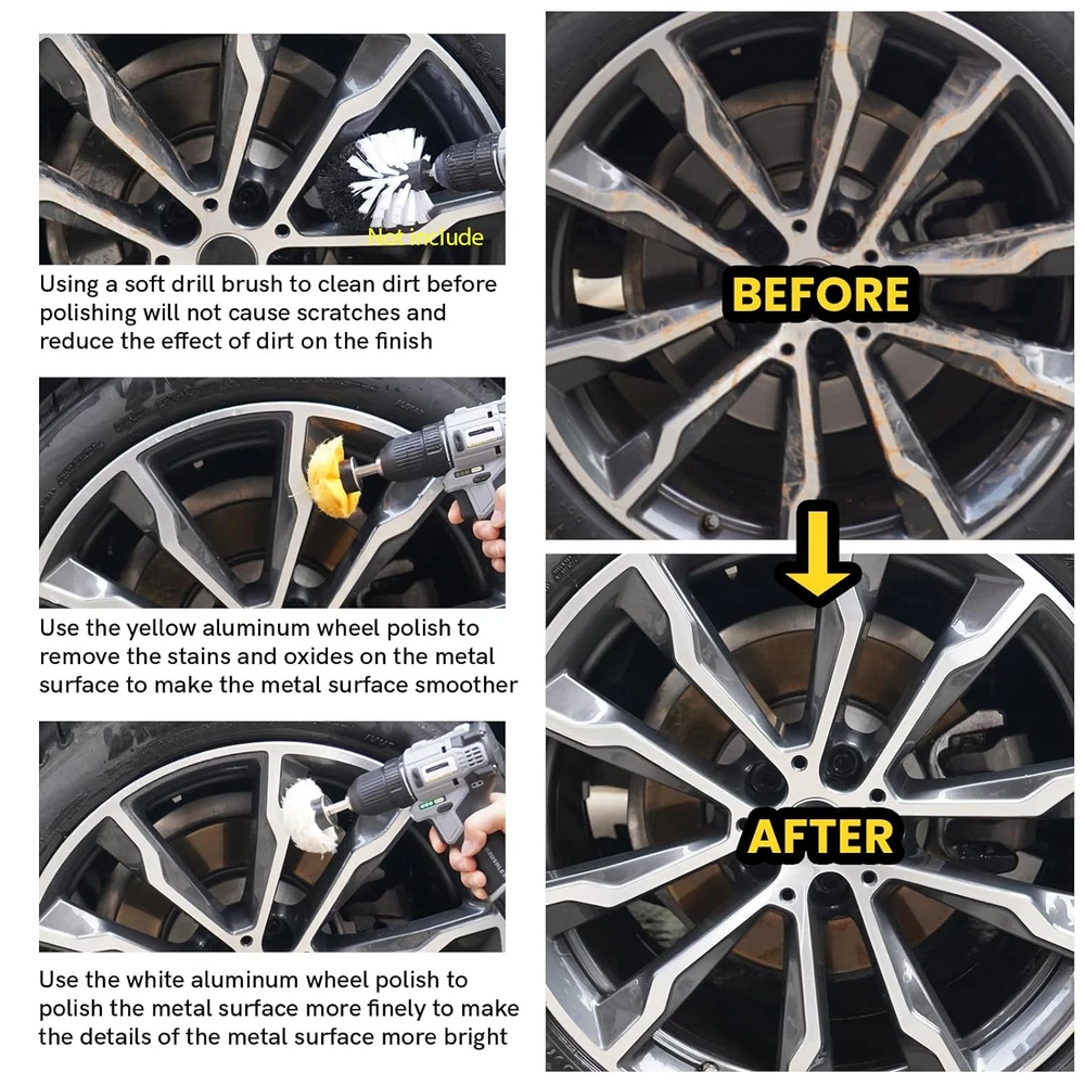 Aluminum Wheel Polishing Kit for Drill Buffing Wheel for Car Motorcycle Wheel Rim Manifold Polishing for Stainless Steel Chrome Wood Plastic Ceramic Glass Woods Machine Jewelry etc 6PCS Product Details Product Dimensions : 3.9 x 0.8 x 0.1 inches; 13.12 ounces Manufacturer : Unicaravan Country of Origin : China Grit Material: Aluminum Oxide Product Dimensions: 3.9"L x 0.8"W Brand: Unicaravan Compatible Devices: Drill Machines Grit Type: Fine 【Easy to Use】:First use the yellow aluminum wheel polish to remove the stains and oxides on the metal surface to make the metal surface smoother.Then use white the aluminum wheel polish to polish the metal surface more finely to make the details of the metal surface more bright. Yellow aluminum polishing wheel is suitable for large and localized metal polishing and sanding, such as car wheels, door handles, etc..White aluminum polishing wheel is suitable for polishing special metal materials, such as stainless steel and ceramics etc.. 【Widely Useful】:The drill polishing kit comes in a variety of shapes and can reach most places, cleaning surface dirt and effectively restoring surface luster. Suitable for interior, flat and irregular surfaces such as wheels, headlights, fenders, bumpers, etc. it can be used for metal aluminum, stainless steel, chrome wood, plastic, ceramics, glass, wood and so on. 【Package Included】:Total 6PCS ,Include Yellow polishing wheel (mushroom buffing wheels 65mm;T-shape buffing wheel 100mm;conical polishing wheels 30mm;) +White polishing wheel (mushroom buffing wheels 65mm;T-shape buffing wheel 100mm;conical polishing wheels 30mm;) 【Quality Material】:Made of high quality cotton material with multiple layers of fabric sewn in the center, wear-resistant and very good polishing effect.The polishing wheel is washable and reusable and when used, they will not scratch or damage the paint on surfaces. 【Professional After-sales Service]: If you have any questions about the Unicaravan Aluminum Wheel Polishing Kit For Drill, please contact us.We also offer super friendly customer service and lifetime technical support.