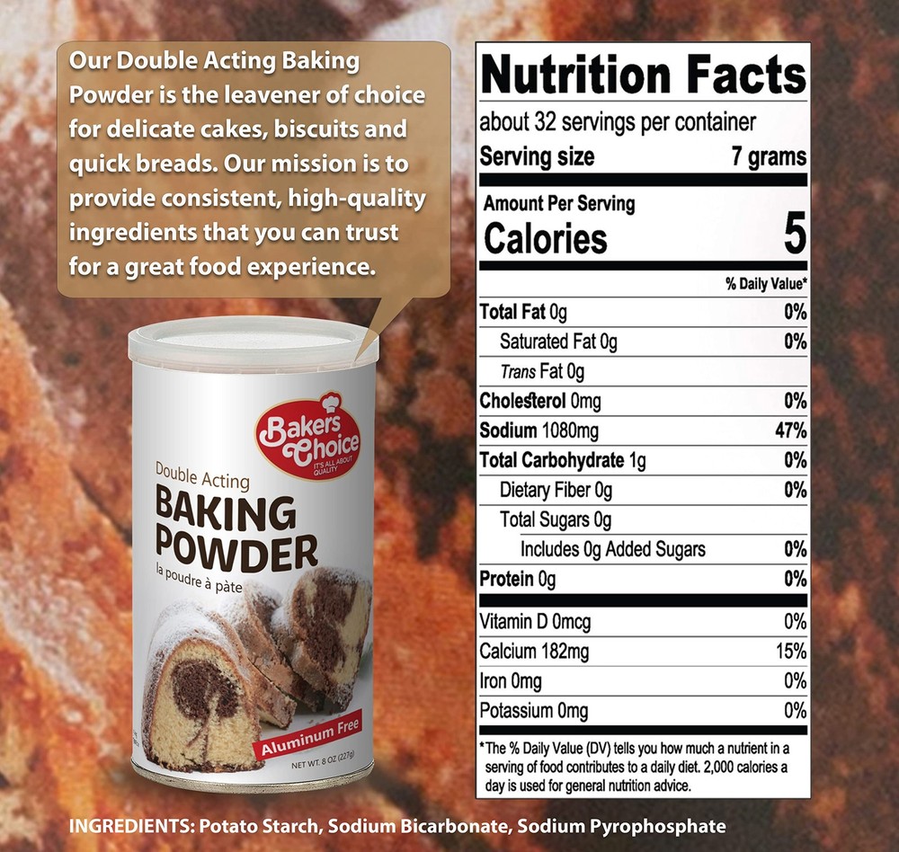 Double Acting Baking Powder, 8 oz. - Aluminum Free Baking Powder, Premium Grade, Vegan, Vegetarian, Kosher - By Baker’s Choice BAKING POWDER FOR COOKING: Our baking powder is perfect for pancakes, breads and others EASY TO USE: Our double acting baking powder makes it easy to bake VERSATILE & MULTIPURPOSE: Our gluten free baking powder is great for making desserts and treats ALUMINUM-FREE BAKING POWDER: Our high quality baking powder aluminum free is a must-have ingredient PREMIUM QUALITY: Baker’s Choice premium quality ingredients provide the best flavor and taste Bake everything to perfection with Baker’s Choice Sodium Free Baking Powder . It’s easy to use and versatile. Whip up some delicious baked goodies, our baking powder adds texture allows everything to bake evenly. Add it to your signature recipes and keep it stored in your kitchen. It creates consistently delicious baked goods with uniform texture. This double acting baking powder provides an exquisite crumb texture. A little bit goes a long way. When a recipe calls for baking powder you’ll want to choose Bakers Choice premium quality aluminum free baking powder. You’re not baking right if you’re not using Baker’s Choice! PRODUCT FEATURES: 8 Ounce Can Certified Kosher Aluminum Free EASY TO USE AND VERSATILE Make it your way! Our baking powder can be used to make a wide variety of baked goods and treats like biscuits and cookies. It’s exactly what you need for recipes that require baking powder. It’s easy to mix in with other ingredients and it adds texture to baked treats. It’s a must-have for professional and amateur chefs or bakers. It comes packaged in a convenient can that preserves freshness and makes it easy to in kitchen pantries or cabinets. It’s easy to measure just the right amount of this essential baking ingredient ABOUT US At Baker’s Choice, we believe it’s all about quality. Established in 1997, we’ve been working hard to provide ready-made baking ingredients for our customers. We source the globe for a unique variety of premium quality ingredients to make our toppings and dessert decorations. You can count on our fresh ingredients to make your signature treats even more delicious. Choose Baker’s Choice, where customer satisfaction is our top priority. Shipping We ship within Three business days of payment, usually sooner. We use a selection of shipping services such as UPS, FedEx, USPS etc. We only ship to the lower 48 states, no APO/FPO addresses or PO Boxes allowed. Local pickups and combined shipping options are not provided at this time. Return You can return a product for up to 30 days from the date you purchased it. Any product you return must be in the same condition you received it and in the original packaging. Please keep the receipt. Payment We accept payment by any of the following methods: PayPal Please pay as soon as possible after winning an auction, as that will allow us to post your item to you sooner! Feedback Customer satisfaction is very important to us. If you have any problem with your order, please contact us and we will do our best to make you satisfied. Contact Us If you have any queries, please contact us via ebay. We usually respond within 24 hours on weekdays. Please visit our eBay store to check out other items for sale! Thank you for shopping at our store.