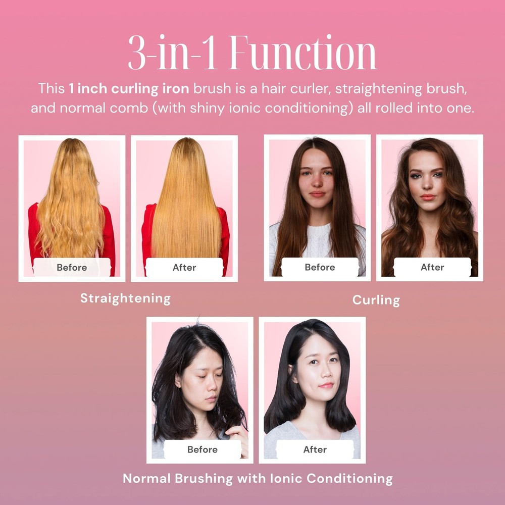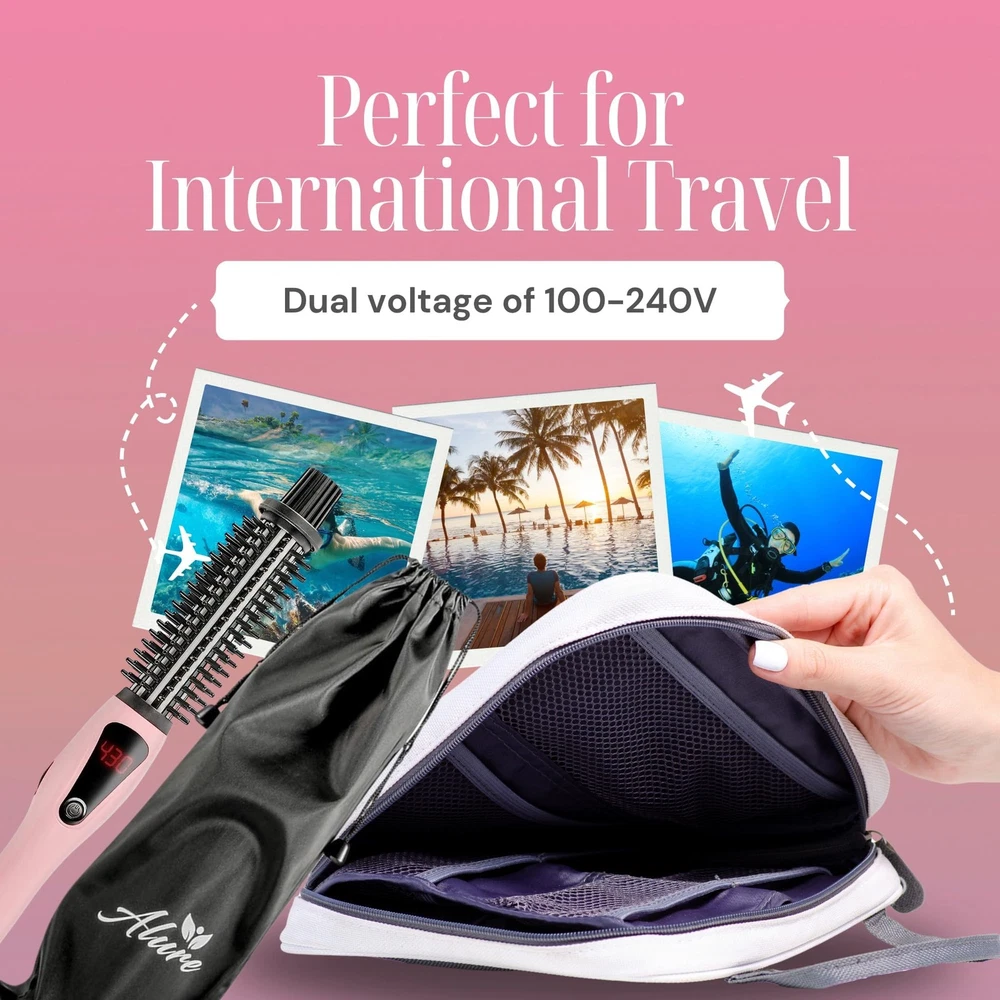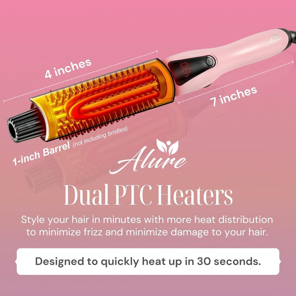 Experience worry-free styling with Alure's 1-inch curling iron brush, prioritizing safety with anti-scald nylon bristles and a cool-touch handle, allowing you to reach temperatures up to 430F without the risk of burns. This 3-in-1 styling essential seamlessly combines a curler, straightening brush, and ionic conditioning comb, providing unmatched flexibility and convenience. Effortlessly style all hair types with the adjustable temperature (265F to 430F) and revel in swift 30-second heat-up time for salon-quality results. Achieve enduring, glossy curls as the ceramic-coated barrel releases anti-frizz negative ions, preventing tangling and ensuring even heat distribution. With an intuitive design, easily adjust the temperature using a simple knob, monitor settings on the LED display, and enjoy safety features like a 60-minute auto shut-off and 3-second temperature lock for a professional touch in the comfort of your home. Elevate your hairstyling routine with Alure, the perfect alternative to popular thermal brushes and curling irons on the market. CURL THE SAFE WAY: Unlike other hair curlers that result in burnt fingers and scalded scalps, our hot curling brush comes with anti-scald nylon bristles and a long cool-touch handle. This means you get to turn up the heat up to 430F for professional results without dealing with nasty burns. 3-IN-1 VERSATILITY: This 1 inch curling iron brush is a hair curler, straightening brush, and normal comb (with shiny ionic conditioning) all rolled into one. FOR ALL HAIR TYPES: The variable temperature of 265F to 430F safely & precisely styles all hair types: fine, normal, or thick. You’ll also love the extra-fast 30-second heat-up. FRIZZ-FREE, LUSTROUS CURLS: Revel in enduring, glossy curls. The ceramic-coated barrel of our Alure hot curling brush releases anti-frizz negative ions, preventing tangling and ensuring even heat distribution for smooth, silky locks. INTUITIVE AND SECURE: Easily adjust the temperature with a straightforward knob, monitor settings on the LED display, and benefit from safety features including a 60-minute auto shut-off and a 3-second temperature lock. Ideal for achieving salon-quality styling. NOTE TO CUSTOMERS: This curler comes with a temperature auto-lock feature that prevents accidental changing of the temperature setting during use. This is indicated by the "LOC" message on the display. To unlock, simply double-press the power button.