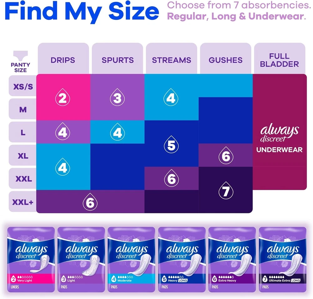 About this item Absorbent RapidDry Core holds up to 5x the average leak for bladder leak protection Thin, flexible bladder control pads contour to your natural shape for a discreet, barely noticeable fit LeakGuards help keep wetness away from the edges Exclusive OdorLock Technology neutralizes odors from incontinence instantly and continuously Find the right pad size for you using the Always Discreet My Fit size chart Postpartum and bladder leak pads available in bulk for added convenience and protection you deserve Incontinence pads and pantiliners for women are FSA and HSA eligible. Product Description Looking for incredibly strong bladder leak protection that's barely noticeable under clothes? Experience incredible bladder leak and postpartum protection in a surprisingly thin and discreet incontinence pad. Always Discreet Incontinence Pads for women provide the comfort you need with up to the 100% leak-free protection you deserve. Thanks to a unique absorbent core that keeps your skin dry by absorbing bladder leaks in seconds, you’ll be able to stay comfortable and feel fresh for hours. Walk with poise and confidence knowing two RapidDry layers form a boosted protection zone in the center of the pad that holds up to 5x the average leak, giving you extra bladder control protection where you need it most. The LeakGuards help keep wetness away from the sides and prevent run-offs at the edges where unexpected leaks tend to occur, while the lightly scented OdorLock technology neutralizes odors instantly and continuously. Don’t let bladder leaks get in the way of your day. Simply find your right size with the Always Discreet My Fit chart and get the bladder control pads for women with protection you can depend on. Incontinence liners, bladder leak pads for women, maxipads, and pantiliners are FSA and HSA eligible. Always Discreet Incontinence Pads are available in bulk for added convenience. On Oct 30, 2025 at 00:14:57 PDT, seller added the following information: On Nov 26, 2025 at 23:45:45 PST, seller added the following information: