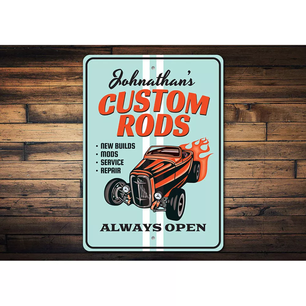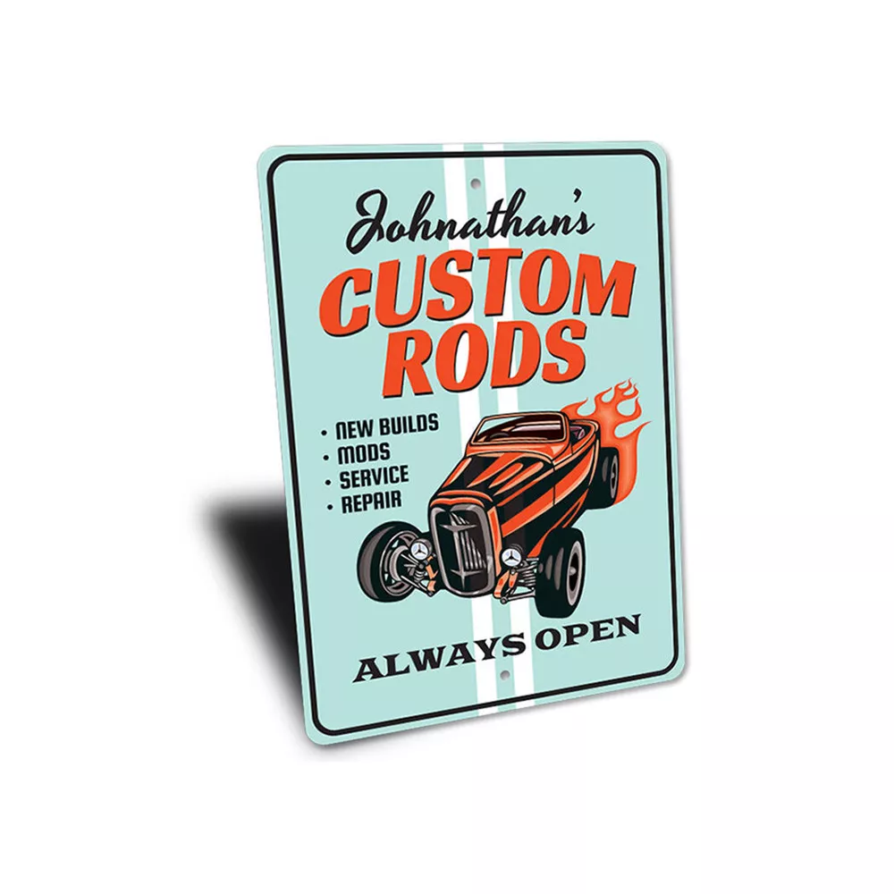 The Lizton Sign Shop Product Description Always Open, Custom Rods Shop Aluminum Sign **there may be slight variations in color and text spacing, however your sign will be very similar to the image above. Quality Aluminum Street Signs Sign Information Aluminum Brand New Sign Comes with rounded corners and pre-drilled for easy hanging. We use the highest quality materials - 100% USA-made! Great Gift Idea - Our signs truly make a one of a kind gift. Personalize the sign with the text you want to add. Custom text for the sign can be sent to us via email. A BRAND NEW SIGN!! All of our street signs are made of premium materials. The sign itself is made of aluminum and will never rust providing years of enjoyment indoors and outdoors. No Cheap plastic!! The Lizton Sign Shop specializes in quality personalized custom aluminum signs for any occasion. These make the perfect sign for any man cave, office, basement, garage, college dorm, kids bedroom, game room, bar, pub, tavern or countless other places. *Colors may vary slightly from one computer screen to the next but the image should be very close. All content and designs are subject to copyright and may not be reproduced in any form. Payment Methods We would prefer payment to be made through paypal but we also accept all major credit cards. If you select the credit card option please contact us after you make your purchase and we can walk you through the steps to make a secure payment. Return Policies We will accept returns within 30 days of the purchase date. The buyer is responsible for any costs to return the item or items. Returns will only be accepted for items that were damaged in shipping or if we made an error in the manufacturing of your item, i.e. spelling error.