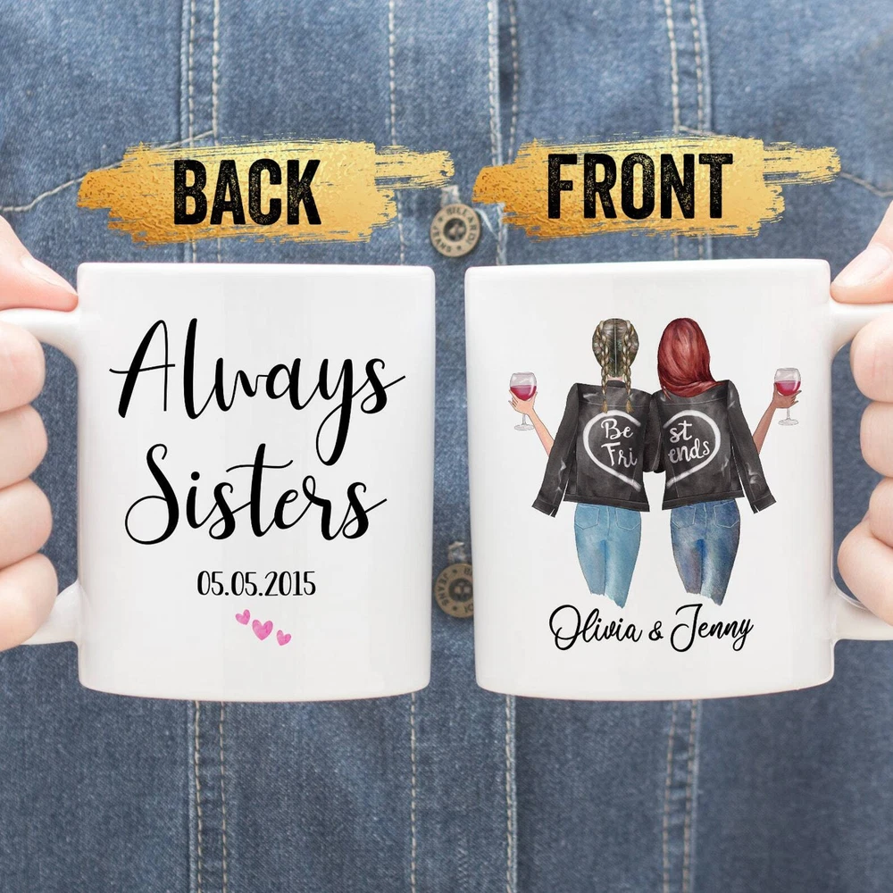 Always Sisters Mug Personalized Best Friend Mug Bestie Mugs Best Friend Mug Bff Product Details.. This high quality 11oz. ceramic white mug has a premium hard coat that provides crisp and vibrant color reproduction sure to last for years. Perfect for all hot & cold beverages. The highest quality printing possible is used. It will never fade no matter how many times you wash it. Material: 100% Ceramic. Print both sides. Dishwasher and Microwave Safe. High Gloss + Premium White Finish. Printed in the U.S.A. Personalized & Custom. We support personalized and custom mug to add custom, when placing an order, you can add notes to the "order note" in shipping address section. Also you can contact us directly via message. Shipping Info. Ready to ship in 1 to 2 business days, All products are made-to-order and proudly printed in the United States. Shipped by USPS and DHL, You will receive your order in 5-7 days. Replace & Refund. All products are defective during shipping broken, chipped will be replaced free of charge. You are not satisfied with the product, we will refund 100% money to you. If any other issues arise, please do not hesitate to message, we would be more than happy to assist you.