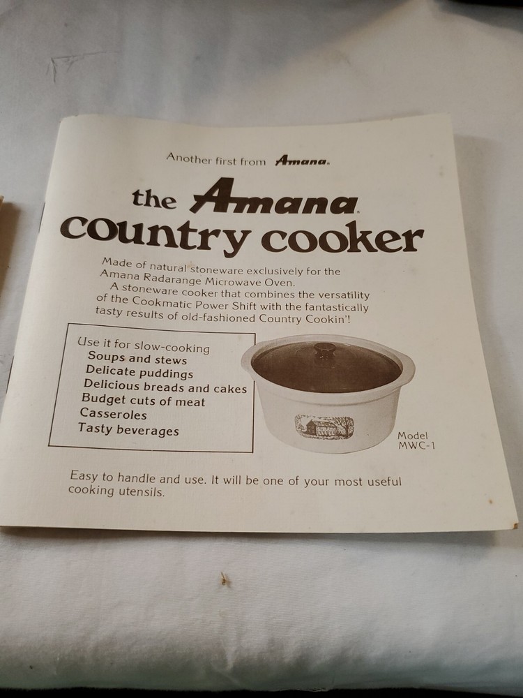 THANK YOU FOR VISITING OUR STORE. WE SHIP 6 DAYS A WEEK (UNLESS THERE IS A FEDERAL HOLIDAY). MOST ITEMS WILL SHIP IN A STURDY BOX AS NEEDED. PLEASE FEEL FREE TO REACH OUT IF YOU HAVE ANY QUESTIONS. The box was only opened for pictures. Never used. Add a touch of rustic charm to your kitchen with the Amana Country Cooker MWC-1 Stoneware Crock Pot Dutch Oven. This versatile piece of cookware is perfect for those who love easy and convenient cooking. Made of high-quality ceramic material and microwaveable, this Amana cooker is designed to offer you an effortless cooking experience. The Amana Country Cooker MWC-1 Stoneware Crock Pot Dutch Oven is compatible with electric stoves and is manufactured in the United States. With its unique features and brand name, this microwave safe cooking pot is a great addition to your kitchen. Get yours today and enjoy the convenience of cooking with Amana!