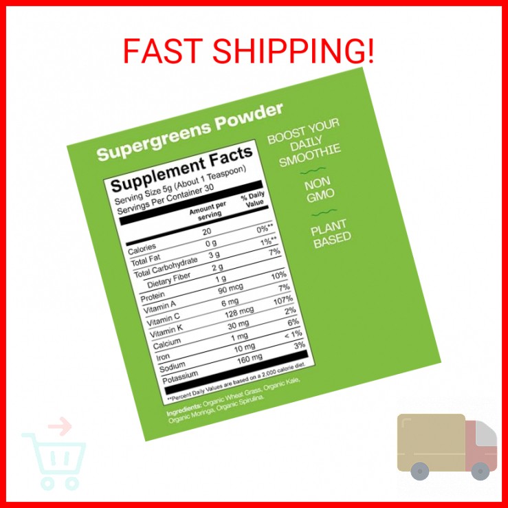 Amazing Grass Super Greens Booster: Greens Powder Smoothie Mix with Spirulina, Moringa, Wheat Grass & Kale Smoothie Booster, Chlorophyll Providing Greens, 30 Servings - SUPPORTS OVERALL HEALTH & WELLNESS: One serving of Amazing Grass Super Greens delivers a nutritious blend of key nutrients, minerals, and natural levels of chlorophyll to help you supercharge your health. - FOUR SUPERFOODS: Our Super Greens Powder thoughtfully blends chlorophyll rich wheat grass, Vitamin A & K dense kale, the natural occurring minerals from moringa & the essential amino acids from spirulina for daily support to help you feel amazing. - SUPERCHARGE YOUR SMOOTHIE: Intentionally crafted with organic ingredients to boost your healthy routine, our Super Greens Smoothie Booster delivers a serious nutrition kick in the convenience of a resealable bag, helping you achieve your daily recommended servings of veggies without the worry of produce going bad. - ONE SCOOP A DAY: With 1.5 servings of greens packed into each teaspoon, it's never been easier to incorporate an extra nutritious boost into your day. Try adding a scoop to your favorite smoothie recipe to recharge your daily routine! - CLEAN AND GREEN: Made with ingredients you can trust, our Super Greens are Certified Organic by CCOF, Sugar Free, Gluten Free, Plant Based, Kosher and Non GMO. Payments We accept the following payment methods PayPal Support Our dedicated customer support team is here to assist you from 9AM to 5PM Monday through Friday, excluding public holidays. Should you reach out to us and not recieve an immediate response, it's likely due to a higher-than-usual volume of inquires. We want to reassure you that your concerns are important to us, and we're working dilligently to get back to you. Expect a response by the next business day at the latest. Your understanding and patience are greatly valued as we strive to provide you with the best support possible! Shipping All orders are processed within 5 business days. Shipping estimates may be shown on this listing by eBay, and these are often not an accurate reflection of our shipping times. If we are experiencing a high volume of orders, shipments may be delayed by a few days. Please allow additional days in transit for delivery. If there will be a significant delay in shipment of your order, we will contact you via message. Shipping rates & delivery estimates Shipping is often free, but if charges for your order apply they will be calculated and displayed at checkout.