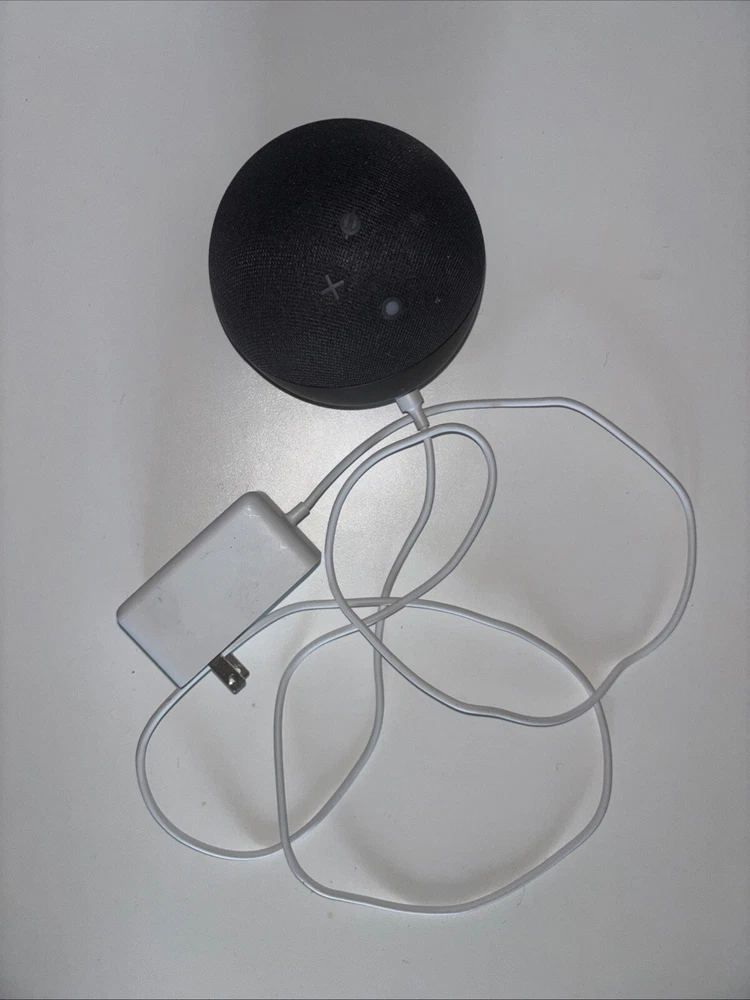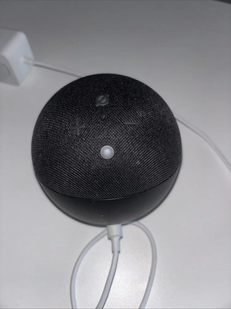 The Amazon Echo Dot 5th Gen. Smart Speaker in Charcoal is a black sphere-shaped smart speaker from Amazon's brand. It was manufactured in 2022 and features Bluetooth and Wi-Fi connectivity. This model is compatible with Alexa for smart home integration.