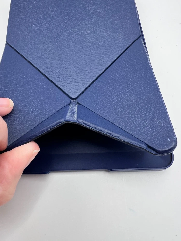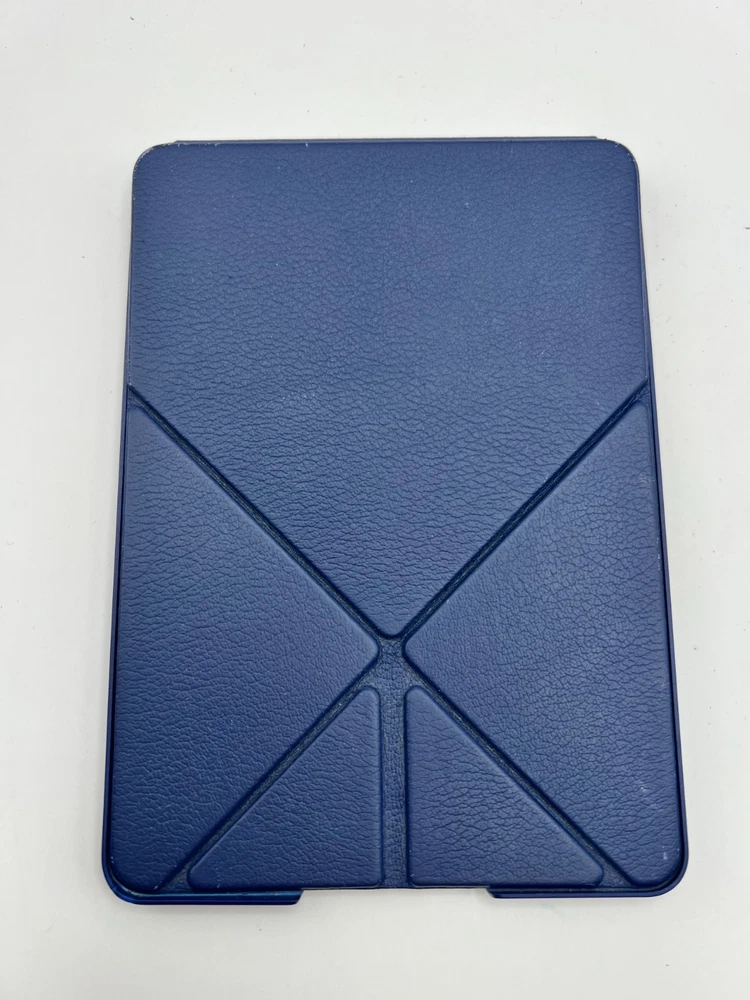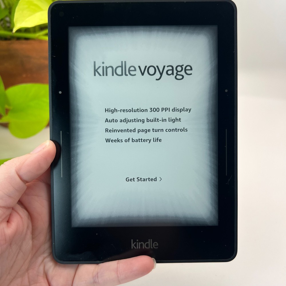 This Amazon Kindle Voyage e-reader is a highly regarded discontinued model known for its sharp 300 PPI display and intuitive page press sensors. The Voyage features an adaptive front light that automatically adjusts to ambient lighting, making it comfortable to read in both bright and low-light environments. Many Kindle users still consider this model a favorite due to its slim profile, premium screen clarity, and tactile page-turn controls. The device powers on properly and presents the setup screen. A blue origami-style protective case is included.