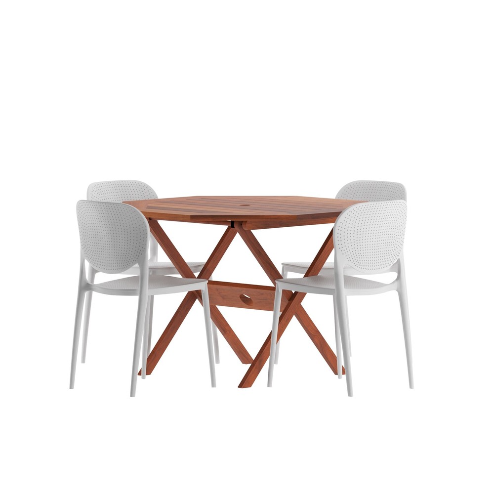 Upgrade your outdoor dining experience with the Amazonia Outdoor Patio 5pc Panther Bistro Set. This luxurious set features a 100% FSC certified eucalyptus wood table and four white resin arm chairs that are stackable for easy storage. The table is designed with a 2" umbrella hole and measures 29"L x 43"W x 47"H while the chairs measure 18"L x 20"W x 32"H. Enjoy quality and comfort with this patio dining set.Features: 1 Brown Table & 4 White Arm Chairs Stackable Chairs for Easy Storage 100% FSC Eucalyptus Wood Table High Quality Resin Chairs 2" Umbrella HoleAdditional Details: Table Dimensions: 29"L x 43"W x 47"H Chair Dimensions: 18"L x 20"W x 32"H Assembly Required for Table Free Shipping Over $49.99* Details Amazonia Outdoor Patio 5pc Panther Bistro Set Product Description: Upgrade your outdoor dining experience with the Amazonia Outdoor Patio 5pc Panther Bistro Set. This luxurious set features a 100% FSC certified eucalyptus wood table and four white resin arm chairs that are stackable for easy storage. The table is designed with a 2" umbrella hole and measures 29"L x 43"W x 47"H while the chairs measure 18"L x 20"W x 32"H. Enjoy quality and comfort with this patio dining set. Features: 1 Brown Table & 4 White Arm Chairs Stackable Chairs for Easy Storage 100% FSC Eucalyptus Wood Table High Quality Resin Chairs 2" Umbrella Hole Additional Details: Table Dimensions29"L x 43"W x 47"H Chair Dimensions18"L x 20"W x 32"H Assembly Required for Table