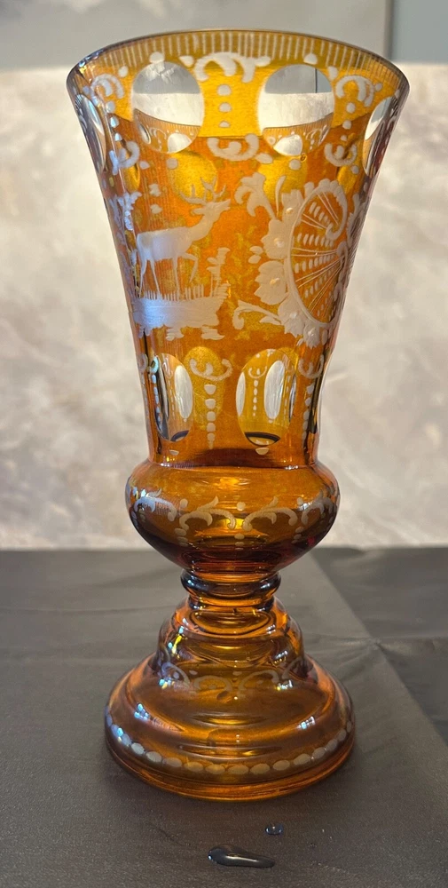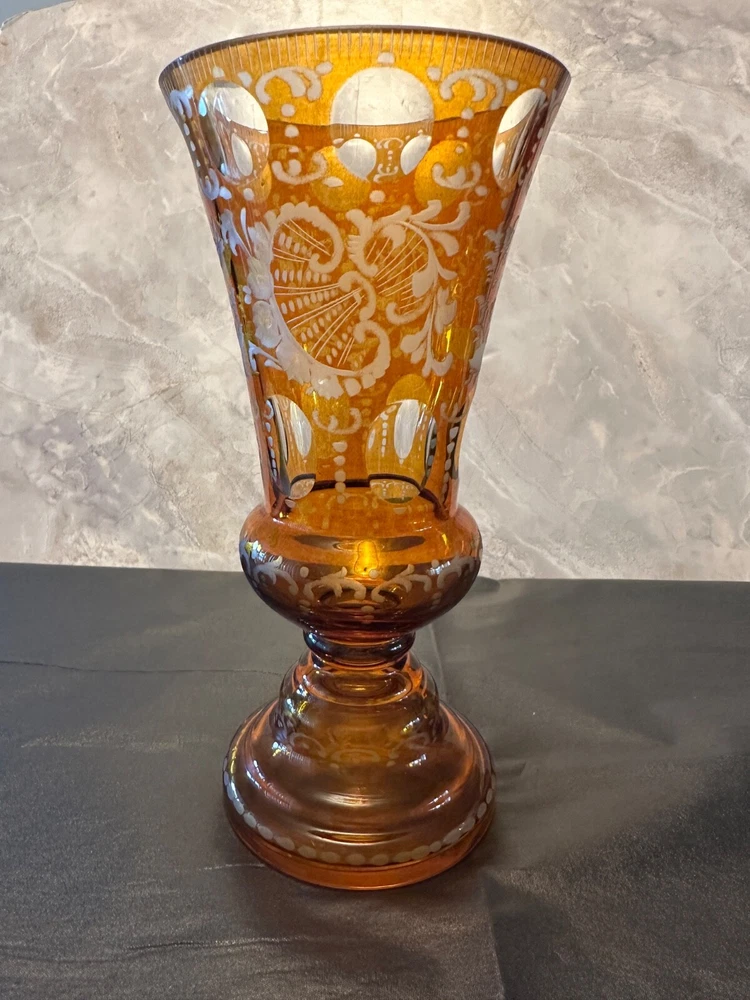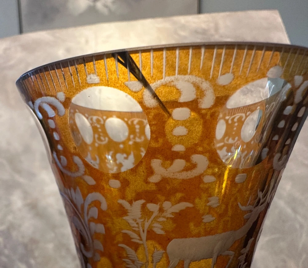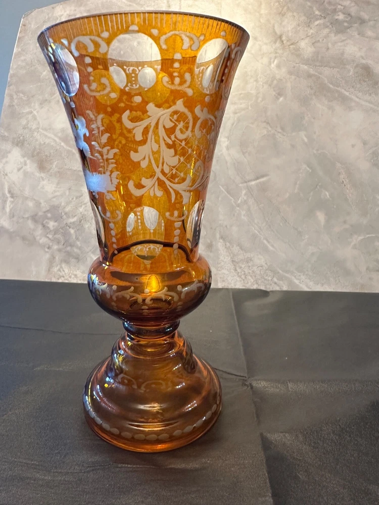 Storage unit find. I do not know much about it other than it’s an Egermann Amber Etched Vase. Has a small Chip on the rim and the bottom of the vase has scratch marks , looks like from it being moved around. Would love to keep but I do not have the room for it. Sold as is review pictures for additional details.