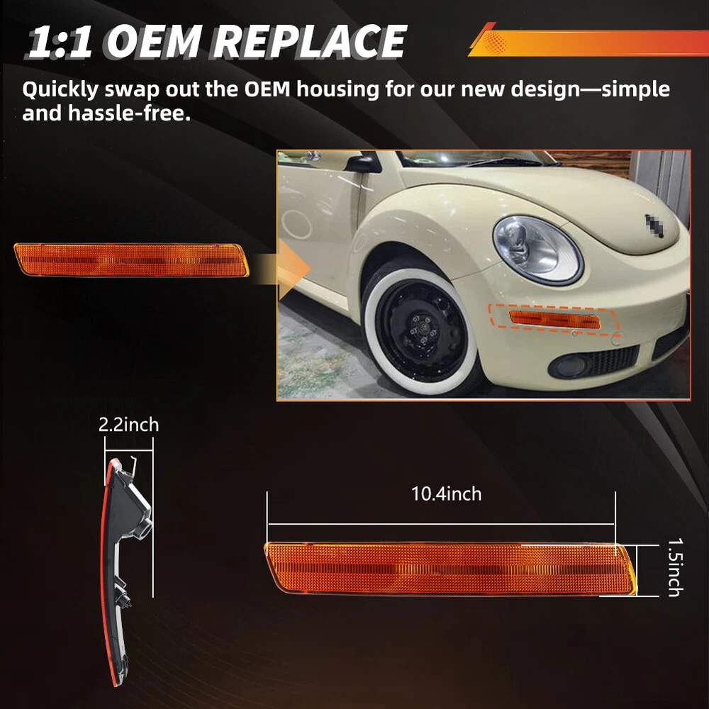 Product Detail Copyright©MotoringPlus Details This page features One Pair (2 Pieces) OEM-Spec Amber Lens Front Bumper Turn Signal Lights Kit For 2006-2010 Volkswagen Beetle These lamps are made with high-quality Polymethy l Methacrylate (PMMA) and Polycarbonate (PC) plastics No modification required! Each piece is easy to install with an OEM fit, Instantly transform your car and give it a modern and trendy appearance and feel! Note: Bulbs & socket adapters are NOT included Specifications: 100% Brand new and quality Lens Color: Amber A complete set of two lamps, replacement for the driver side & passenger sides Compatible With 2006-2010 Volkswagen Beetle Directly replace or repair your car's front bumper turn signal lamps CE DOT SAE approved Application: For 2006 2007 2008 2009 2010 Volkswagen Beetle Replace OEM # 1C0953042R-PFM, 1C0953041R-PFM and Partslink#: VW2530109, VW2531109 Please make sure you have available space in your car for these lamps to fit before placing or der. Package include: 2PCS Driver & Passenger side Front Bumper Turn Signal Lights (Amber Lens) Installation: Direct replacement the OEM parts without any modification needed Note: Professional installation is highly recommended! Returns Policy Shipping Policy Payment Method About US Contact Us Returns Policy Please check actual stock bulb model & housing size before purchasing replacement bulbs. Compatibility list on eBay listing is not a complete list and it is a known issue that there are errors on it. Half year warranty from the purchased date. Please contact us via ebay message before returning the defectived item. Our warranty does not extended to any products that are physically damaged or that are not under normal operating conditions as a result of misuse or improper installation on the buyers/user's part. Return items should include the original packaging and all accessories. Buyers MUST contact us for the returning address. In all cases, buyers pay shipping fees at their own cost to return products for exchange or refund. We will be responsible for the postage of replacements. Refund will be made upon receipt of the returned item. Our goal is to make sure you are a happy buyer and pleasant shopping with us. If you have any problems, please contact us immediately before leaving us any negative or neutral feedback. We understand the concerns and frustrations you might have, and will do our endeavor to resolve the issues. Please give us the opportunity to resolve any problem. Shipping Policy Item will be shipped from China / Hongkong Post by Standard International Post. All orders will be shipped to buyer's paypal shipping address within 24 hours after receiving your verified payment (Excluding Weekends and Public Holidays) International order may takes about 15-25 business day delivery time for most countries. Transactions on weekends or public holidays,item will be sent later on work time. Payment Method We accept Paypal ONLY. Unpaid transaction will be cancelled after 8 days About US Contact Us We are dedicated to providing you the best shopping experience and high quality items at a very low price. If you are satisfied with our service,Please remember to leave us 5 STAR for All Detailed Seller Ratings If you found any problem/issue of our merchandise/service,please let us know before leaving any negative feedback! Please feel free to contact us if you have any question. Any message will be replied within 24 hours. We will try our best to help! Home Payment Shipping About us Contact us Copyright©MotoringPlus Home Payment Shipping About us Contact us Store Categories Store Categories SIDE MARKER LIGHT TURN SIGNAL LIGHT TAIL BRAKE LIGHT LICENSE PLATE LIGHT DECODER OTHERS Other Product Detail Copyright©OFFKAT Why Buy From Us Why Buy From Us Details This page features One Pair (2 Pieces) OEM-Spec Amber Lens Front Bumper Turn Signal Lights Kit For 2006-2010 Volkswagen Beetle These lamps are made with high-quality Polymethy l Methacrylate (PMMA) and Polycarbonate (PC) plastics No modification required! Each piece is easy to install with an OEM fit, Instantly transform your car and give it a modern and trendy appearance and feel! Note: Bulbs & socket adapters are NOT included Specifications: 100% Brand new and quality Lens Color: Amber A complete set of two lamps, replacement for the driver side & passenger sides Compatible With 2006-2010 Volkswagen Beetle Directly replace or repair your car's front bumper turn signal lamps CE DOT SAE approved Application: For 2006 2007 2008 2009 2010 Volkswagen Beetle Replace OEM # 1C0953042R-PFM, 1C0953041R-PFM and Partslink#: VW2530109, VW2531109 Please make sure you have available space in your car for these lamps to fit before placing or der. Package include: 2PCS Driver & Passenger side Front Bumper Turn Signal Lights (Amber Lens) Installation: Direct replacement the OEM parts without any modification needed Note: Professional installation is highly recommended! Returns Policy Shipping Policy Payment Method About US Contact Us Returns Policy Our 60-day Satisfaction Guarantee assures our customers that they will receive all orders promptly and exactly as described. In addition, it allows customers to return new and unused products in their original factory condition for any reason within 60 days from the date of purchase. Buyers are responsible for appropriate packing, returning shipping cost, insurance and returning the item in "new" condition. Used items will not be accepted for return. We will replace the returning item with an identical item, issue a full store credit or a full refund. Our goal is to make sure you are a happy buyer and pleasant shopping with us. If you have any problems, please contact us immediately before leaving us any negative or neutral feedback. We understand the concerns and frustrations you might have, and will do our endeavor to resolve the issues. Please give us the opportunity to resolve any problem. Shipping Policy We only ship to paypal con