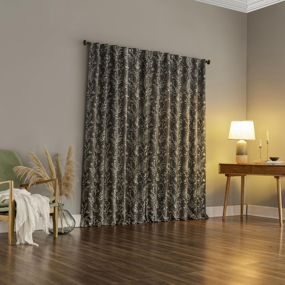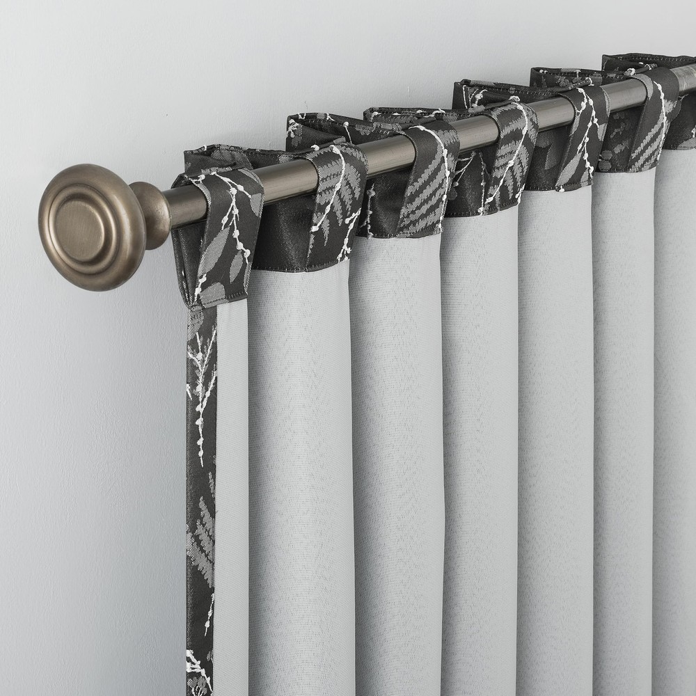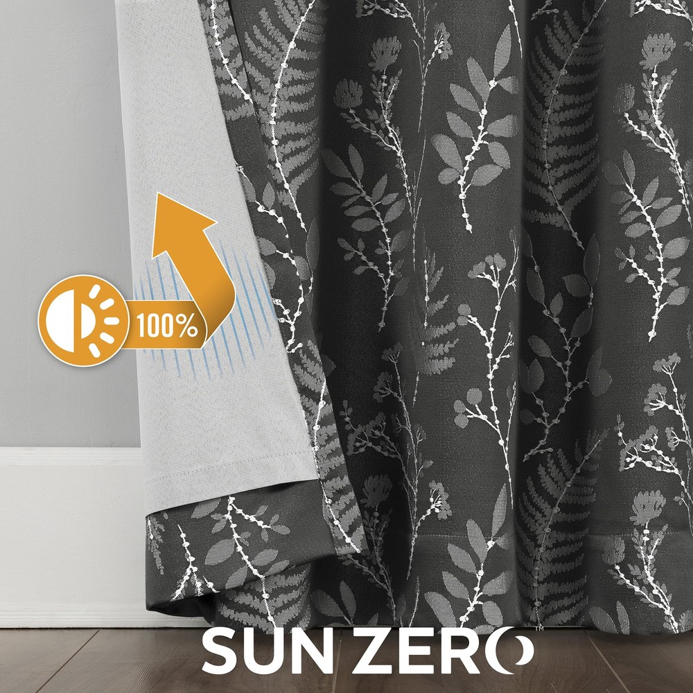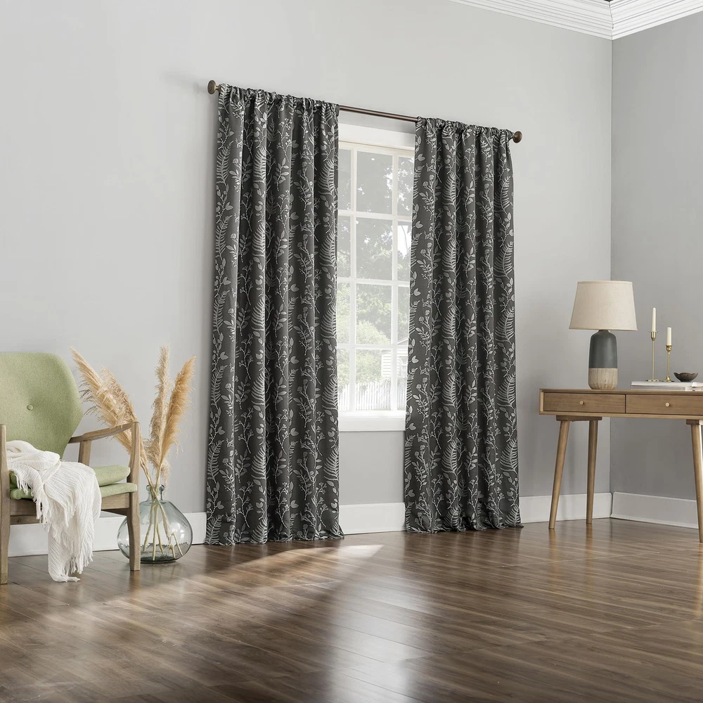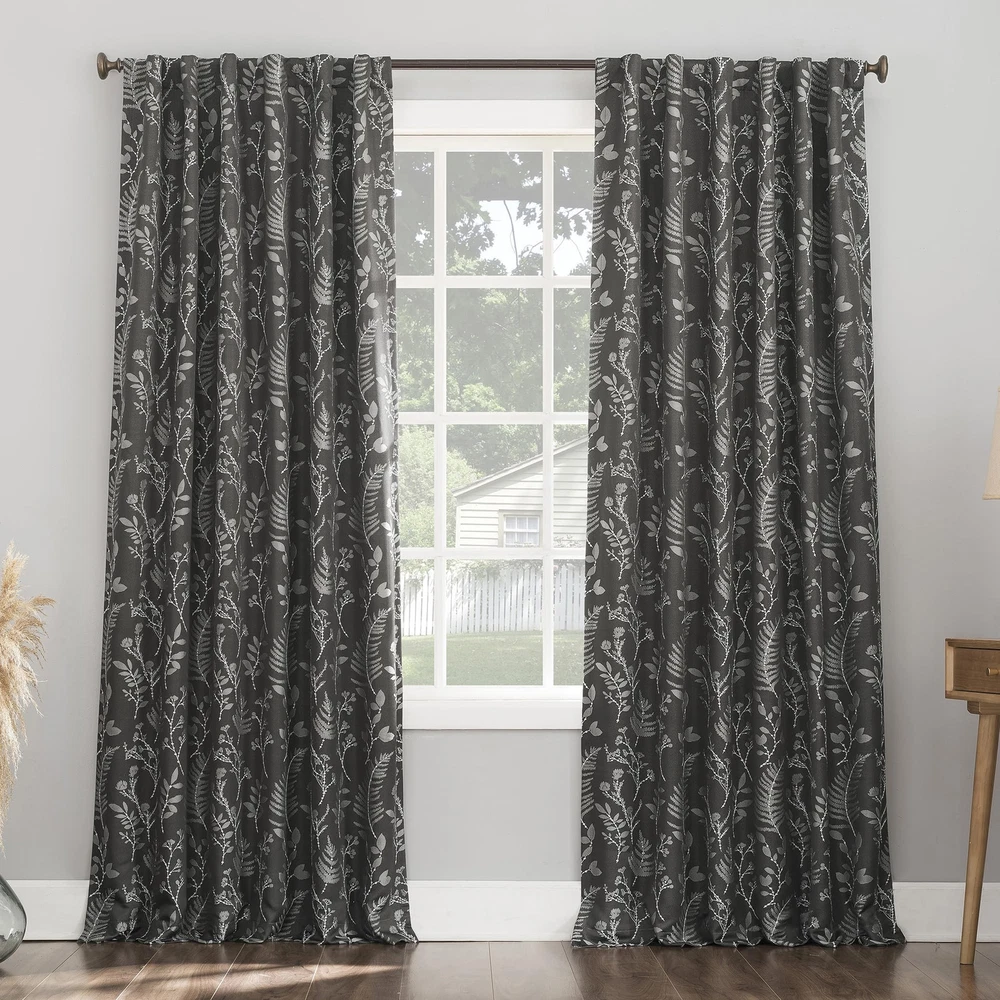 Featuring an intricately embroidered leaf pattern, Ambridge Embroidered Botanical Leaf Pleated Look 100% Blackout Back Tab Curtain Panel Pairs breathe life into any living space. Equipped with built-in metal grommets for easy hanging on standard curtain rods up to 1.5" in diameter. Extreme Blackout™ Thermal Lining is laboratory tested to block out 100% of light, reduce outside noise by up to 40%, and decrease energy lost through your windows by up to 40%. Comfort is optimized with thermal properties that help keep summer heat and winter chill out of your home. Hidden back tabs allow for easy slide-through installation on curtain rods up to 1.5" in diameter. Hang in your entertainment room to eliminate screen glare and reduce distracting outside noise, or in your bedroom for enhanced privacy and a sounder, more uninterrupted sleep. Pair includes 2 steel gray panels, each measuring 50" width by 84" length. Measure carefully before selecting your desired size and quantity. Rod not included. Machine wash cold on gentle cycle. Use non-chlorine bleach when needed. Tumble dry on low heat, using a cool iron as needed. Intricately embroidered leaf pattern adds botanical detail Extreme Thermal Blackout technology blocks out 100% of outside light Thermal properties help keep summer heat and winter chill out of your home Noise reduction up to 40% helps you get a sounder, more uninterrupted sleep Hidden back tabs fit curtain rods up to 1.5" in diameter Pair includes two (2) panels. Measure carefully prior to purchase.