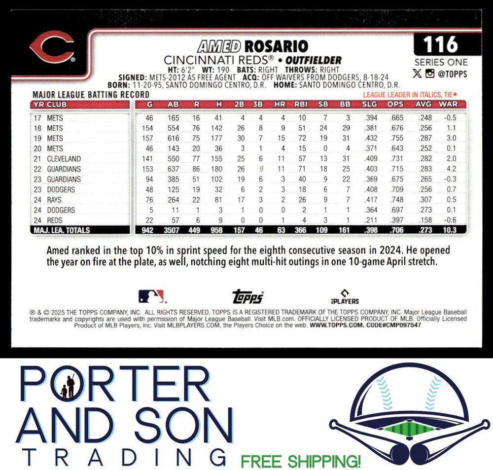 Love this Amed Rosario Reds card—clean design, sharp photo, and packed with care in a sleeve and top loader. Fast shipping with eBay Standard Envelope makes it an easy buy for any collector. Condition looks great in the scans, would definitely recommend!