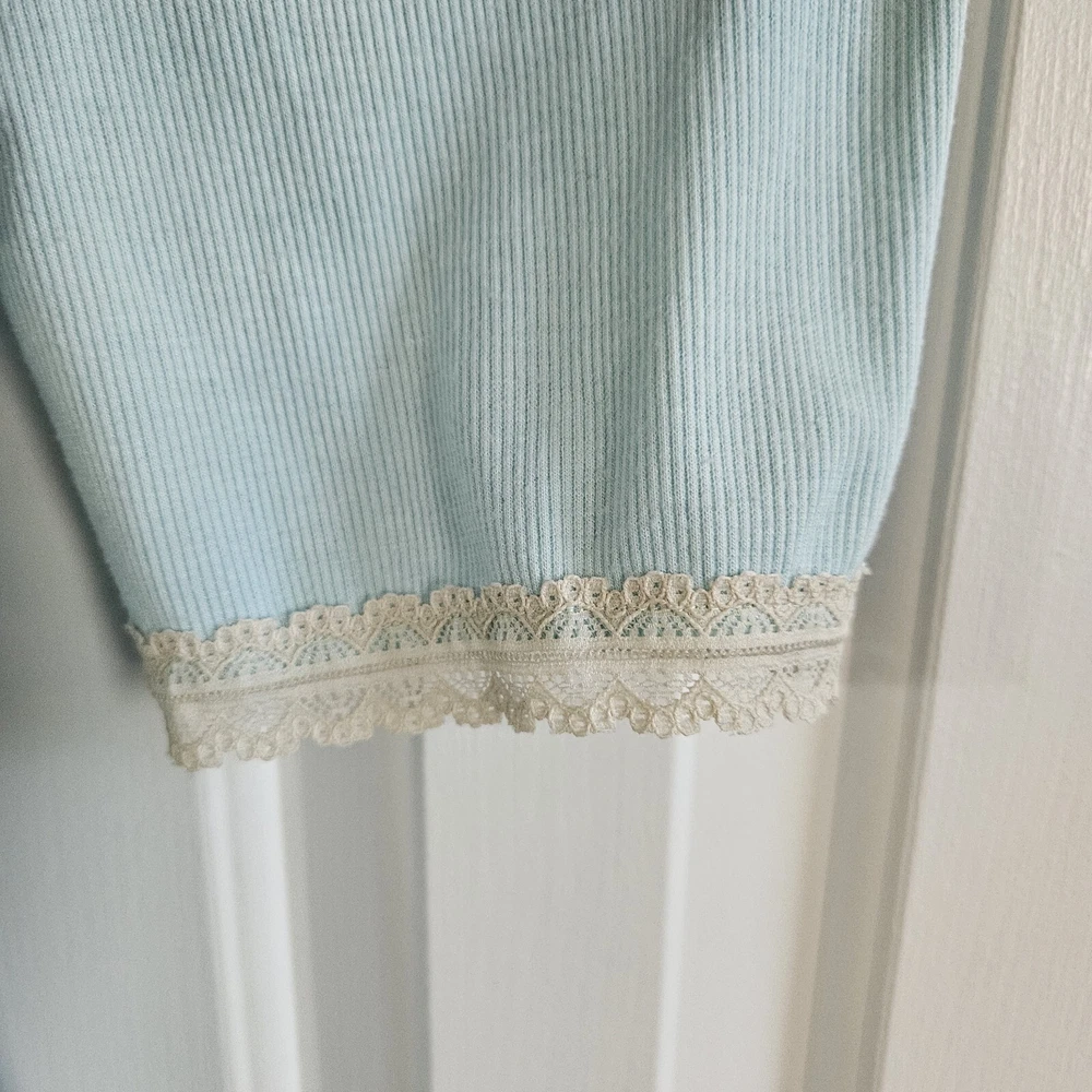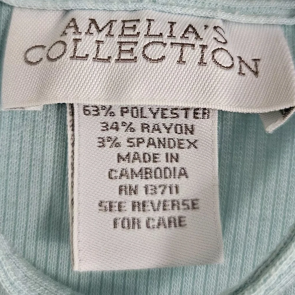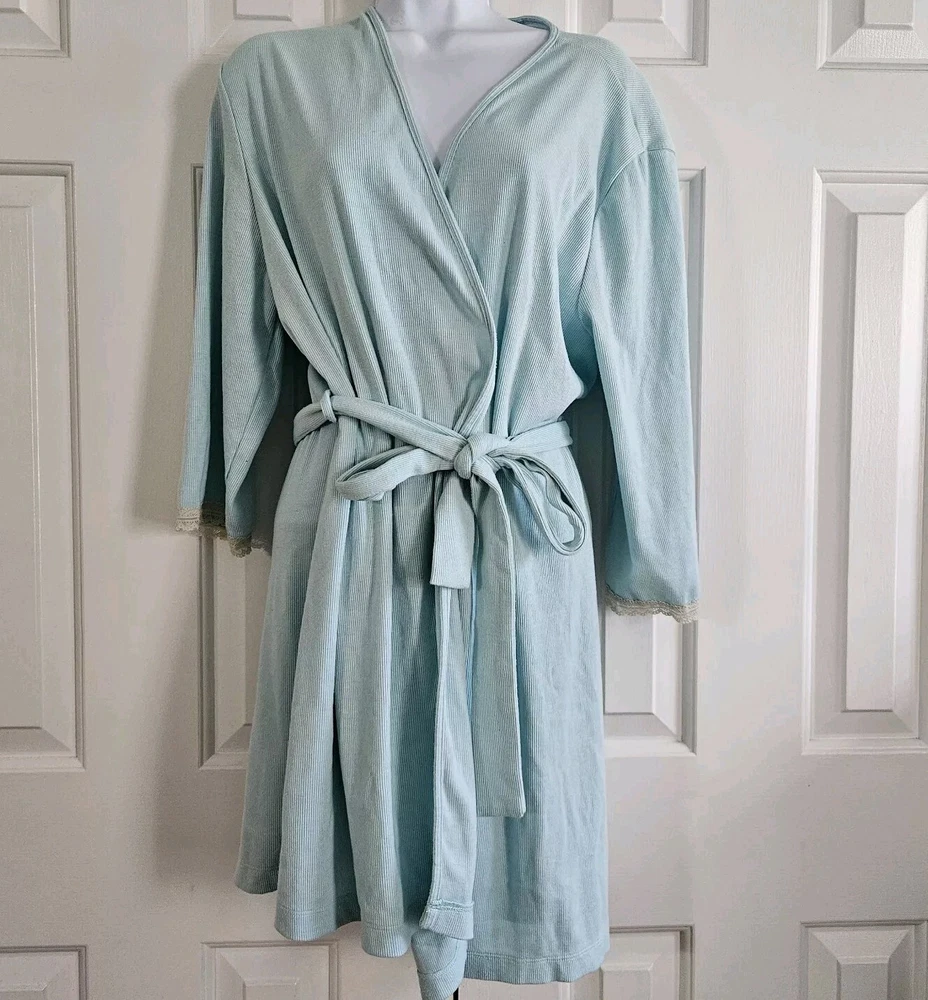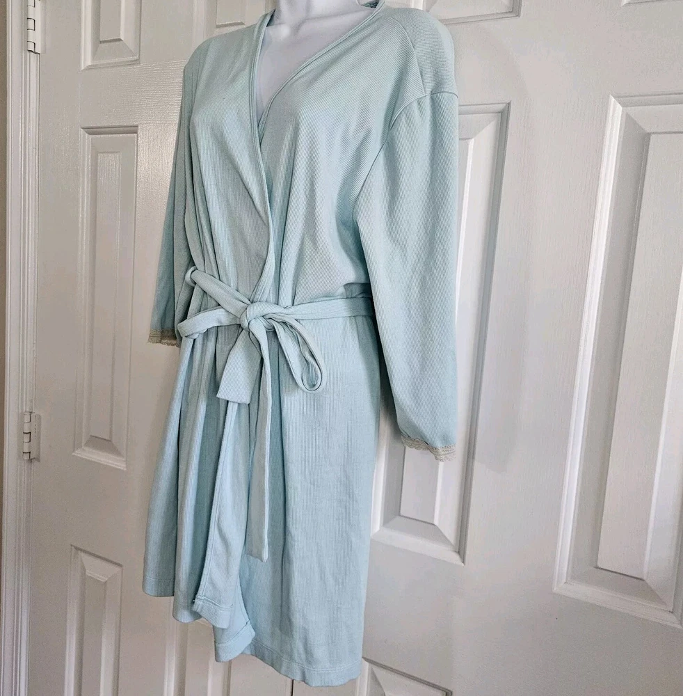 Amelia's Collection Short Robe Good pre-owned condition, no flaws 63% polyester, 34% rayon, 3% spandex, lightweight ribbed knit Color is a pastel mint green blue Ivory lace trim on sleeves Belted, belt not attached to robe Pockets at hips 3/4 Sleeves Shorter lengths, falls a few inches above knee Marked a size S/M Approximate measurements 34 inches in length from top of shoulder to bottom of hem in front