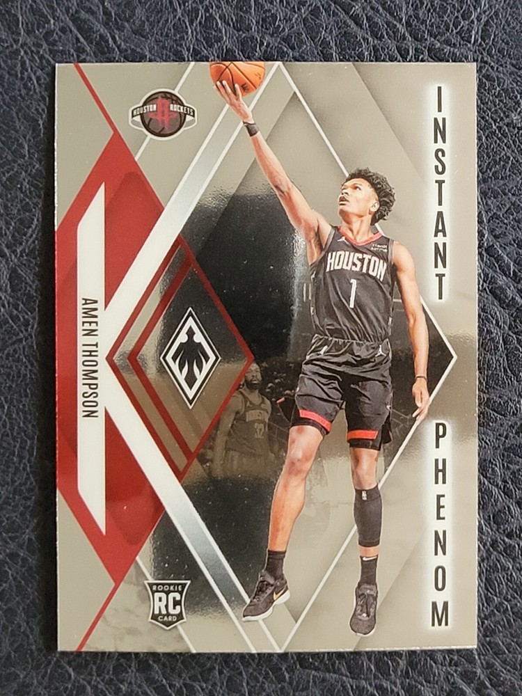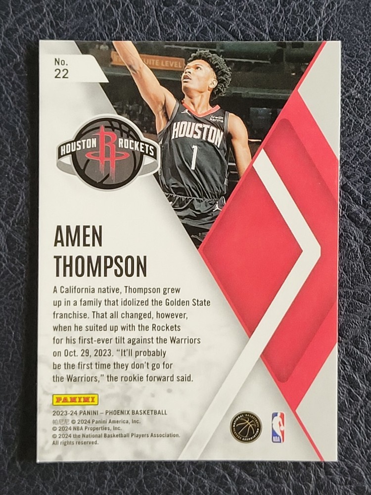 Amen Thompson 2023-24 Phoenix Instant Impact Rookie & Select Concourse 96 Rocket trading card features the player from the Houston Rockets in the NBA Finals. This sports trading card is part of the 2023-24 Panini Select and 2023-24 Panini Phoenix sets, made of card stock in English. It includes a base set and an insert, representing a rookie card with a total of 2 cards in the collection.