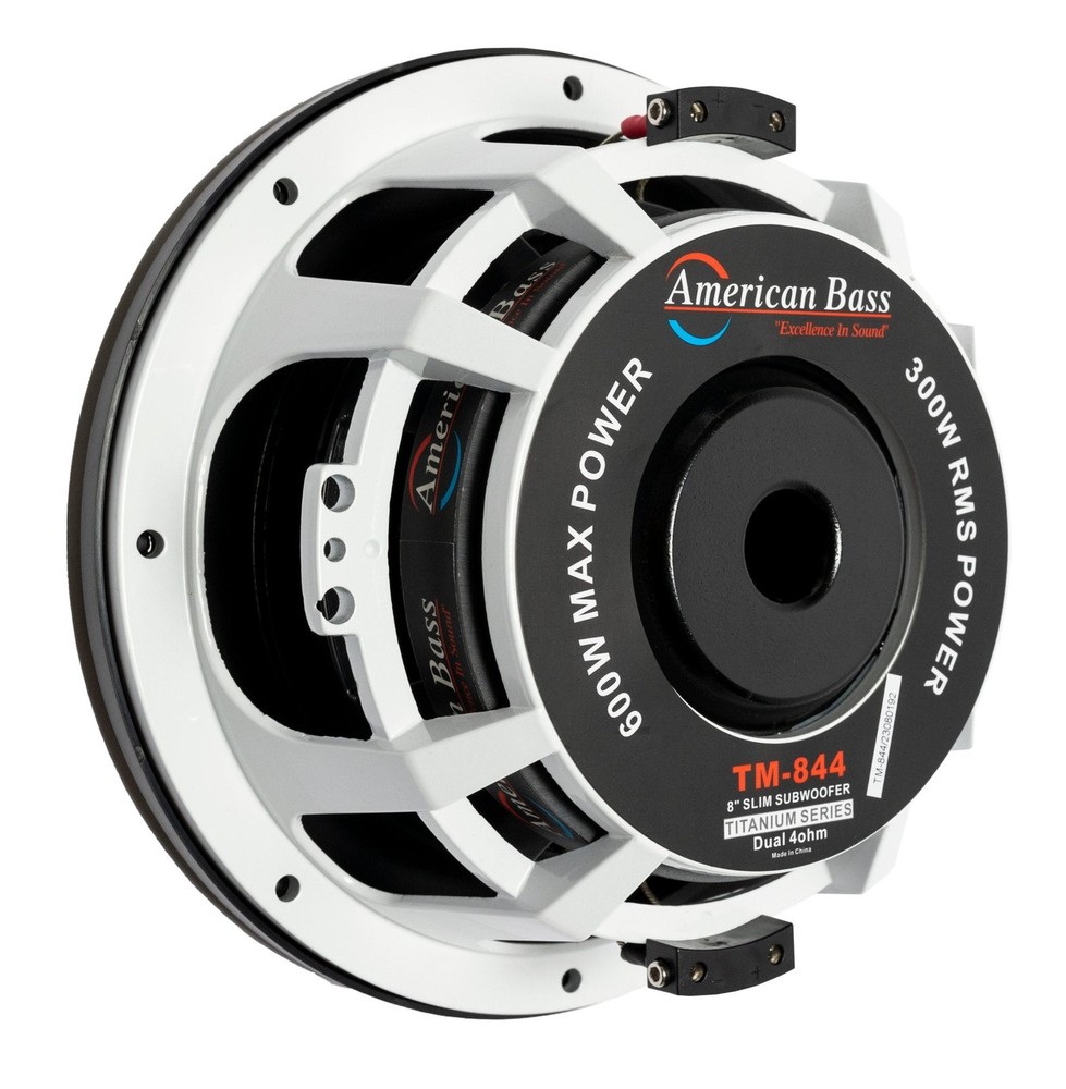 American Bass Titanium 8" Slim 600 Max Watts Car Subwoofer Revolutionize your in-vehicle audio experience with our cutting-edge Titanium Series Slim Subwoofers from American Bass. Engineered for those seeking powerful bass in limited spaces, these subwoofers redefine audio excellence in compact environments such as pickup trucks, motorcycles, and more. Transform your driving experience with the American Bass Titanium Series Slim Subwoofers. Immerse yourself in the perfect balance of form and function where space constraints meet uncompromised audio performance. Elevate your journey with precision-engineered sound, and make every drive an unforgettable auditory adventure. Upgrade to the Titanium Series today! Product Details Brand American Bass Color Black Size 8" Manufacturer VFL Product Type Subwoofer Mpn TM-844 18-inch Dual Voice Coil 4 Ohm SPL Car Subwoofer Peak Power: 1000W | RMS Power: 500W Magnet Size: 70 oz Voice Coil Size: 2.5" - Powered by