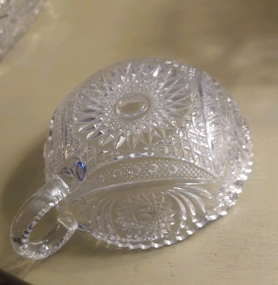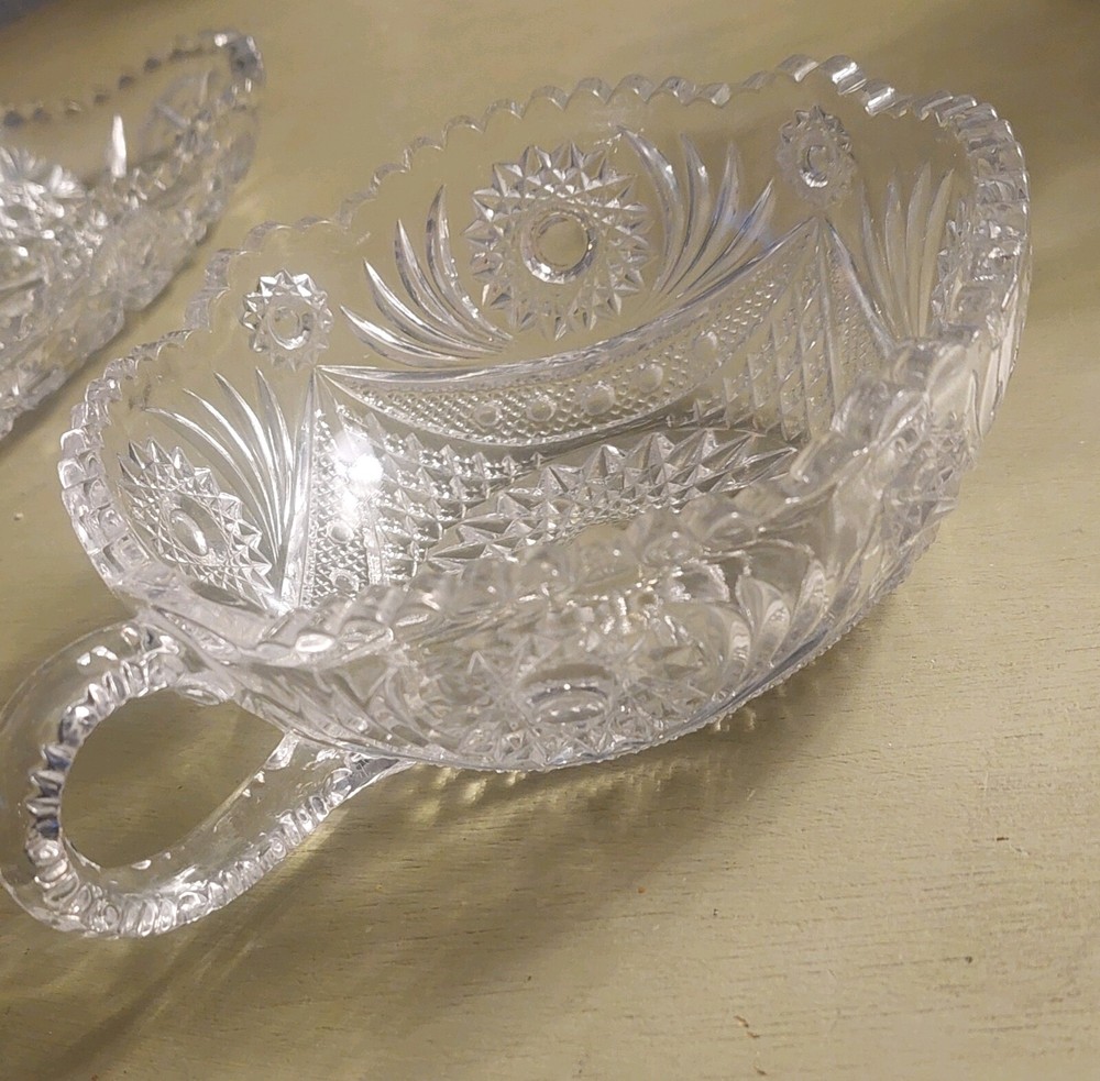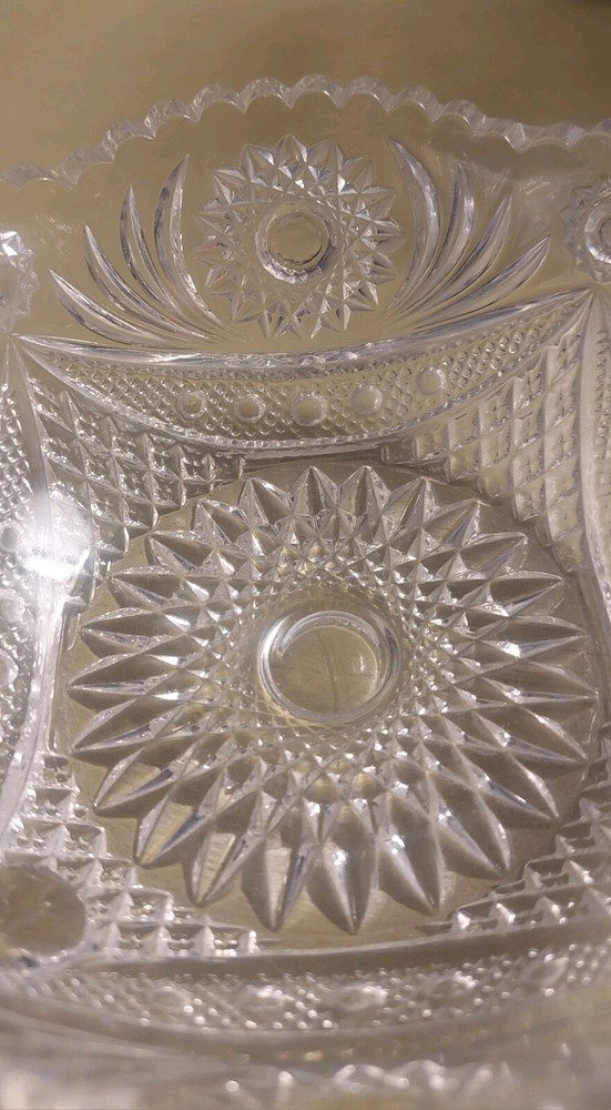This American brilliant pressed glass candy dish boasts a beautiful ruffled sawtooth edge, adding a touch of elegance to any room. The pattern is classic and timeless, making it a perfect addition to any collection. Whether serving candy or nuts or fancy up your powder room with a sparkle. #1