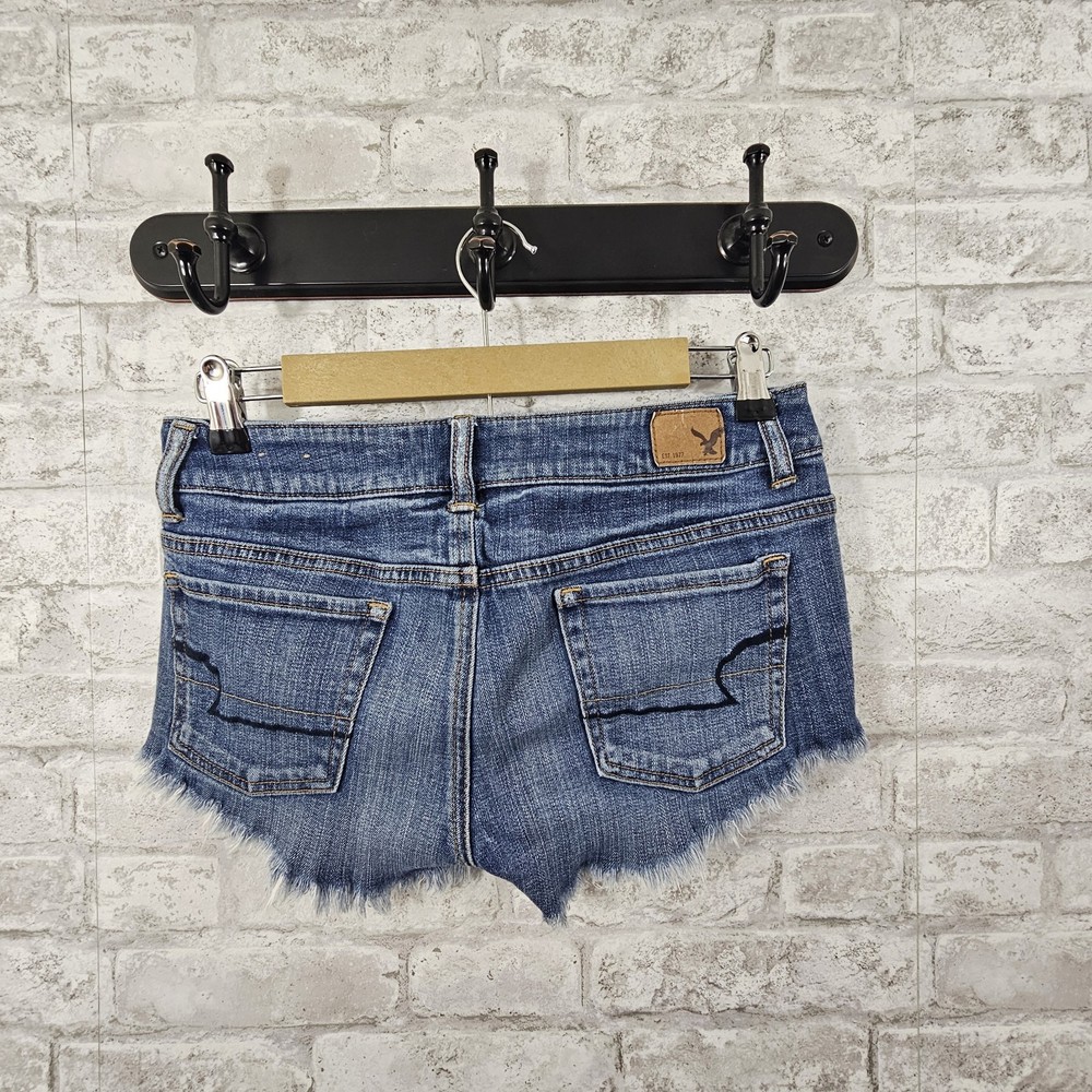 American Eagle Denim Jean Shorts Womens 0 Blue Floral Cut Off Booty Shorts Excellent pre-owned condition. No rips, tears or stains. See photos for best representation. Measures: Length 8" Waist 14.5" Inseam 2" Rise 8"