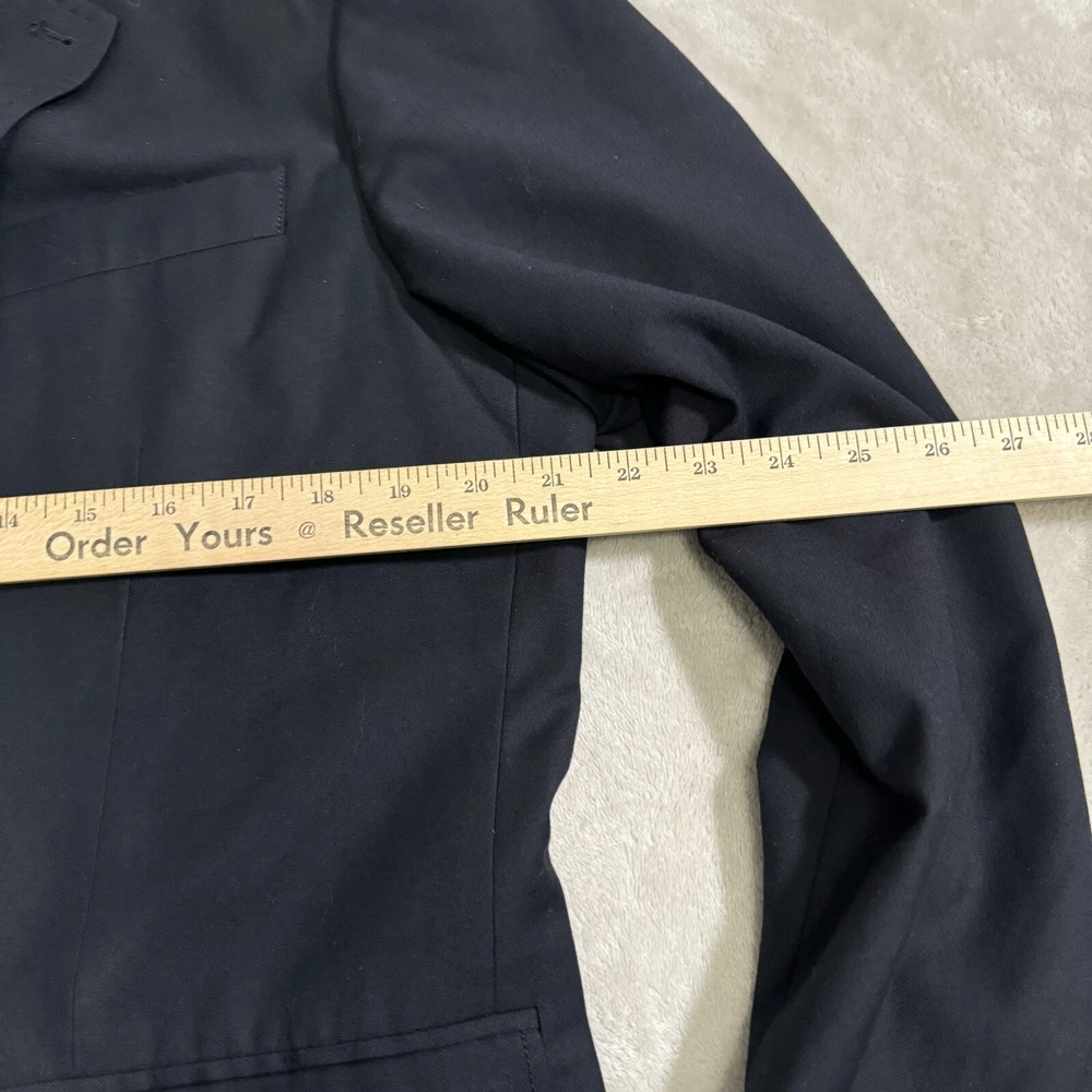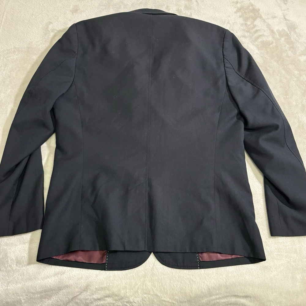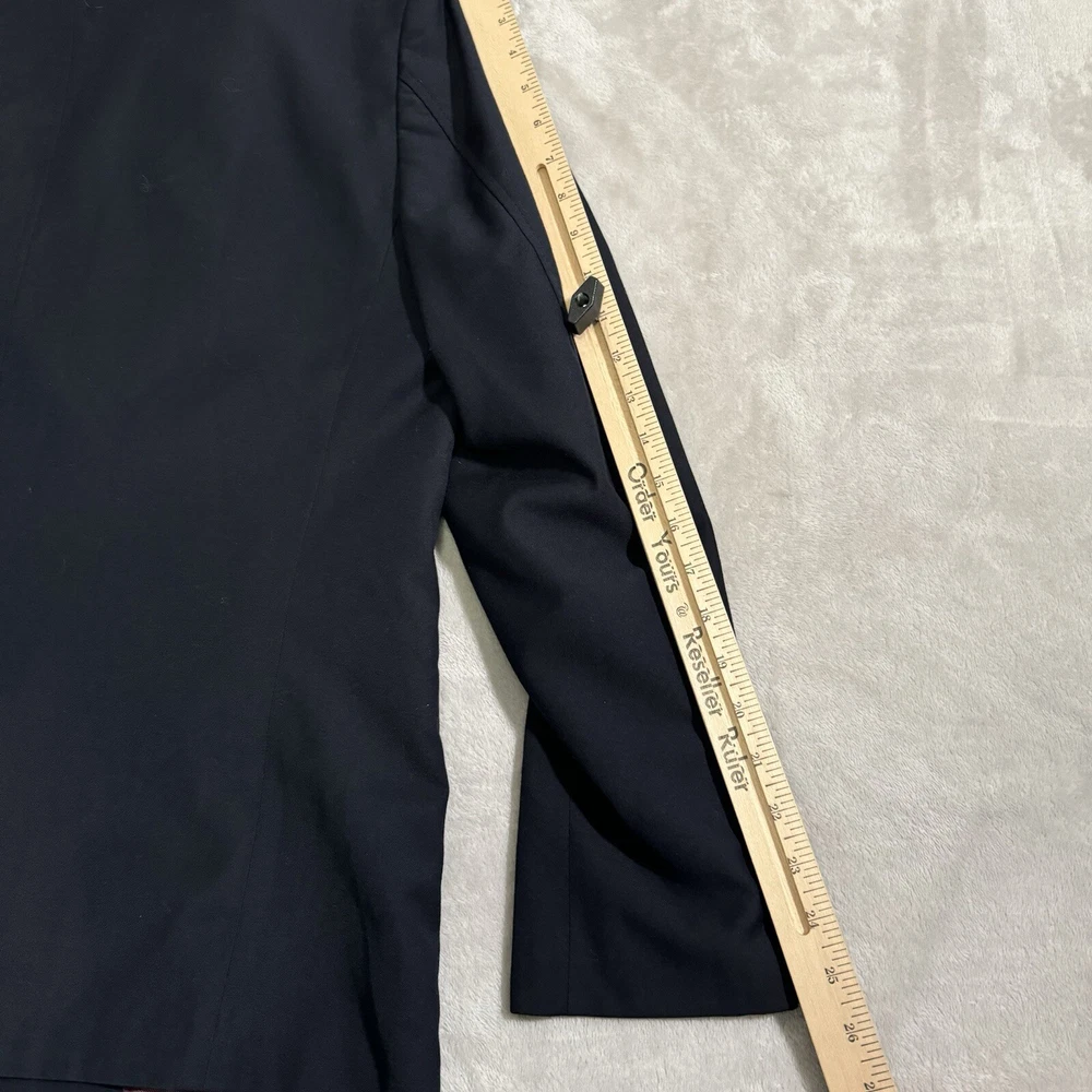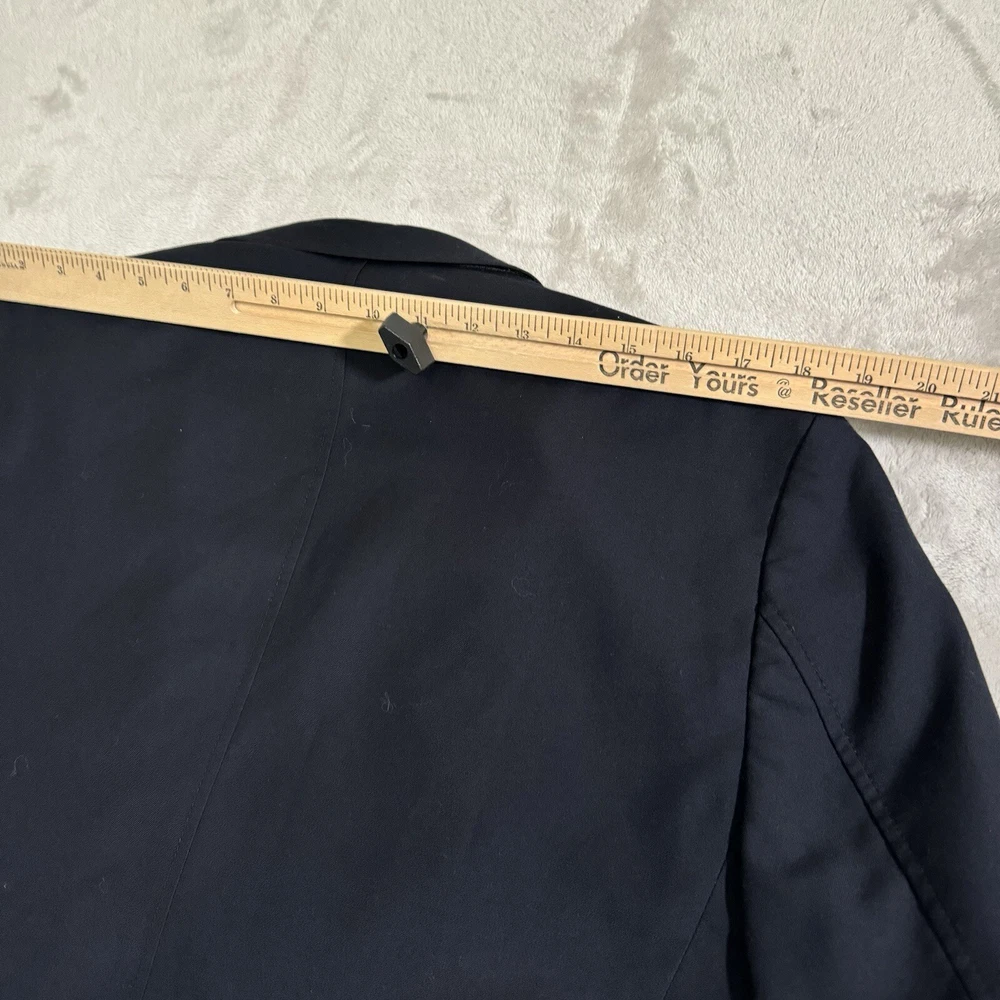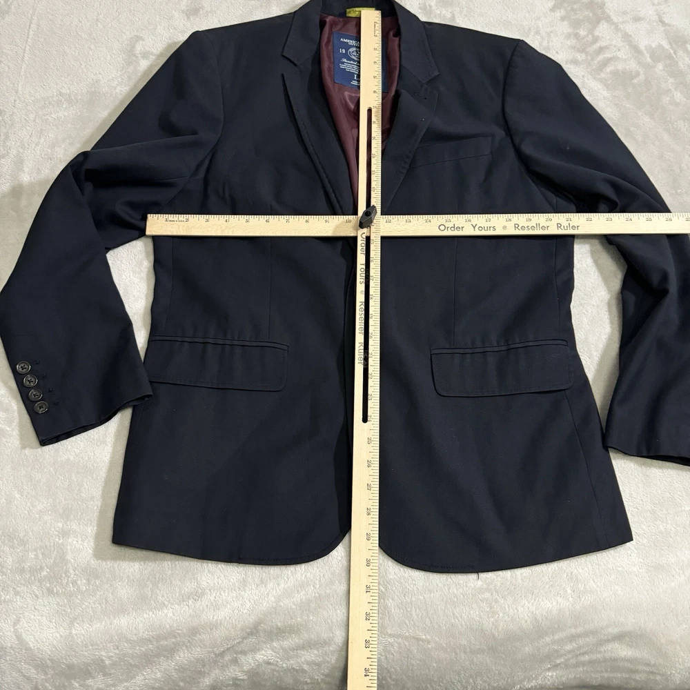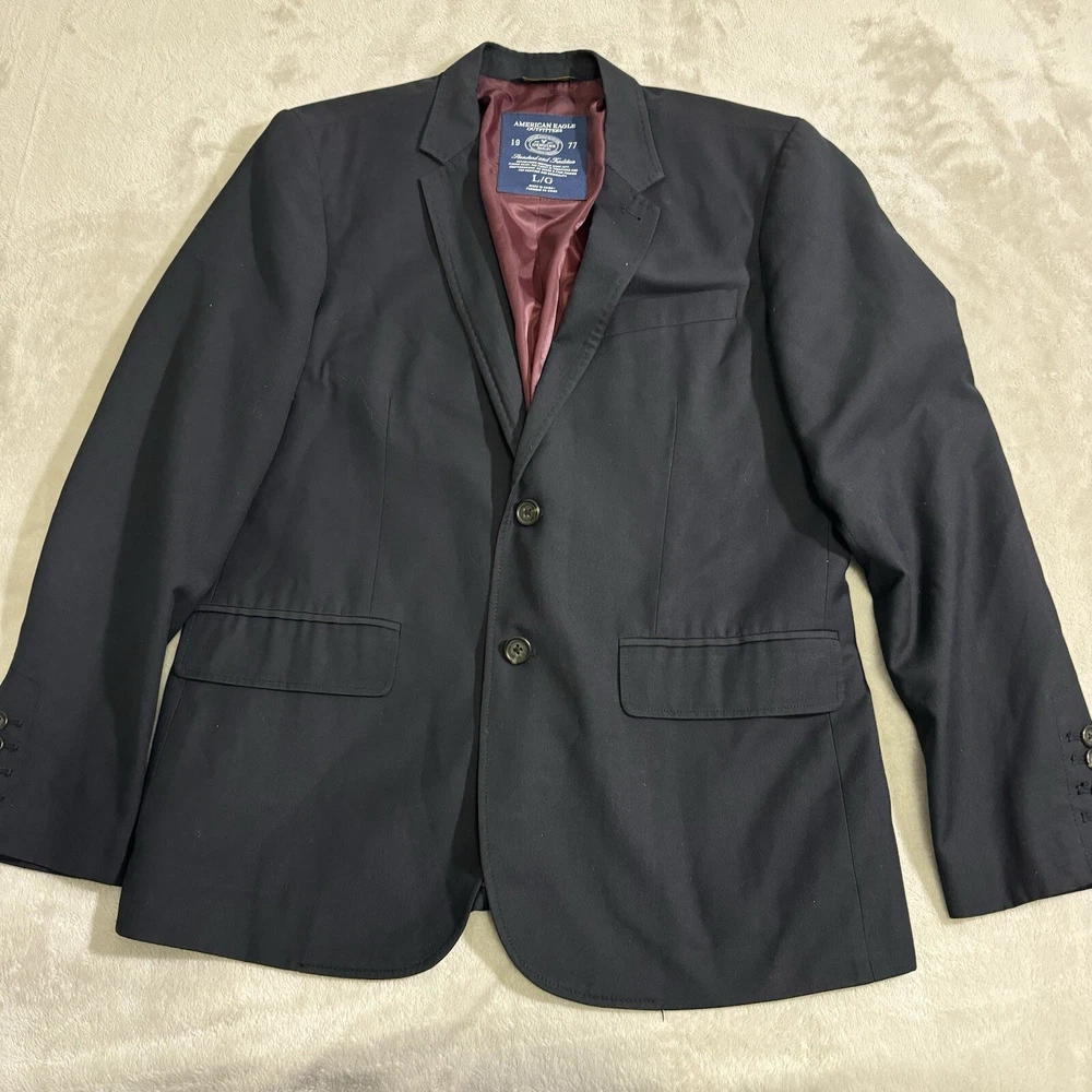 Elevate your wardrobe with this American Eagle Outfitters Legendary Blazer. The navy blue blazer is perfect for any occasion, whether it's a formal business meeting or a casual party. The jacket has a single-breasted cut with a notch lapel style and a two-button front button style. Crafted from a blend of materials, this jacket is both stylish and comfortable. The jacket is a size L and has a regular fit. The solid pattern and sports theme make this blazer a versatile addition to any wardrobe. Whether you're hitting the town or attending a wedding, this blazer will make you look sharp and confident.