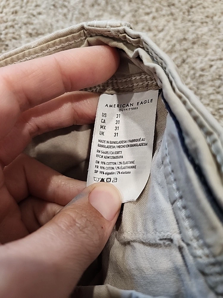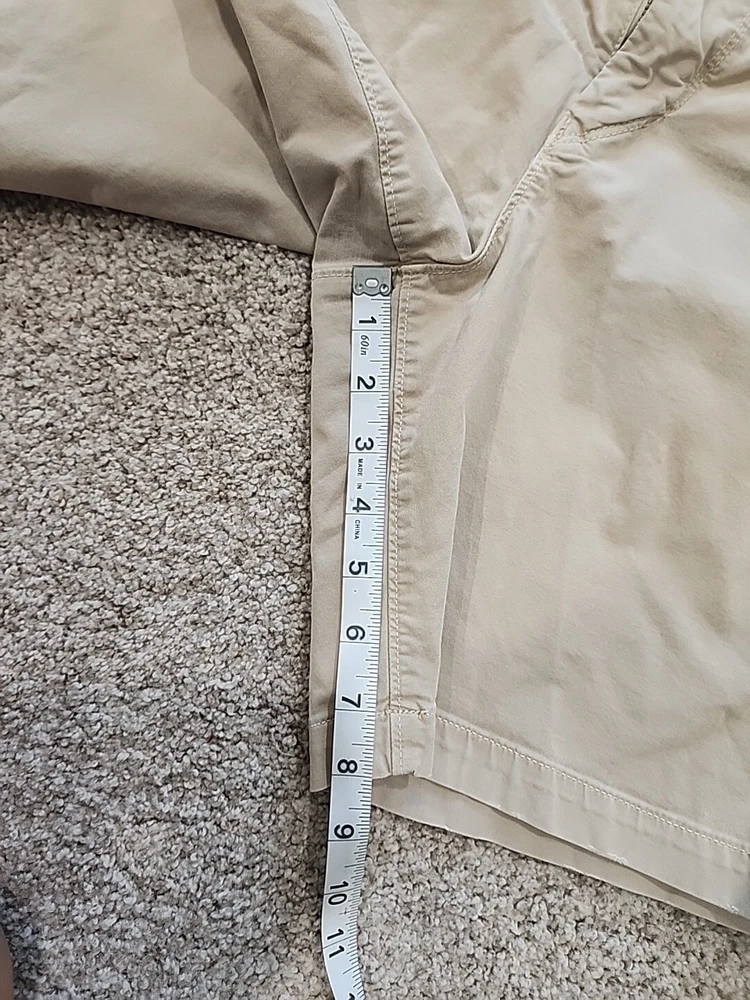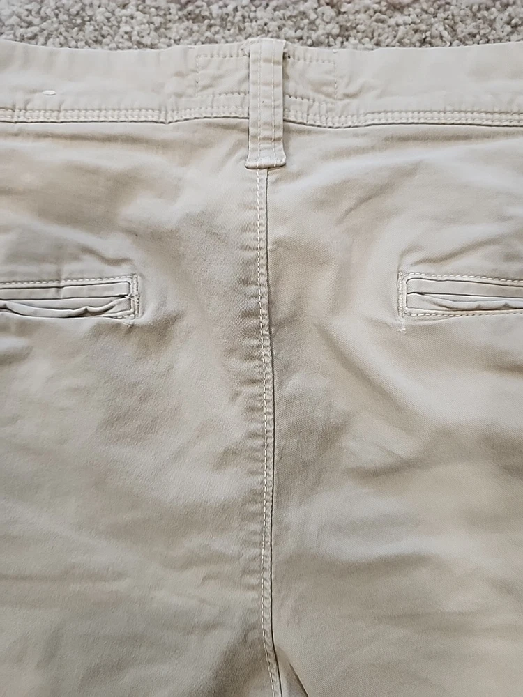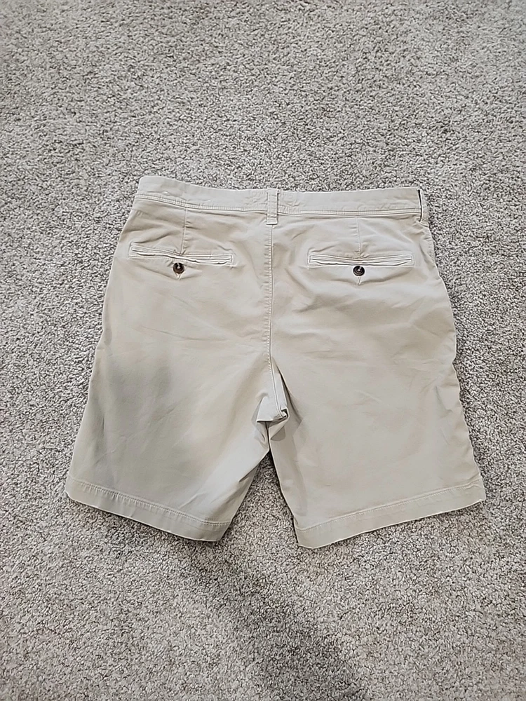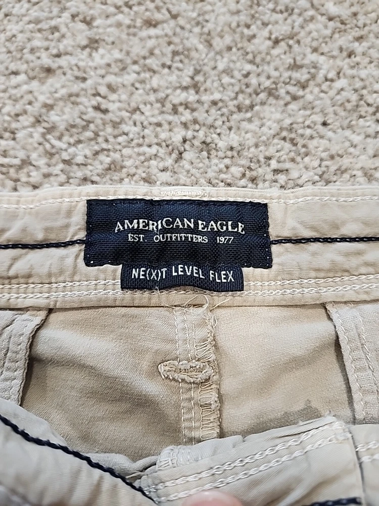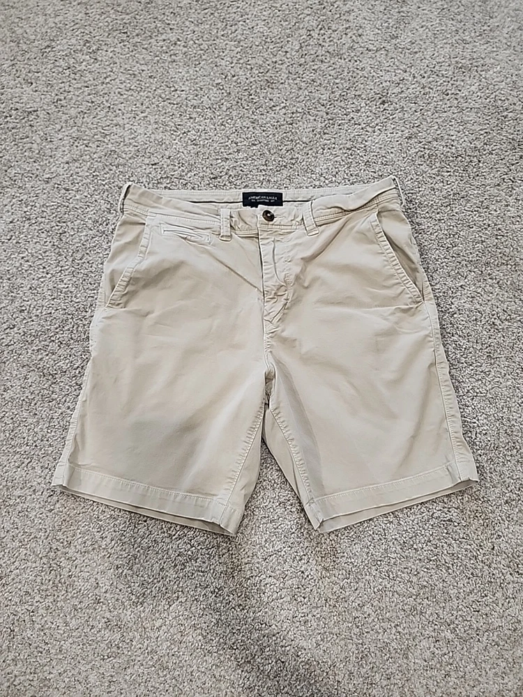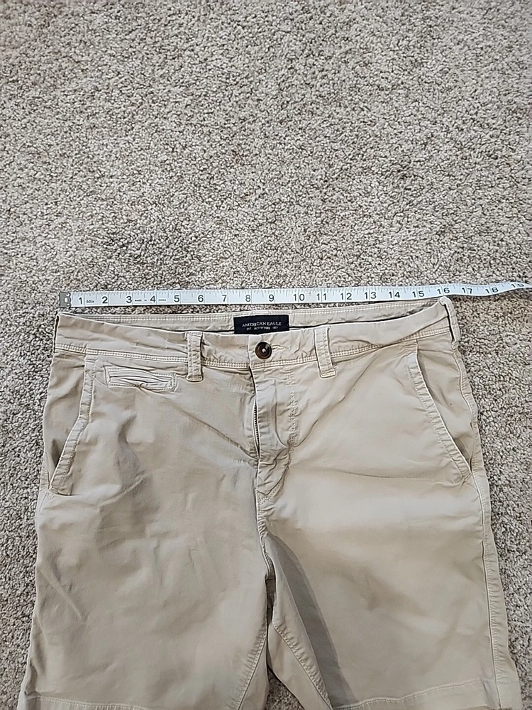 Shorts in great condition with no stains. Slight wear on back pockets, see photos Measurements on photos. These American Eagle khaki shorts are designed for men with a waist size of 31 inches. They feature a solid pattern, zipper closure, and a flat front style. Made from a cotton blend fabric, these chino shorts are perfect for the summer, fall, and spring seasons. The shorts also have a convenient 8-inch inseam and pockets for added functionality. Perfect for a preppy American style look, these shorts are easy to care for and suitable for everyday wear.